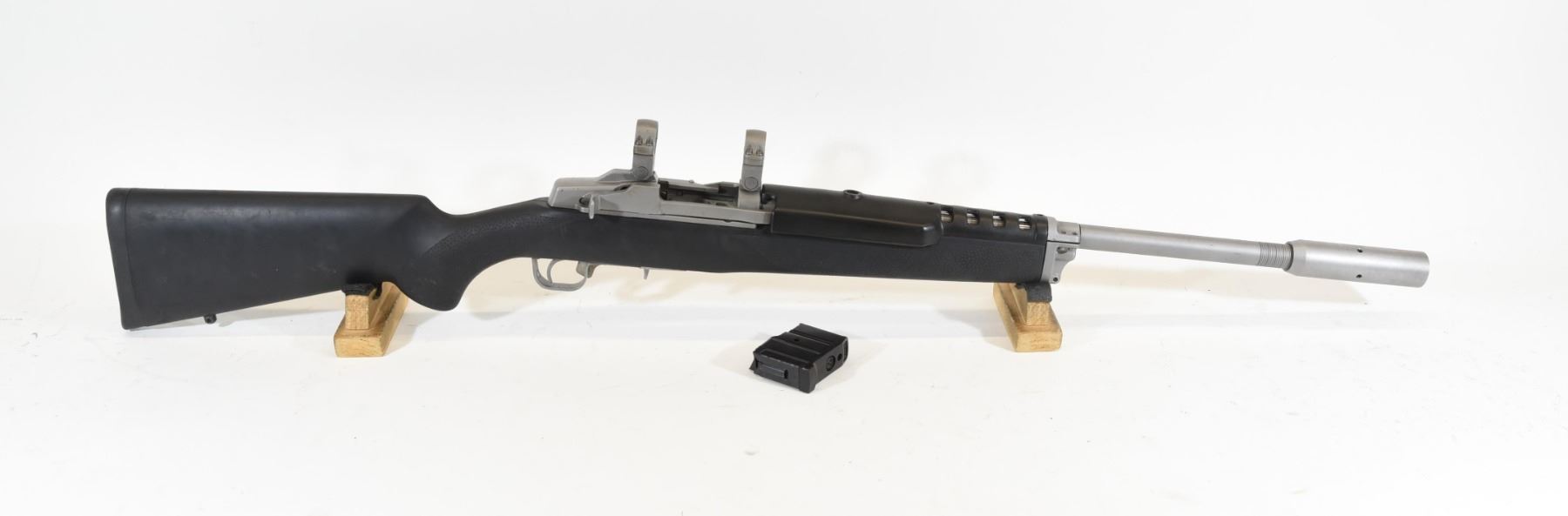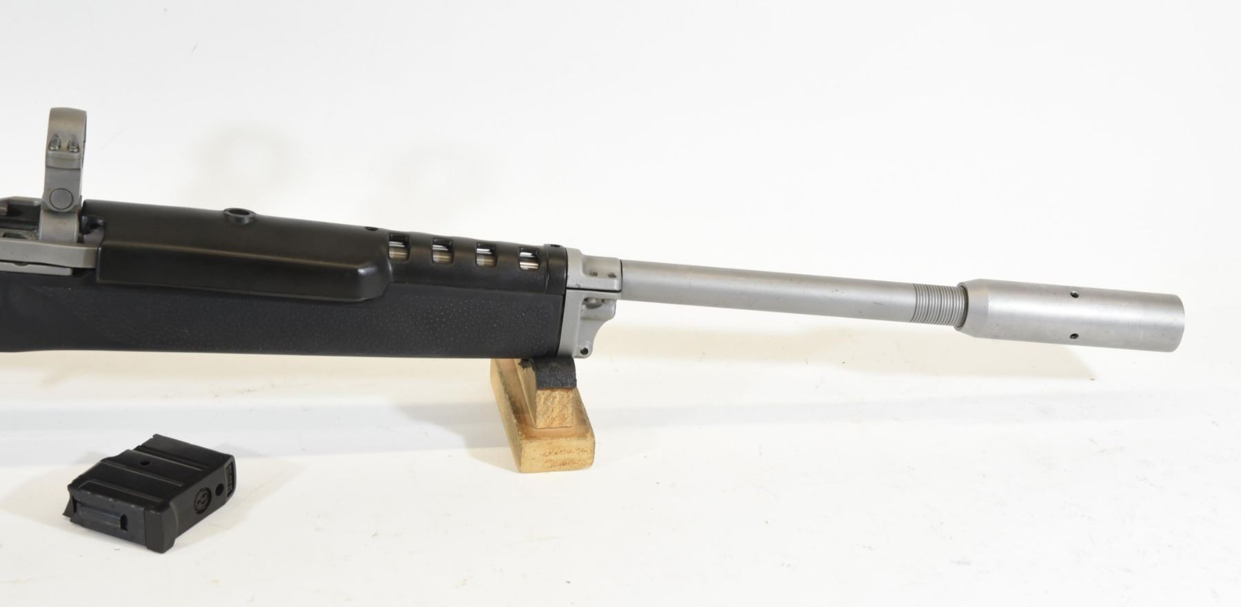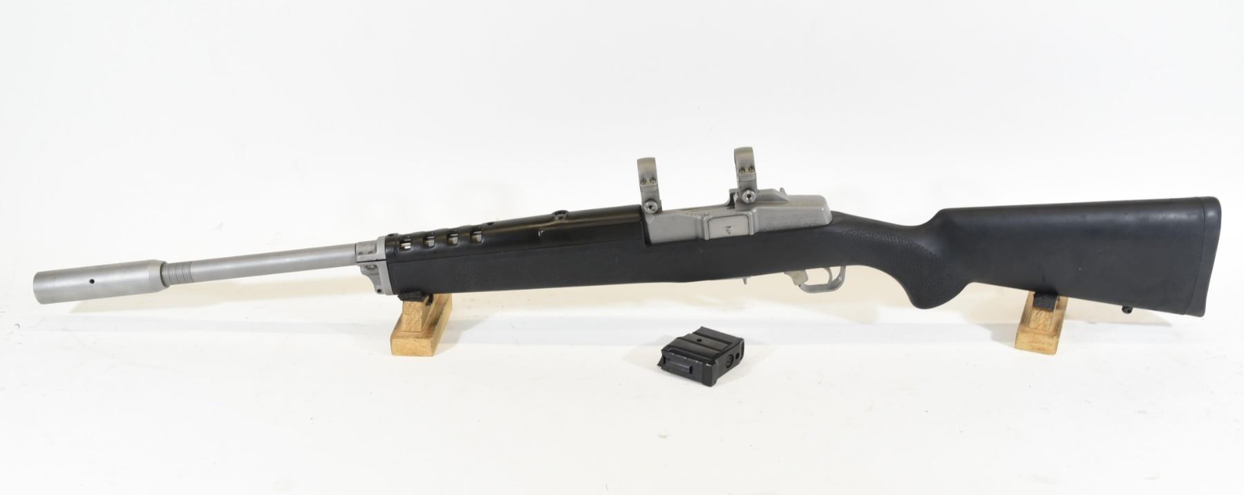Non-restricted, semi-auto, 223 Rem, 22" barrel with harmonic balancer, SN 58046395. Hogue stock has a few marks, stainless barrel & frame has some pit marks, bore excellent.