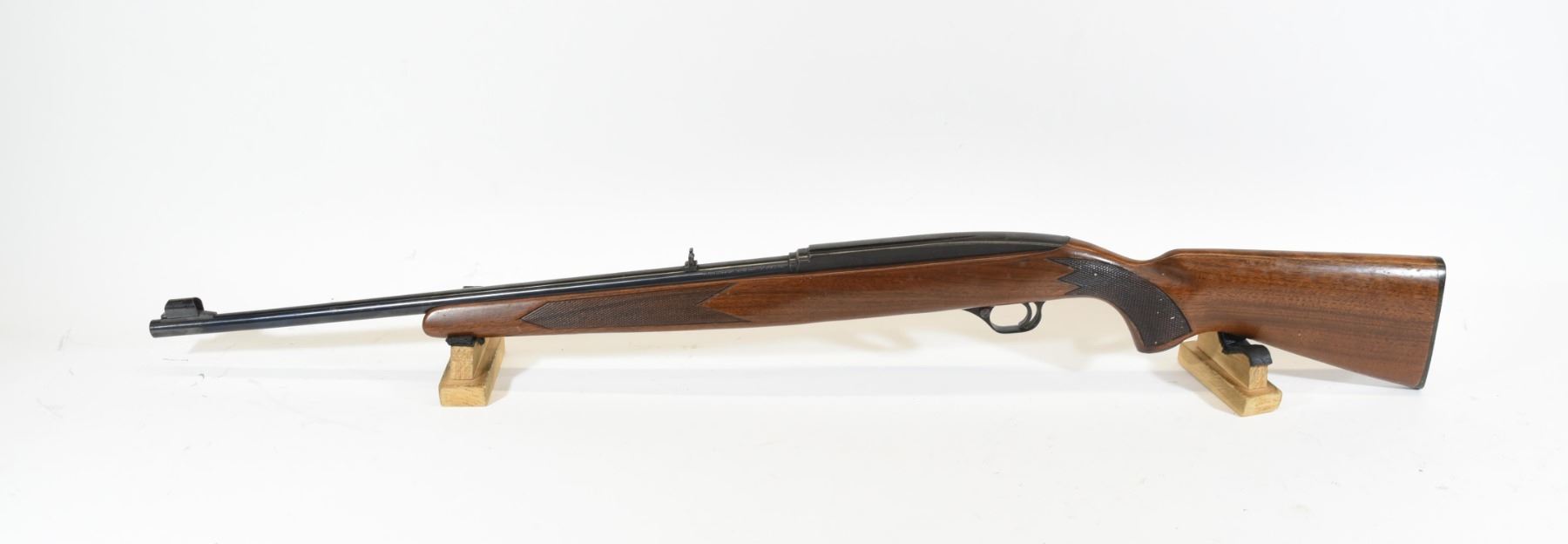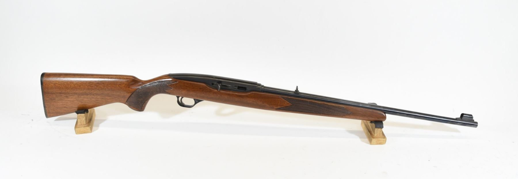 Non-restricted, semi-auto, 22 LR, 22" barrel, SN J030184. Wood has light scratches and a few marks, bluing turning grey with some pit marks on barrel, bore has a ring mark and bulge 6" from muzzle.