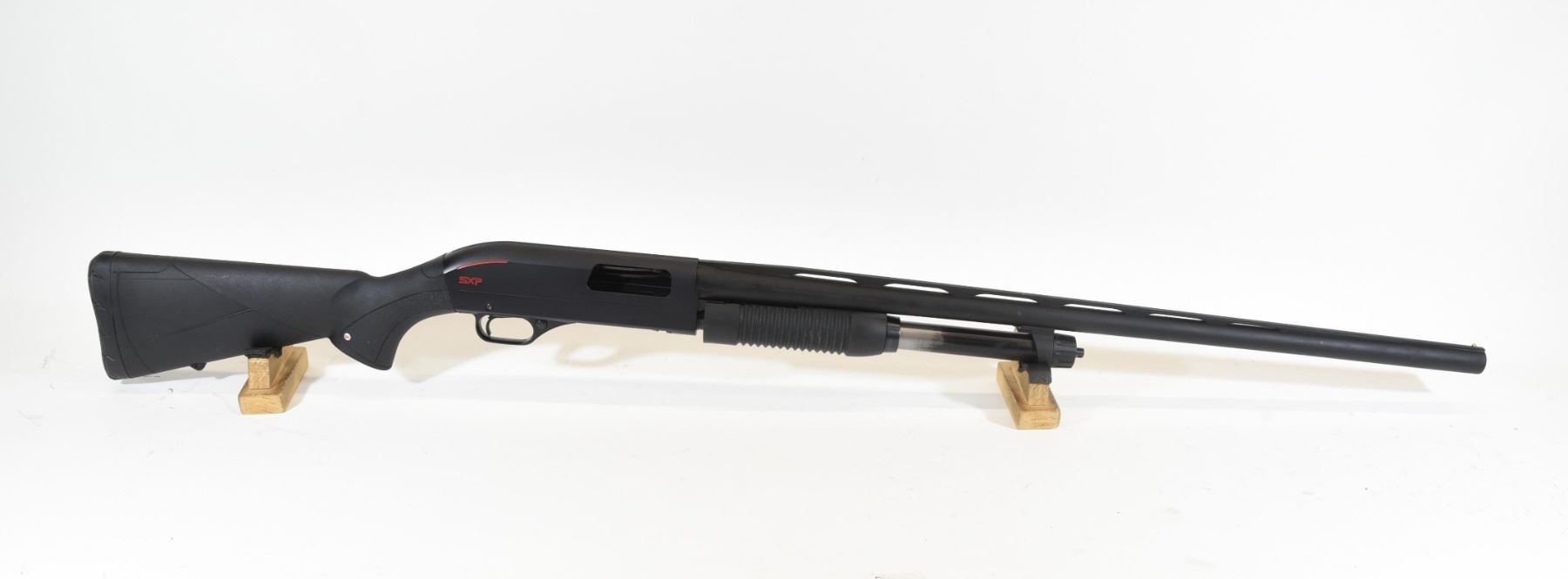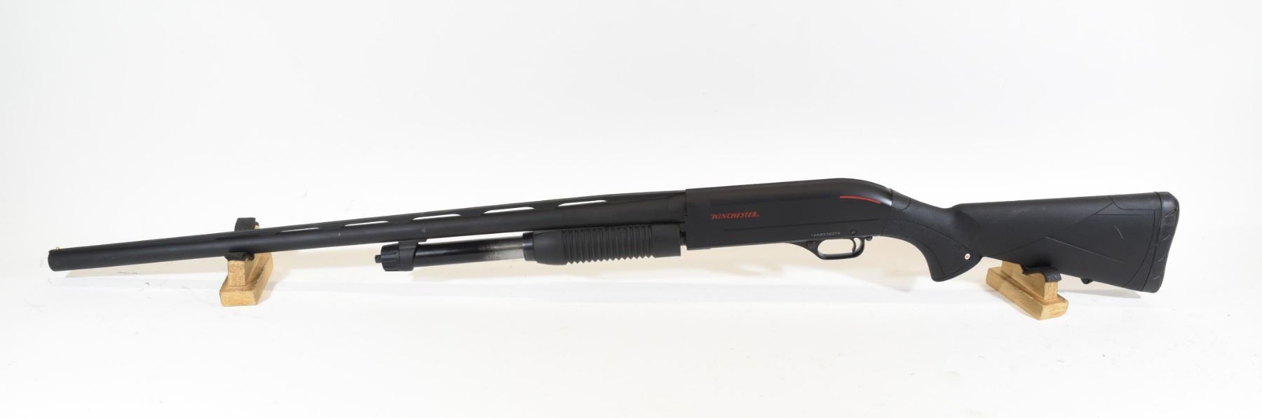 Non-restricted, pump action, 12 Ga x 3", 28" barrel with removable IC choke, SN 12A2X38279. Synthetic stock very good, matte bluing has a couple of marks.