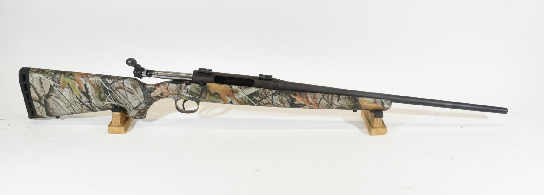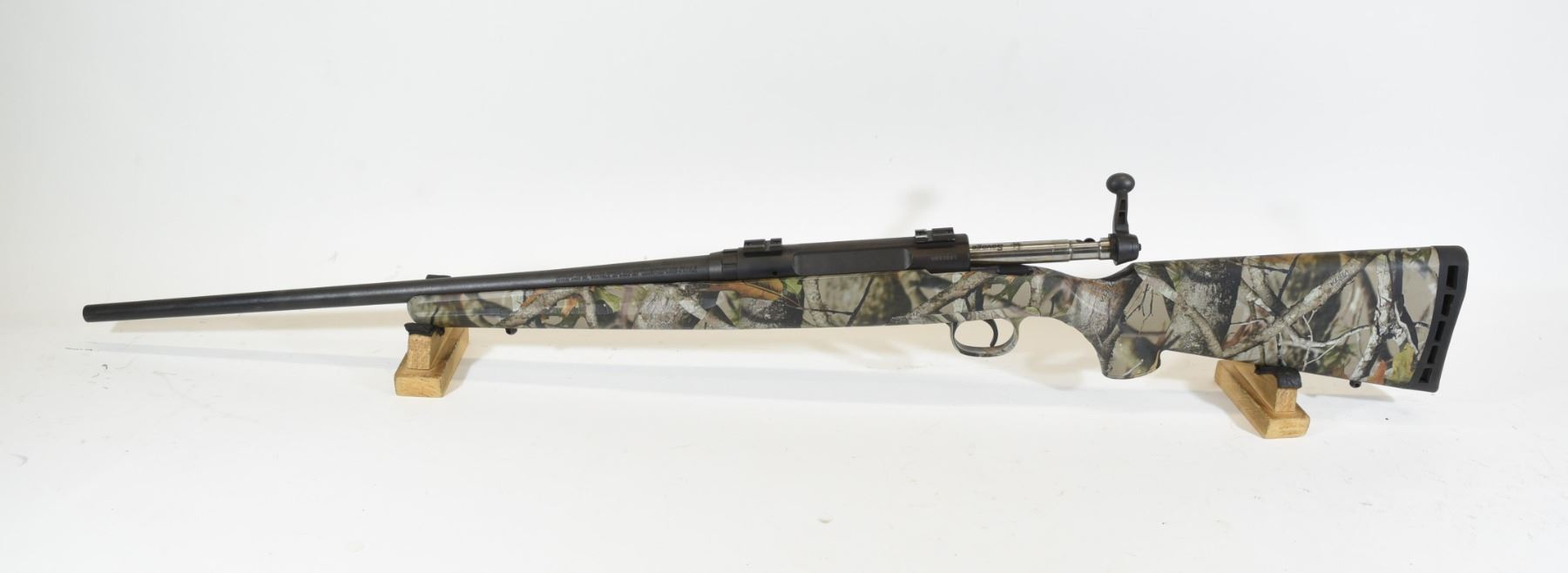 Non-restricted, bolt action, 30-06 Sprg, 22" barrel, SN H093885. Camo synthetic stock has some scratches, matte metal finish has a couple marks, bore excellent.