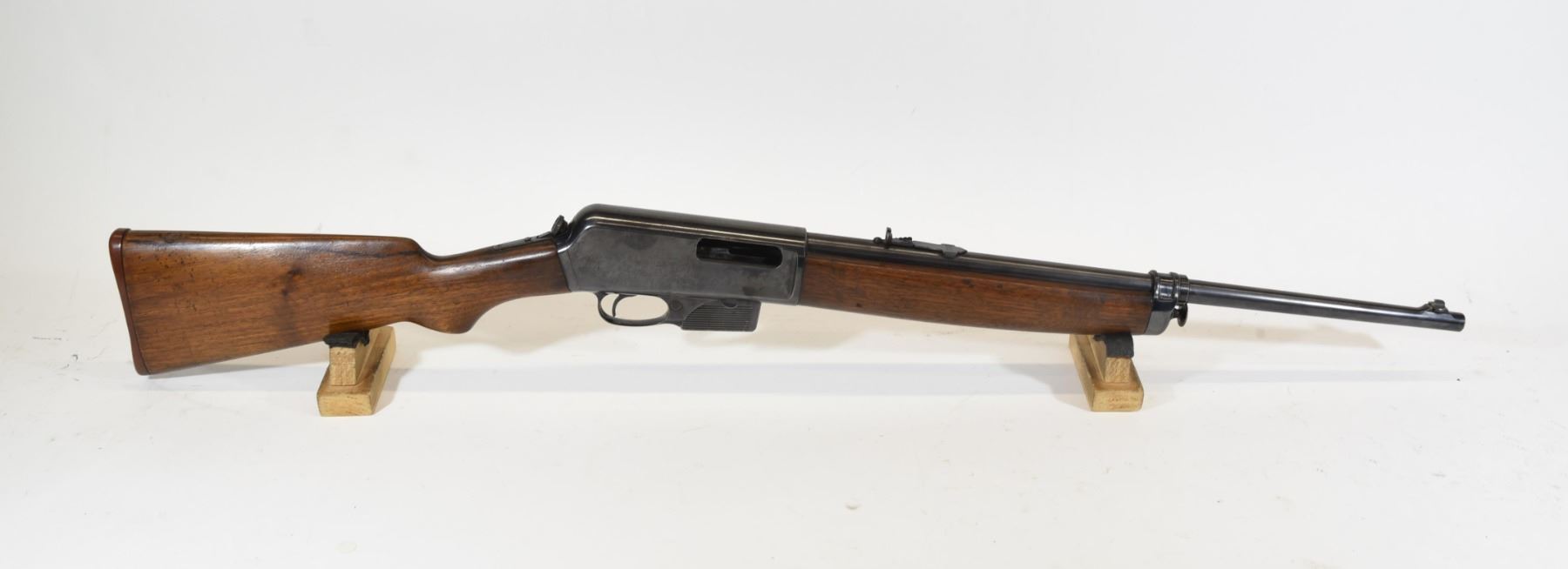 Non-restricted, semi-auto, 401 Win SL, 20" barrel, SN 18113. Wood has a gouge and a couple dents, crack in forearm, bluing is turning grey with some scratches, bore very good.