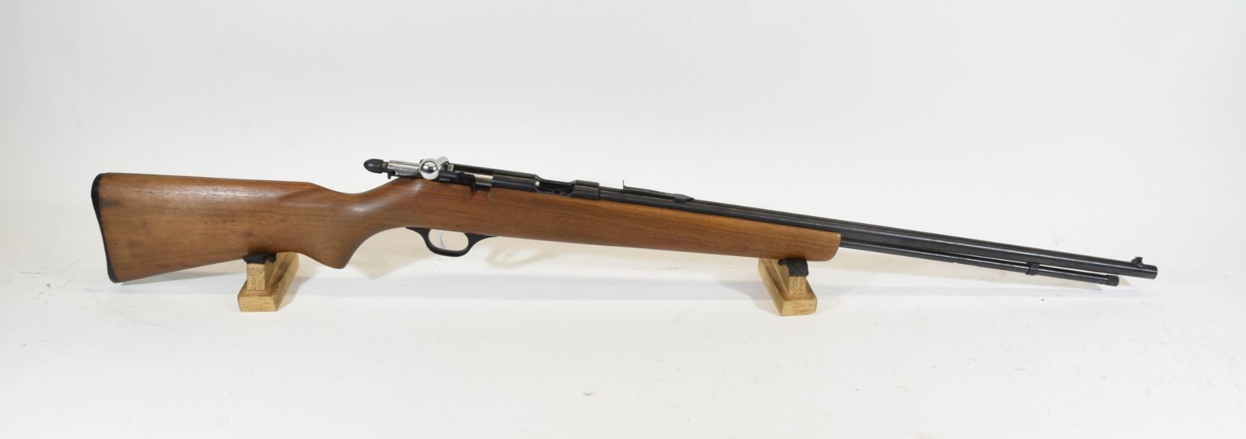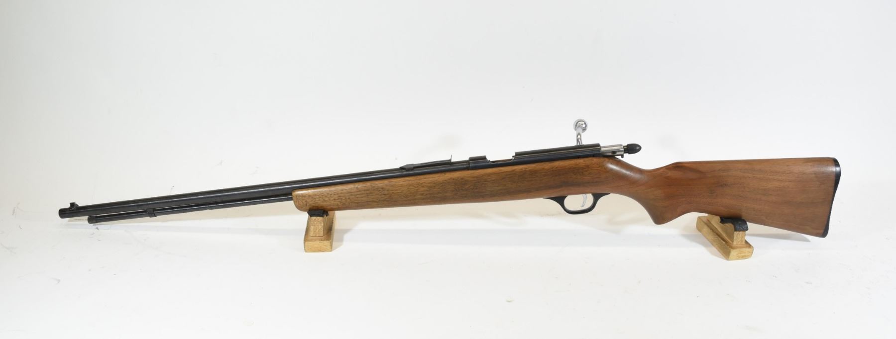 Non-restricted, bolt action, 22 LR, 24" barrel, SN none. Wood has a few marks, bluing lightly pitted all over, bore excellent.