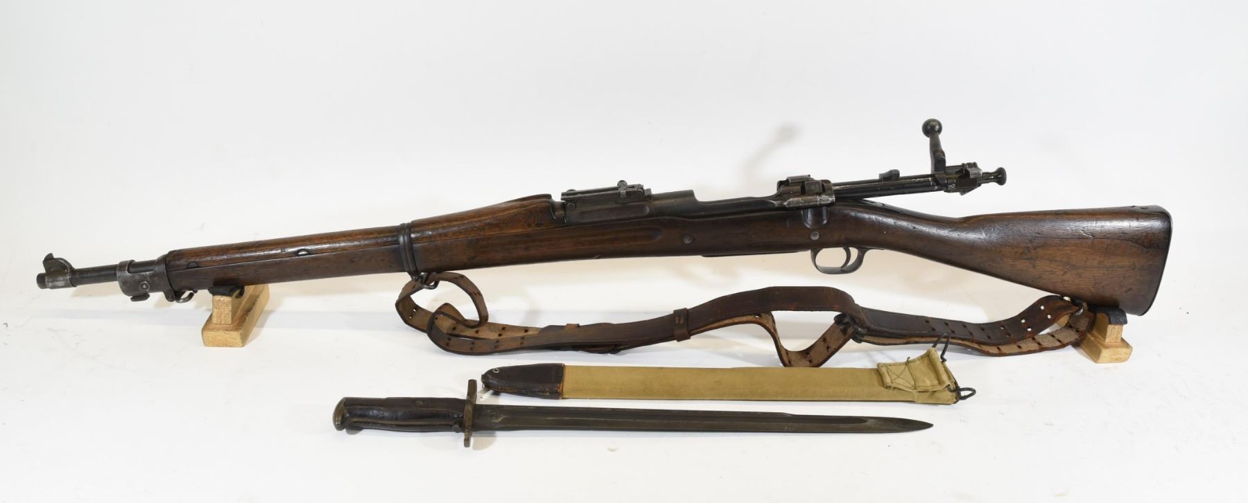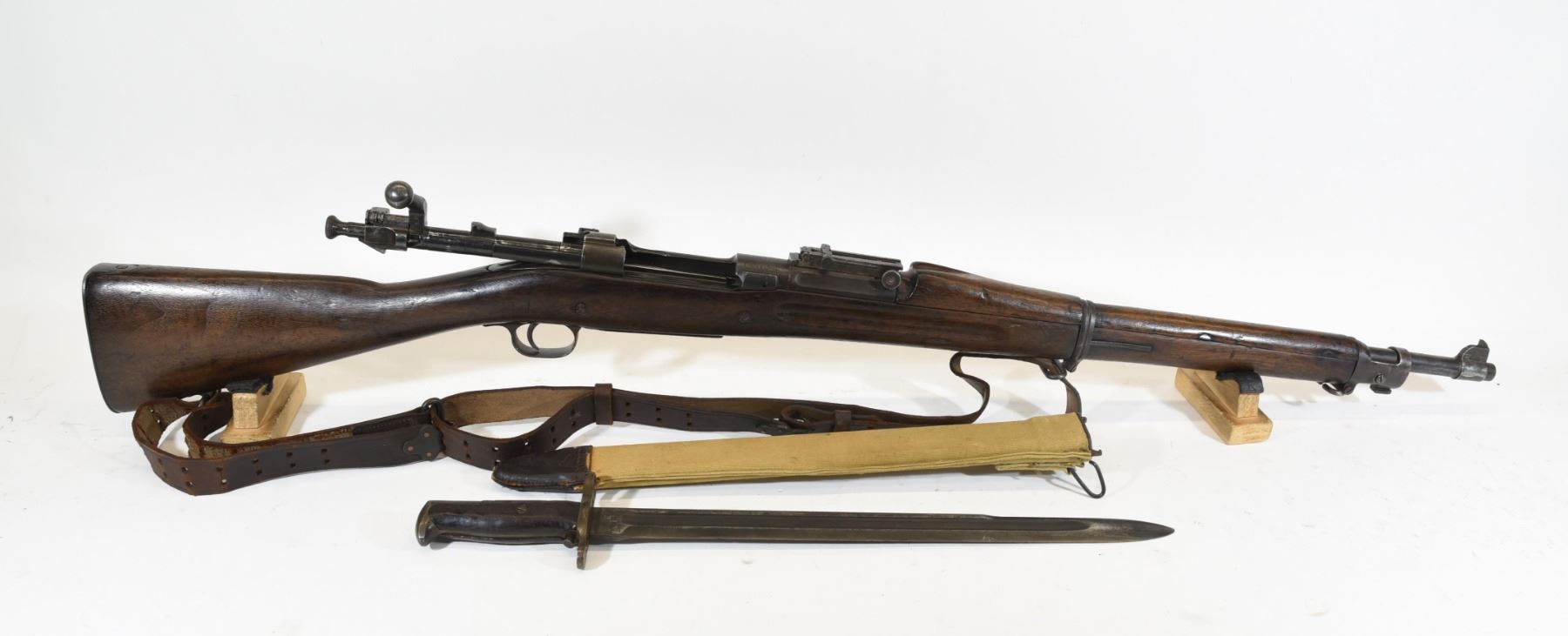Non-restricted, bolt action, 30-06 Sprg, 24" barrel, SN 1447342. Wood has numerous dents and marks, bluing is worn and grey, bore has pitting. Comes with bayonet and sheath SN 1002811.