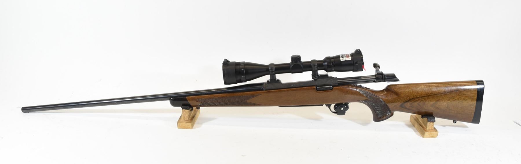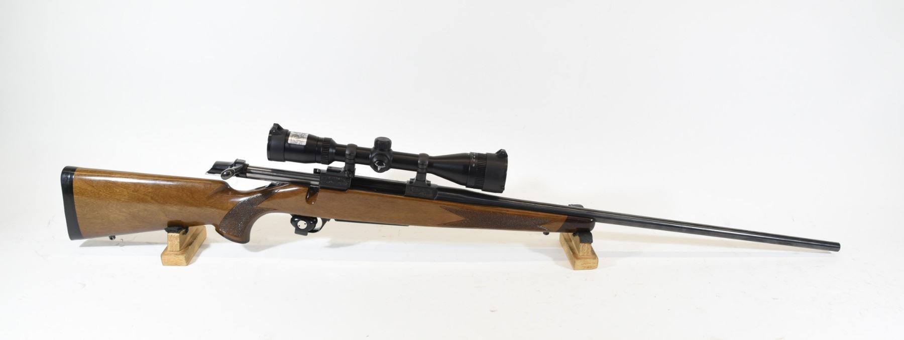 Non-restricted, bolt action, 338 Win Mag, 25 1/2" barrel, SN 29504NM217. Wood has a couple small dents and somr scratches, bluing has some marks on barrel, bore excellent. Comes with Bushnell 4-12 x 50 AO scope.