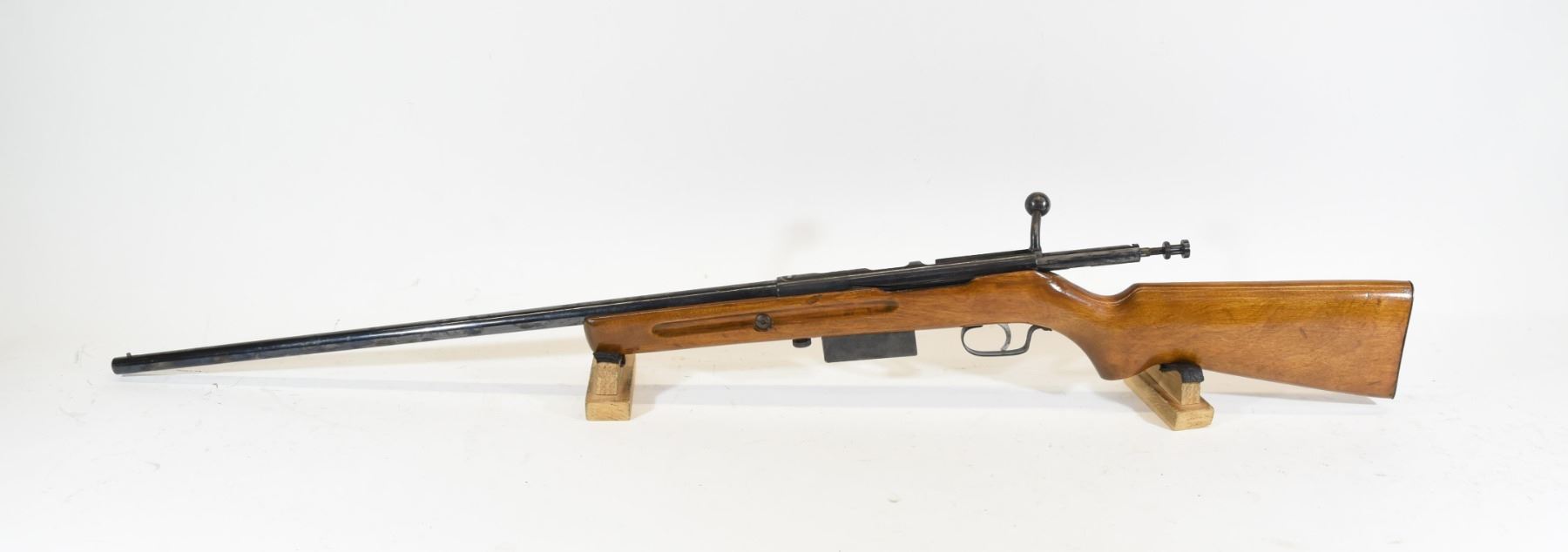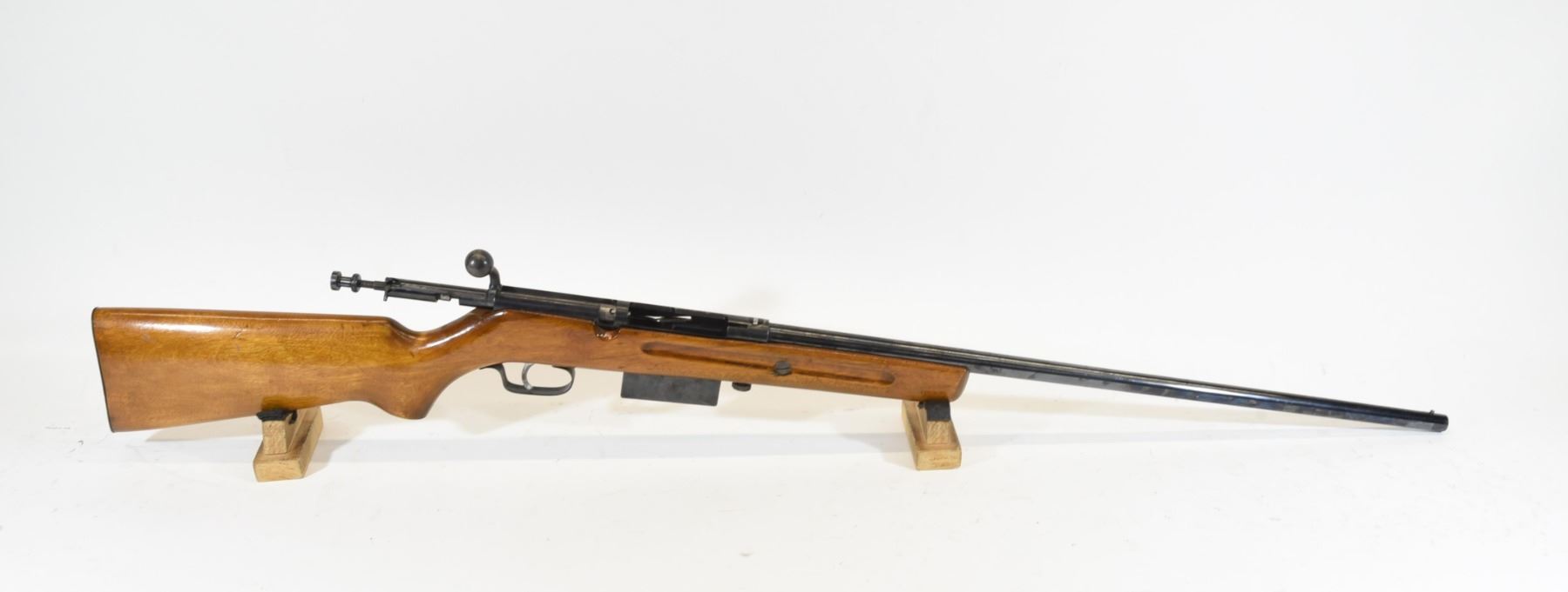 Non-restricted, bolt action, 410 Ga x 3", 24" barrel with fixed full choke, SN none. Wood refinished, bluing has light pitting all over, bore very good.