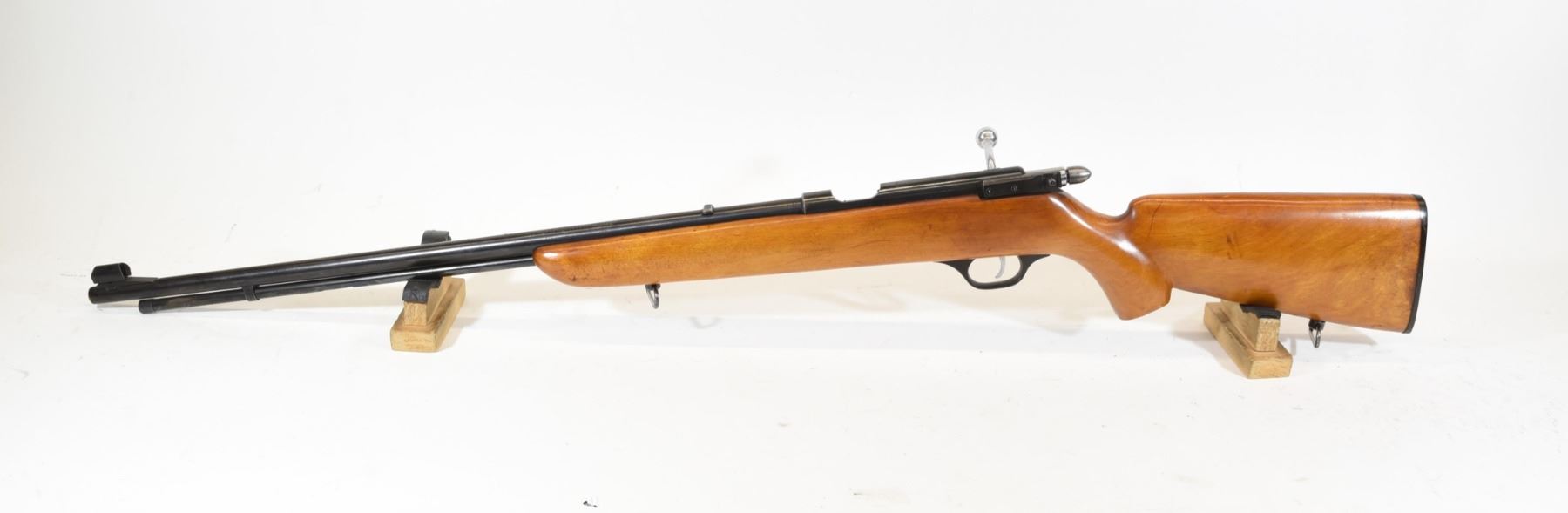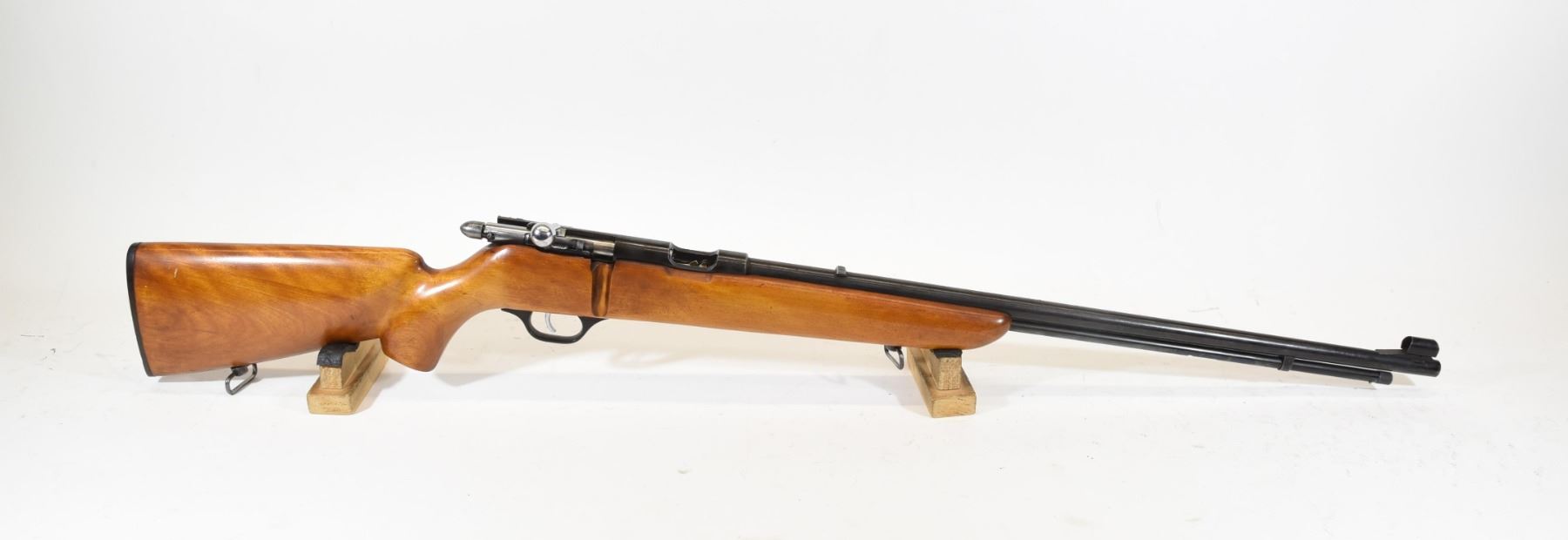 Non-restricted, bolt action, 22 LR, 24" barrel, SN none. Wood has a couple of scratches and marks, bluing has light pitting, bore excellent.