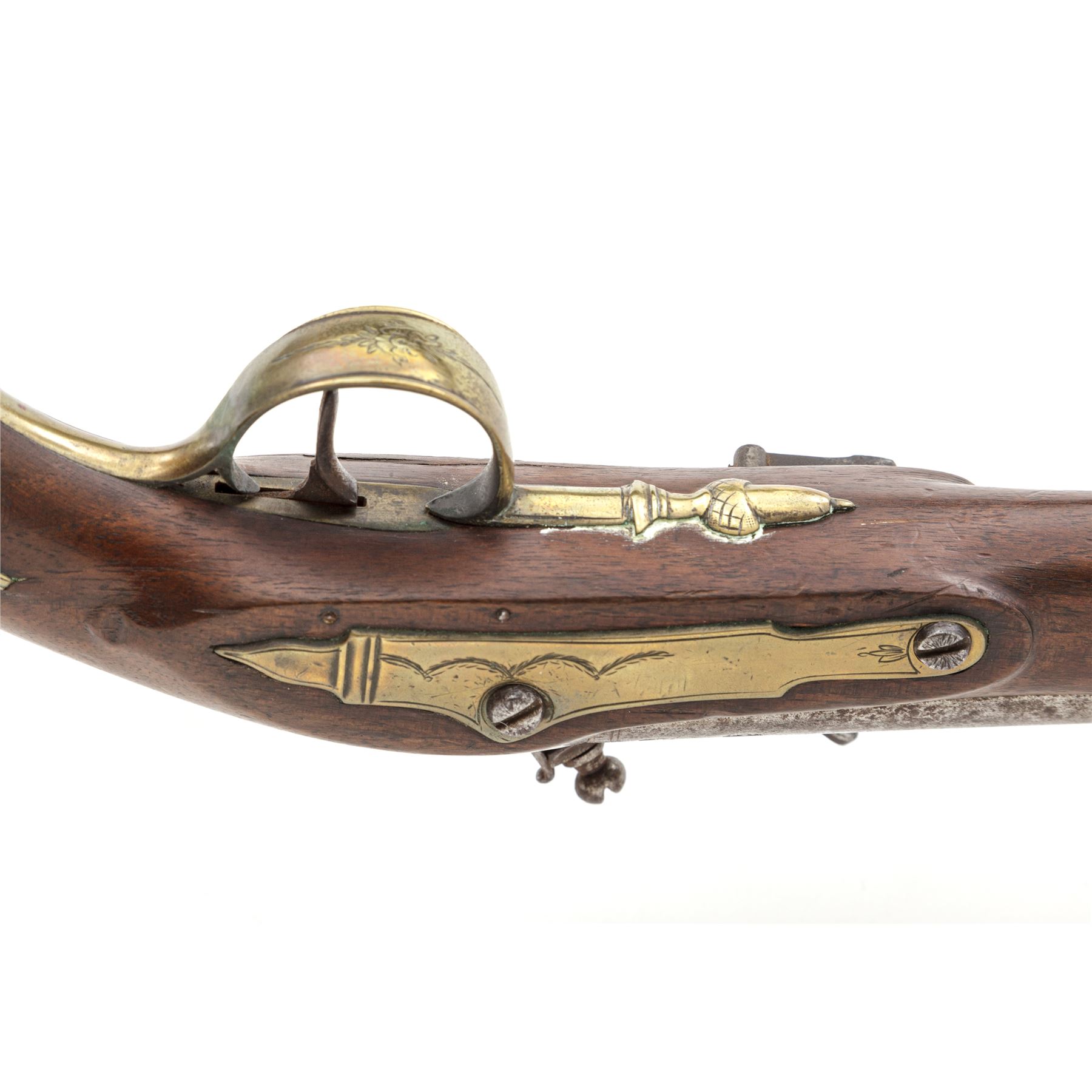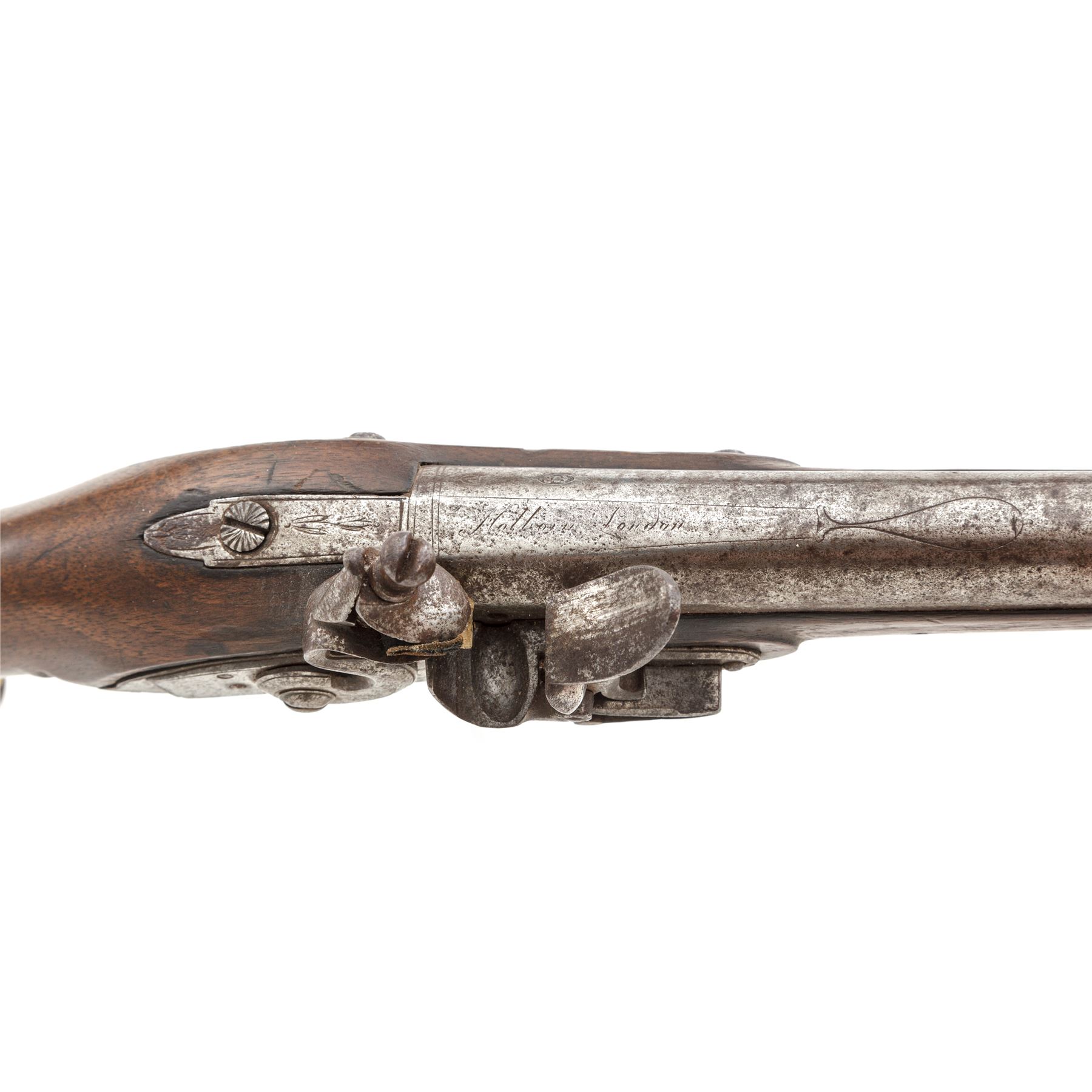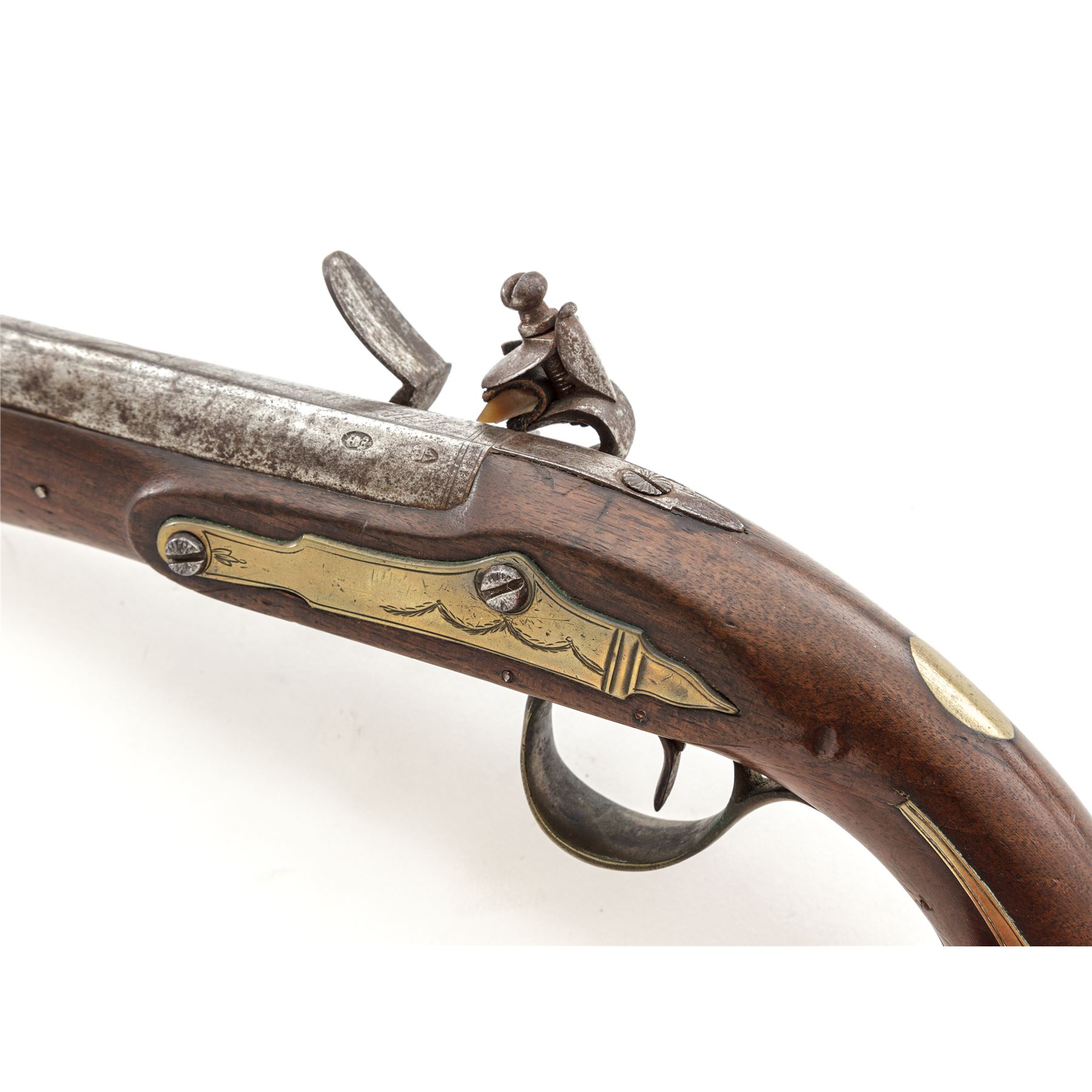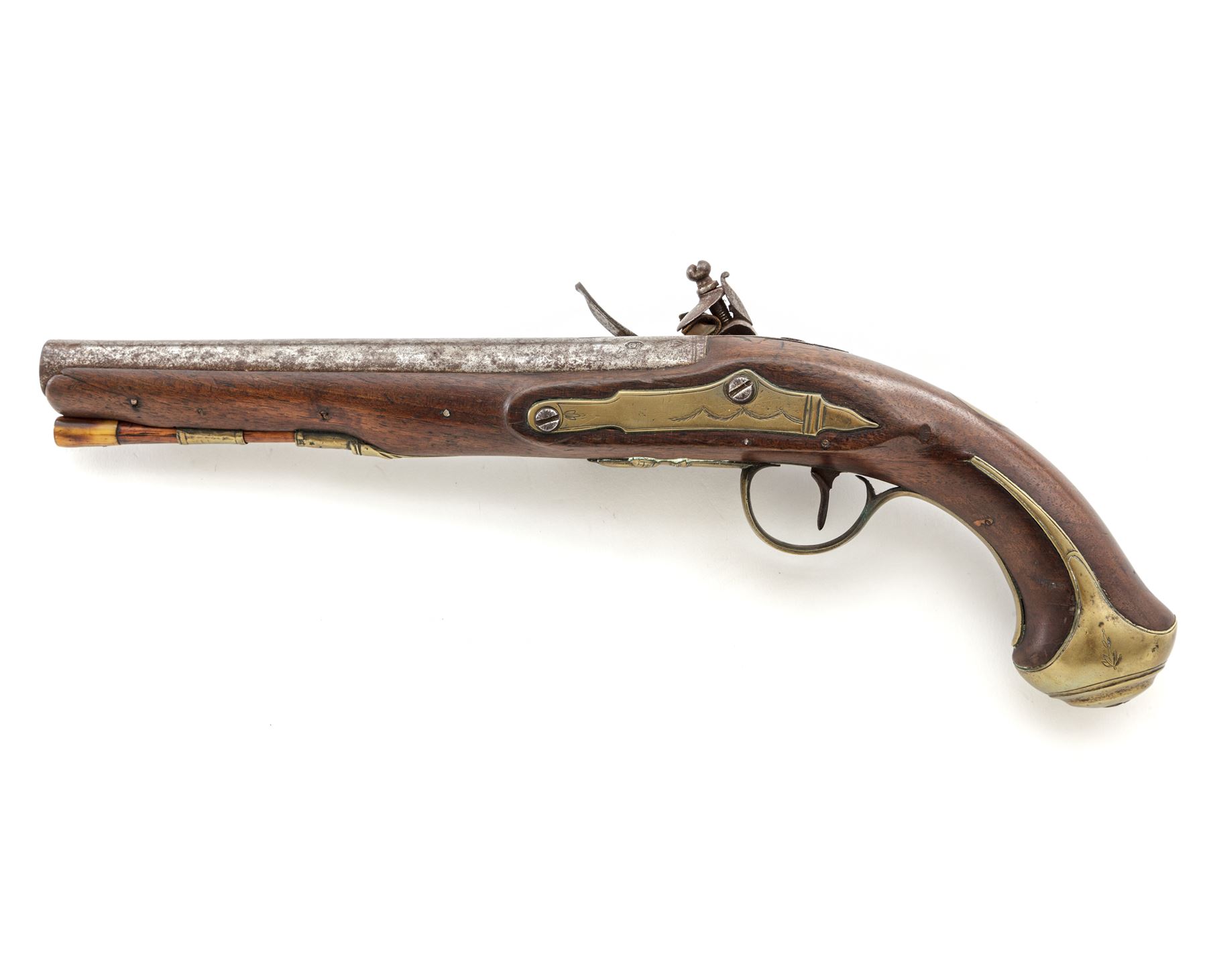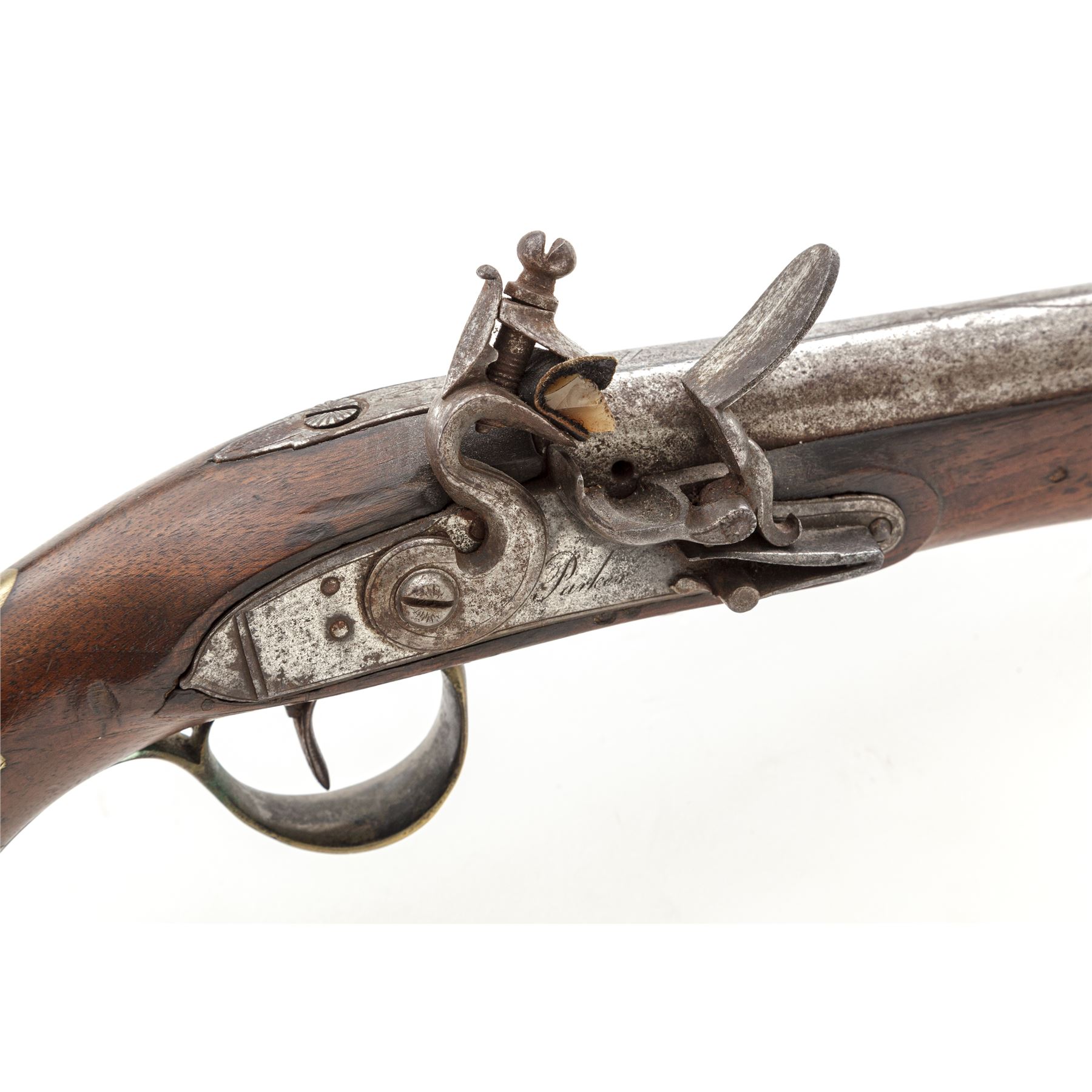 Antique British Large Bore Flintlock Officer's or Holster Pistol, NVSN, .60 cal., 8-5/8'' barrel without sights marked ''Holborn London'' on triangular top flat ahead of engraved rear tang, with two proofmarks at left breech; beveled-edge lockplate with step-down rear teat is marked ''Parker'' under flint pan; gracefully-shaped flint cock; brass furniture including engraved sideplate, engraved triggerguard with a lovely acorn front and long rear tangs, buttcap with long side extensions, two retaining thimbles for the horn-tipped hardwood ramrod. Varnished European hardwood fullstock has raised carved aprons on either side of lock, a vacant brass plaque atop the wrist, and three barrel retaining pins. Appears to be in original flintlock configuration with all original parts and unbushed touchhole. Condition is very good, the iron surfaces with a mostly smooth age-brown patina and scattered light erosion, the brass cleaned to bright; engraving and markings are mostly clear. Stock is smooth with only minor marks, a 2.5'' crack at right muzzle and two smaller ones below lockplate, but is solid and with pleasing color. Action is strong and sure; smoothbore is clean with a light coat of rust. Est.: $600-$900. (Antique)