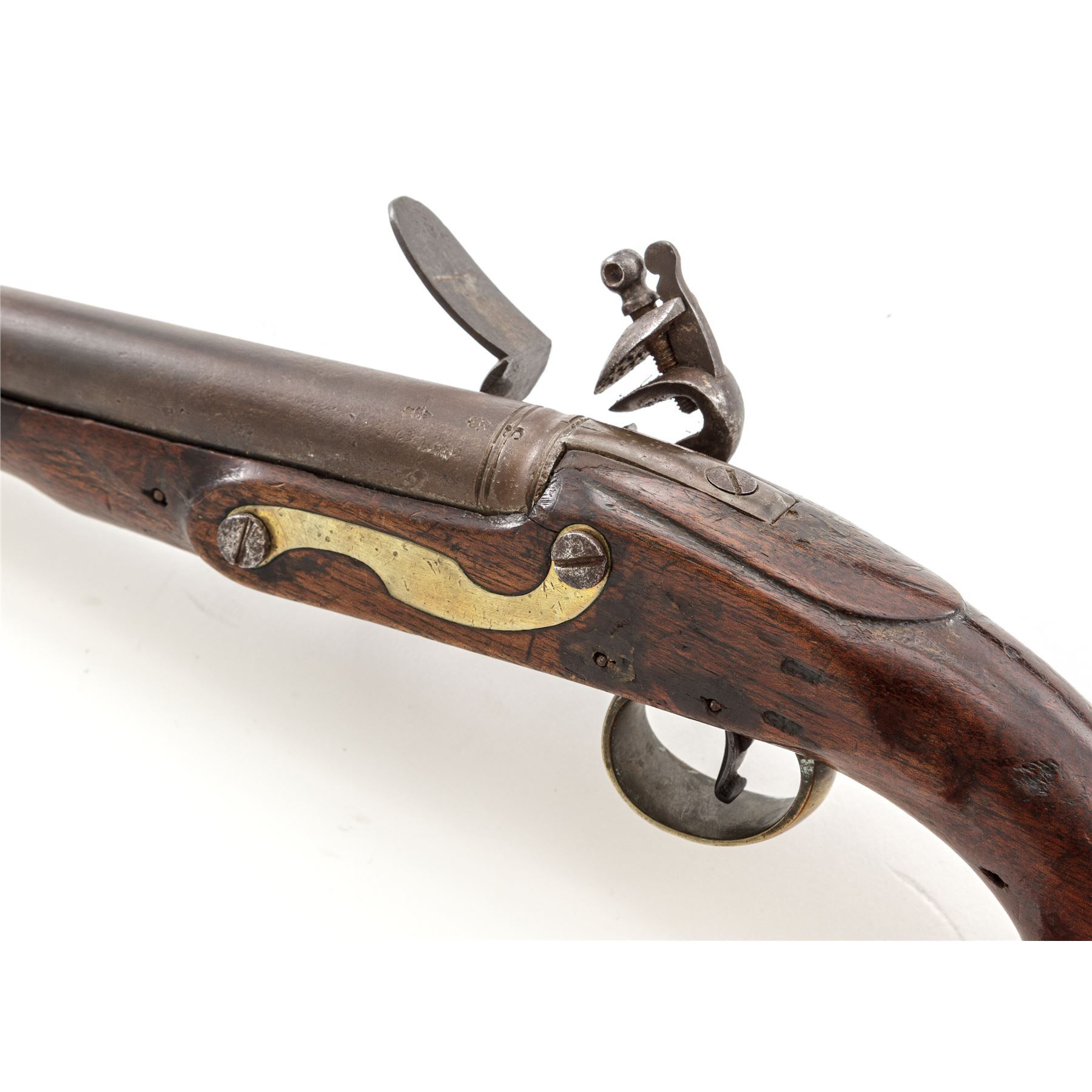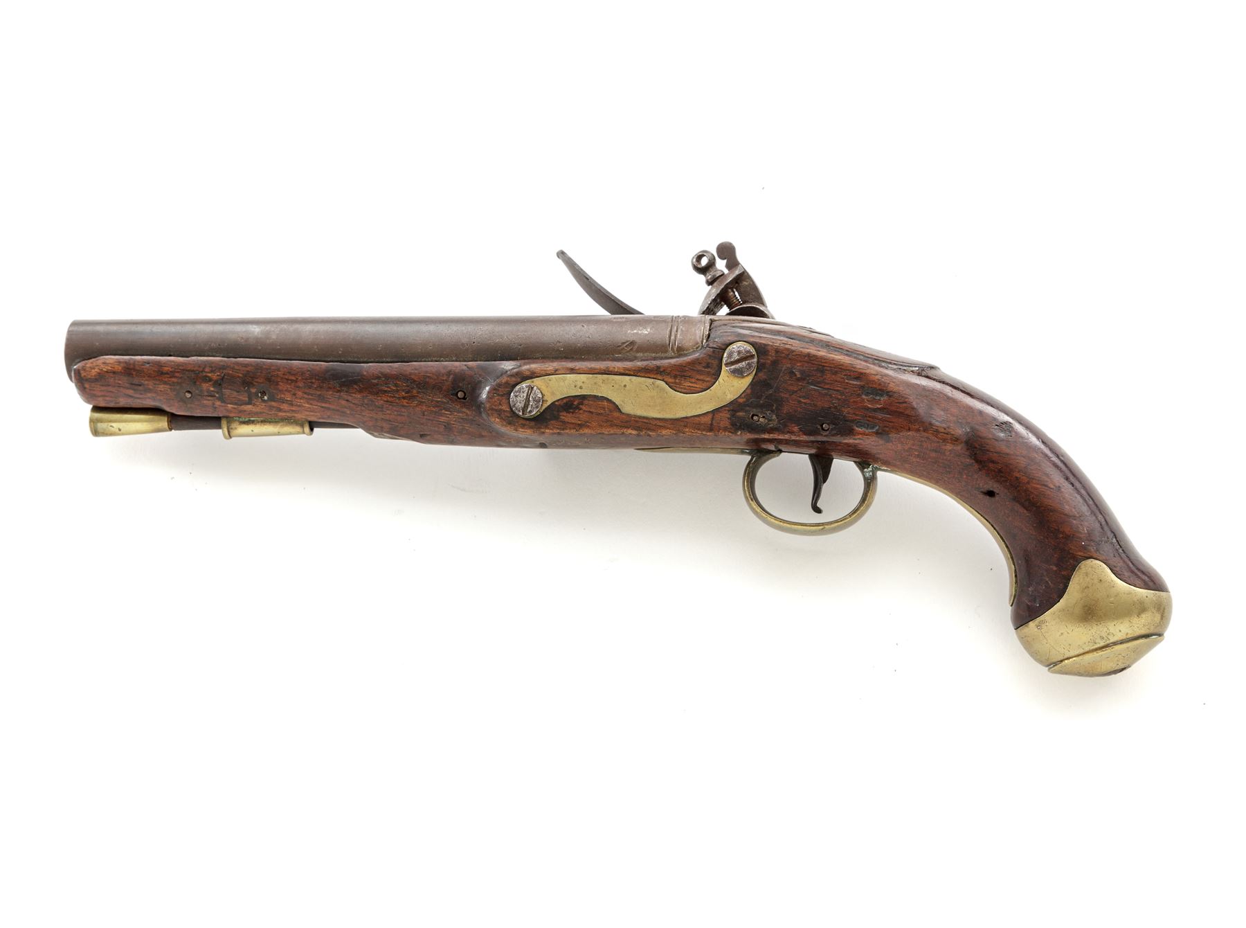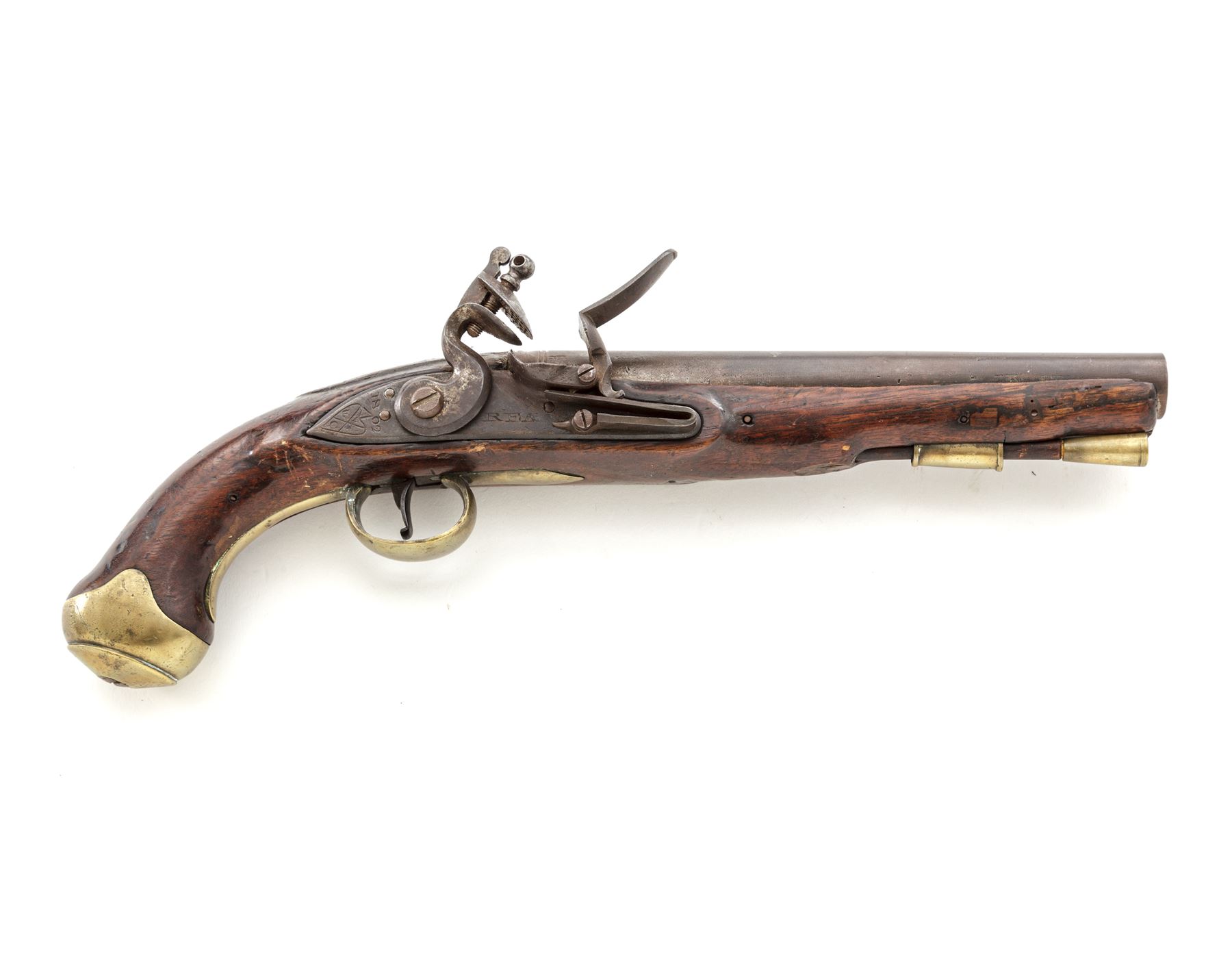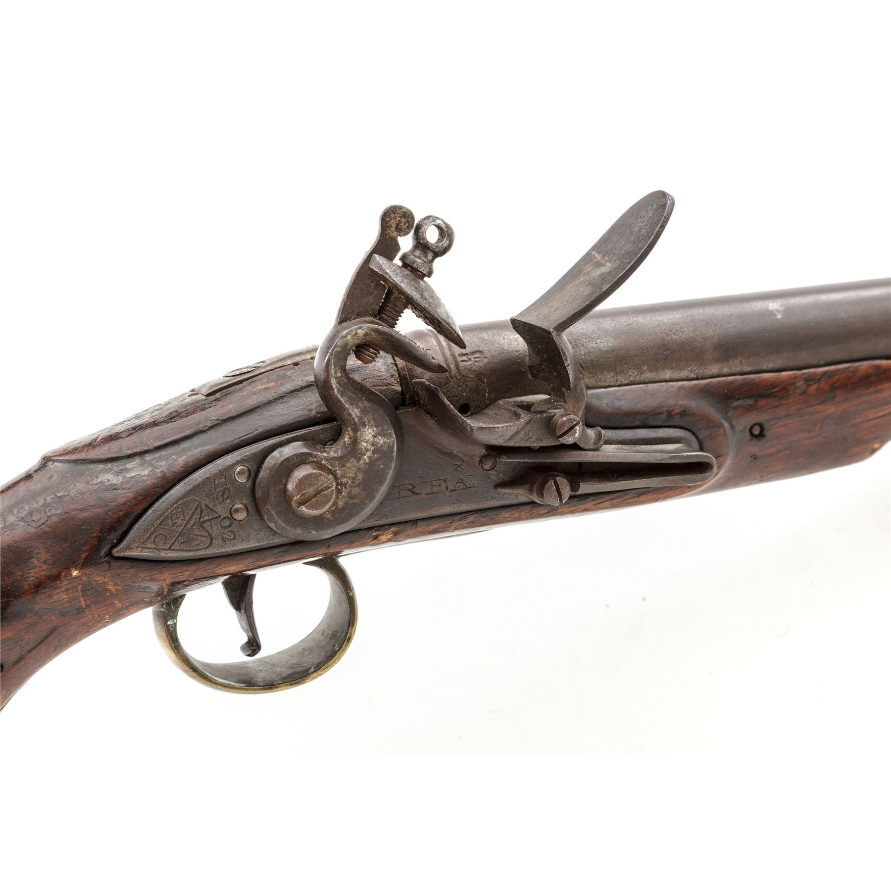 Antique British Large Bore ''East India Pattern'' Flintlock Pistol, NVSN, .75 cal., 9'' barrel without sights has 2 cannon turned rings, ''(crown)/GR/Broad Arrow'', ''(crown)/crossed swords'' and ''(crown)/17'' (indistinct) proofmarks and a deeply struck ''3'' at breech; beveled-edge lockplate with a distinct long pointed teat is marked ''REA'' under flint pan and ''1802/4/EIC'' (East India Company) within a heart-shaped cartouche vertically behind the gracefully-shaped flint cock; early-style trigger with curved tail; brass furniture including serpentine sideplate, triggerguard with long rear tang, buttcap, and single retaining thimble for the brass-tipped hardwood ramrod. Varnished European hardwood fullstock has raised carved aprons on either side of lock and atop the wrist, and three barrel retaining pins. Appears to be in original flintlock configuration with all original parts; touchhole may have been welded and re-drilled long ago. Condition is very good, the iron surfaces with a mostly smooth age-brown patina and the brass cleaned to bright. Stock is smooth and solid, showing the expected marks of age and use, losses including where ramrod enters stock, a wood patch on both sides ahead of 2nd barrel pin, and a likely later coat of varnish. Action is strong and sure; smoothbore is clean. A classic example of a pistol made for the ''Honourable East India Company,'' which received its Royal Charter from Queen Elizabeth I in 1600. At the time of this pistol's mfg. in 1802, during the height of its rule in India, the British East India Co. had a private army of about 260,000 men, twice the size of the entire British Army. Est.: $900-$1,200. (Antique)