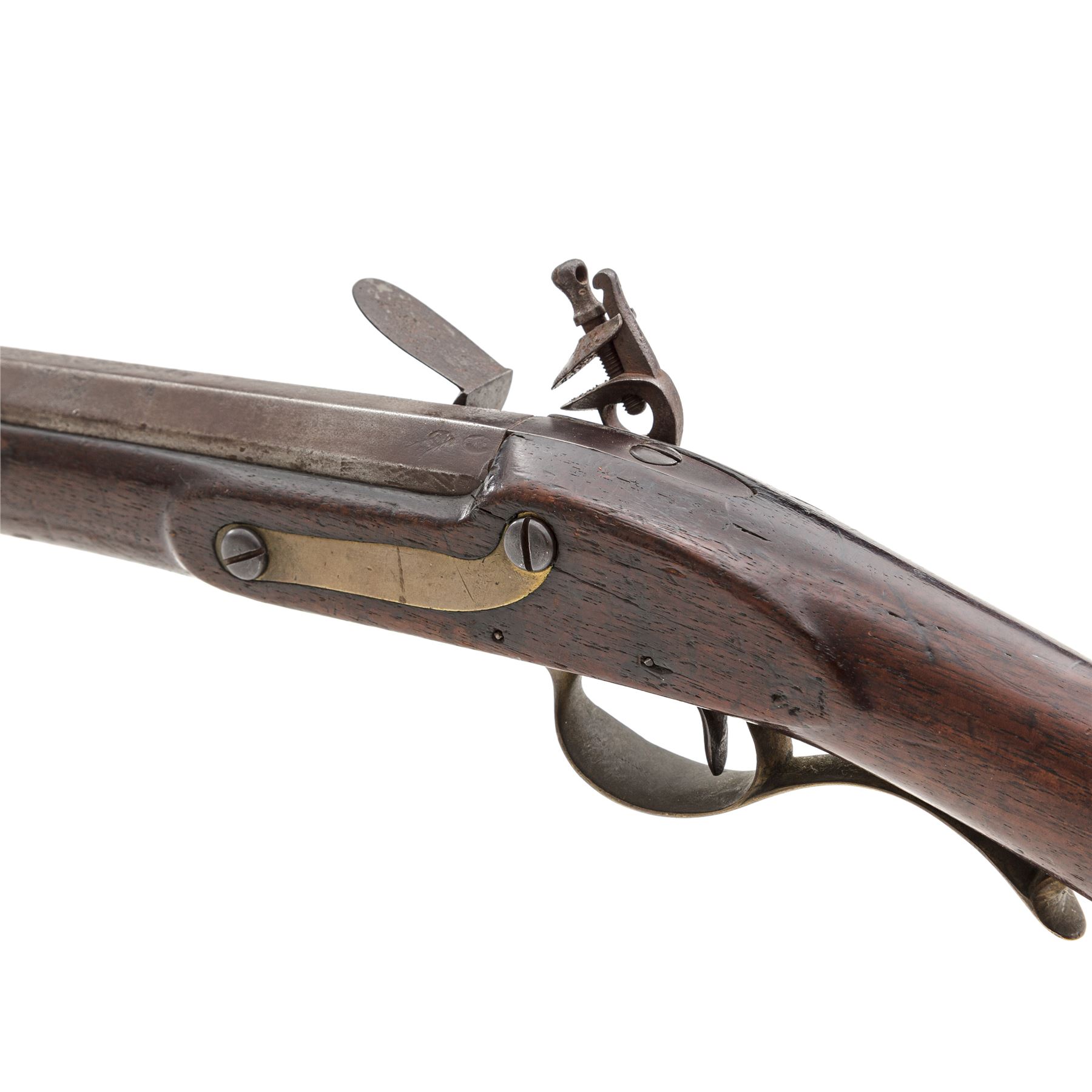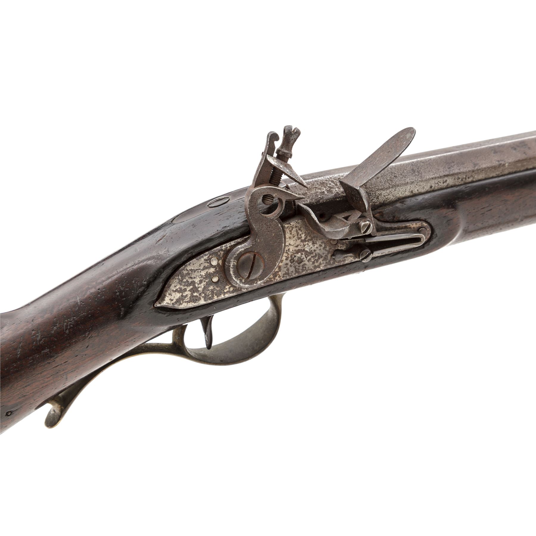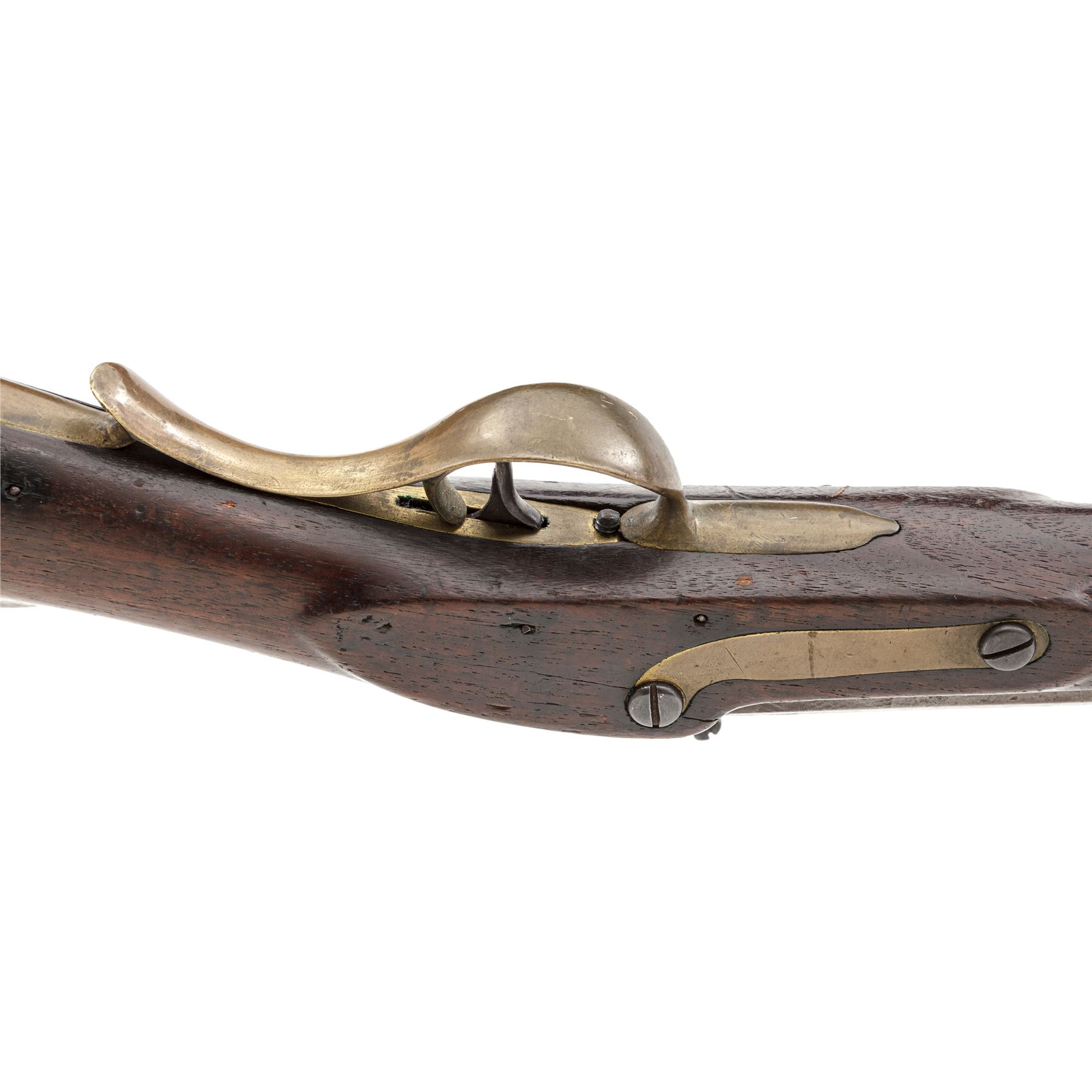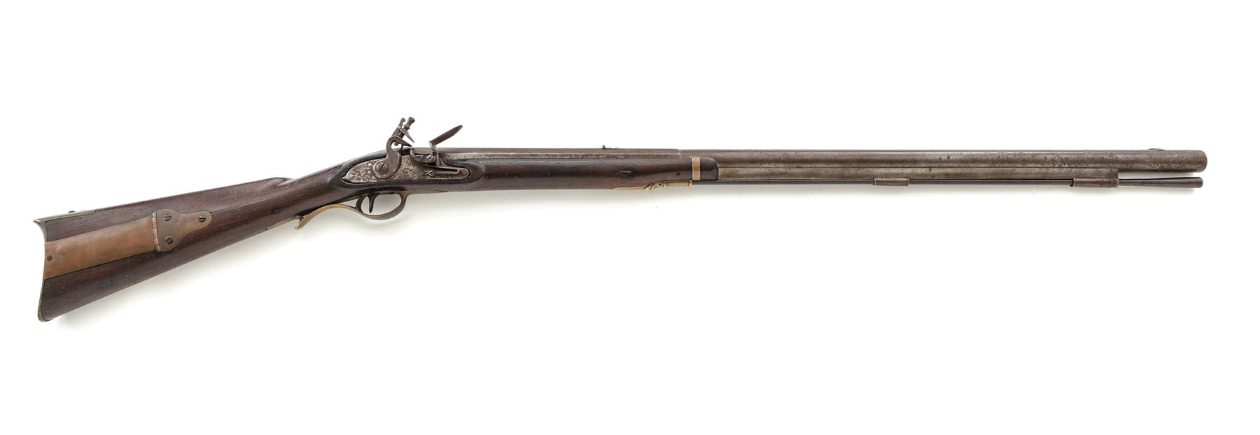 War of 1812 Era U.S. Model 1803 Early Production Flintlock Rifle, by Harpers Ferry Armory, NVSN, .54 cal., 33.25'' half octagon-half round barrel having dovetailed low-blade front and small-notched rear sights marked with ''US'' and ''(eagle head)/P'' oval cartouches at breech; bevel-edge lockplate with pointed teat at rear is faintly marked with a large spread-wing eagle over ''US'' ahead of hammer, but the Harpers Ferry and date markings behind are obscured by pitting; brass furniture including scrolled triggerguard, crescent buttplate with button on top tang that actuates the large spring-loaded patchbox which opens to a buttstock trap for patches, spare flints and small parts, serpentine sideplate, front ''band'', and fancy rear ramrod ferrule; the distinctive iron under-barrel rib has two iron ferrules to retain the plain (but later) iron ramrod having a flared tip; oil-stained walnut halfstock with a carved and fluted cheekrest and a single iron barrel key. Mfg'd ca. 1803-1807. Rifle appears to be complete as issued and in original flintlock configuration (the touchhole may have been refurbished during its period of use, but difficult to discern). Condition is very good for this early and rare variation, the barrel showing scattered cleaned pitting and a correct but later thin brown finish; the lockplate and flint cock showing cleaned pitting, faint-to-obscured markings, and gunmetal gray color; the brass with a clean aged patina. Stock is smooth and solid showing only minor use marks and a small wood loss at top of lockplate apron ahead of frizzen. Action is strong and smooth; bore is clean showing very deep rifling. The iconic Model 1803 rifle, with its distinct Kentucky rifle influences, is among the most graceful and sought-after early American longarms. Est.: $3,000-$5,000. (Antique)