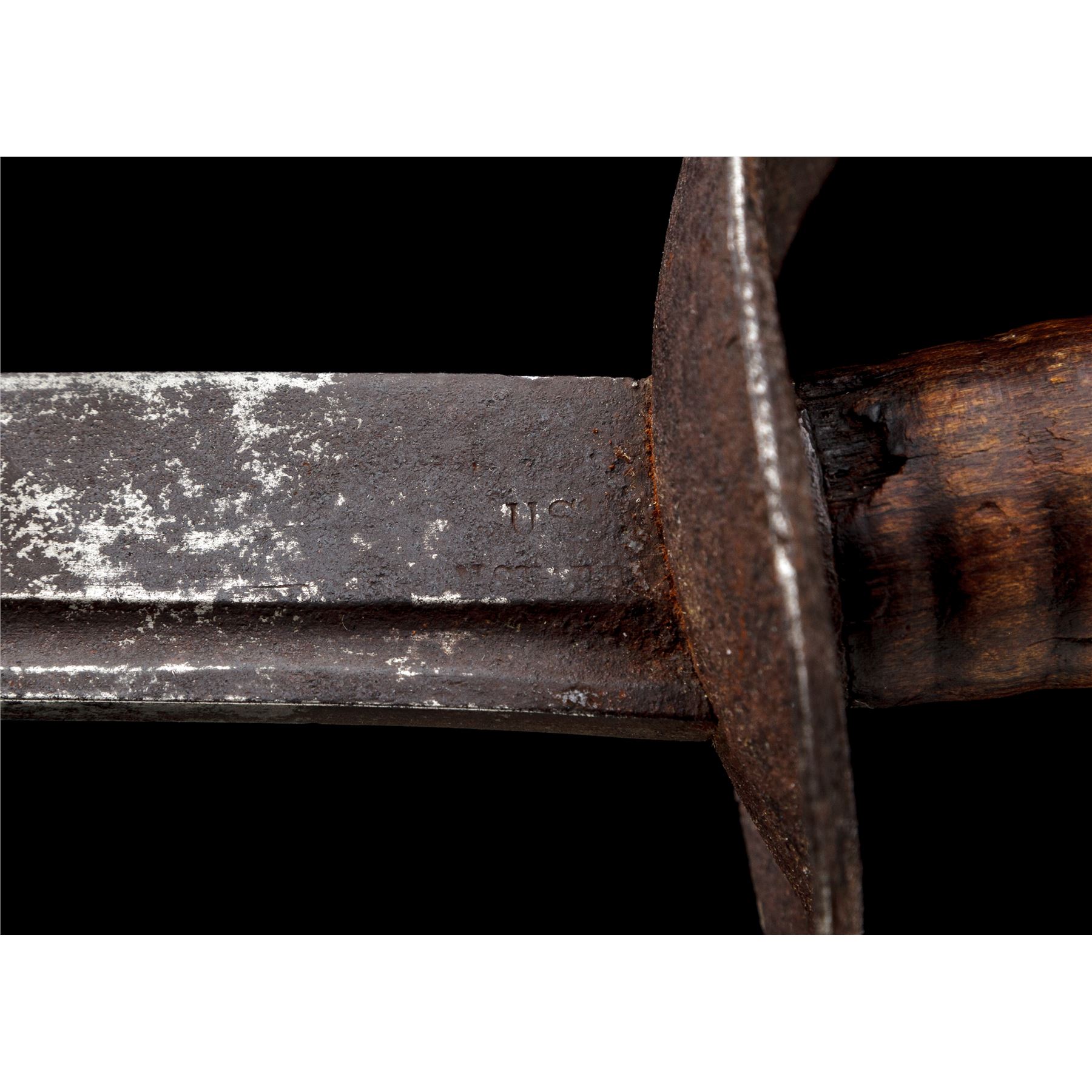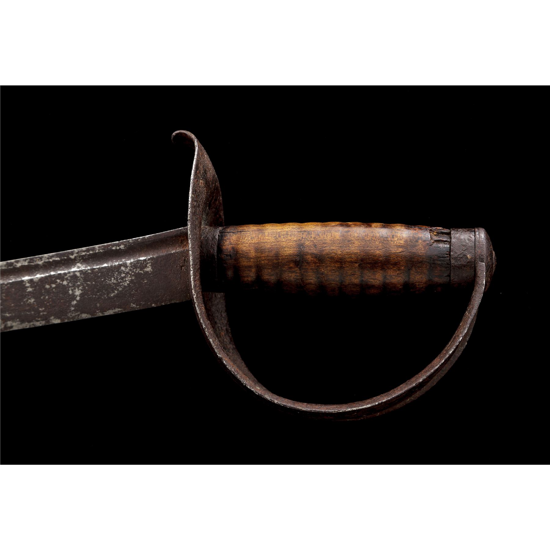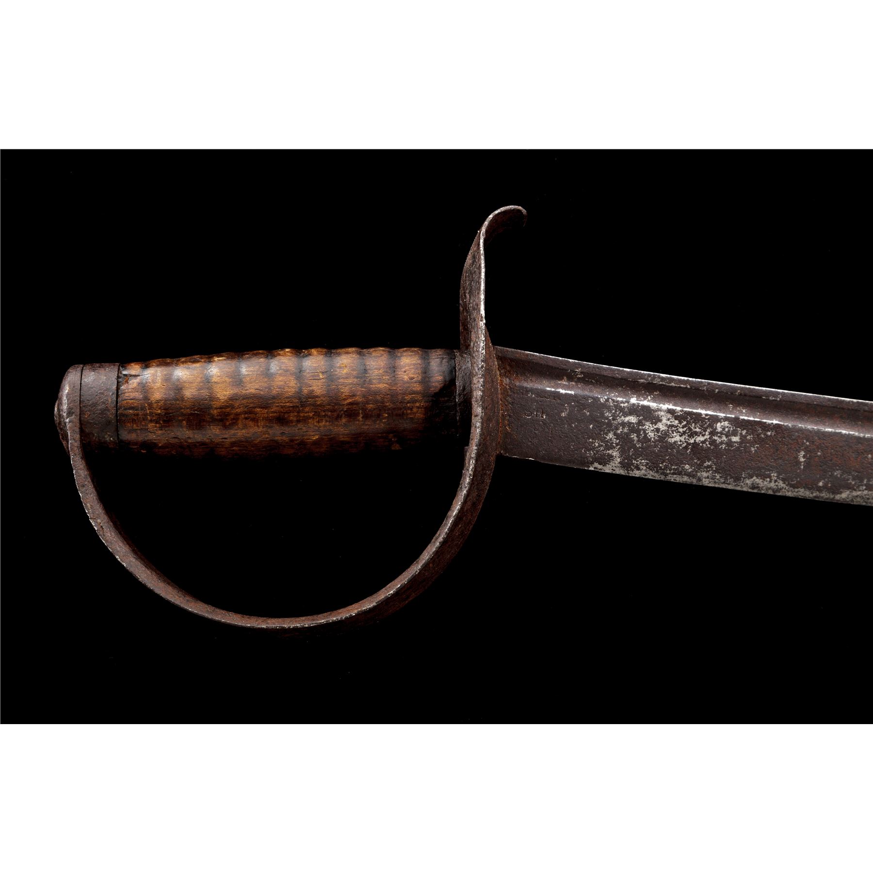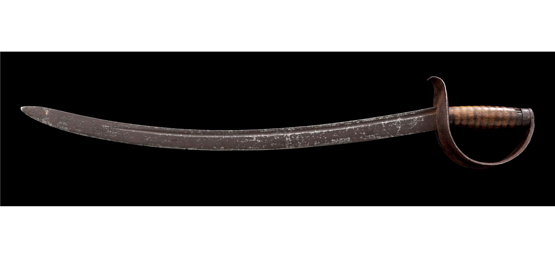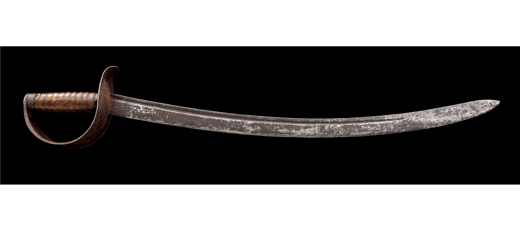 Model 1826 U.S. Naval Cutlass, by Nathan Starr, featuring a curved, narrow single fuller blade with ''U.S., N.STARR'' stamped at the base, and a faint inspector's mark on reverse. Wooden handle grip with round grooves and a minor chip at the top and bottom. Steel solid basket handguard with curved quillion. No scabbard. A rare cutlass with only 2000 produced in this contract. Condition is fair with heavy rust patina and a couple of edge nicks to the blade. The guard has a heavy rust patina, with pitting overall. Wood grip has a nice dark patina with the noted small chips top and bottom. Handle and guard are nice and tight. Blade measures 25'' and OAL is 31''. Est.: $1,000-$1,500.