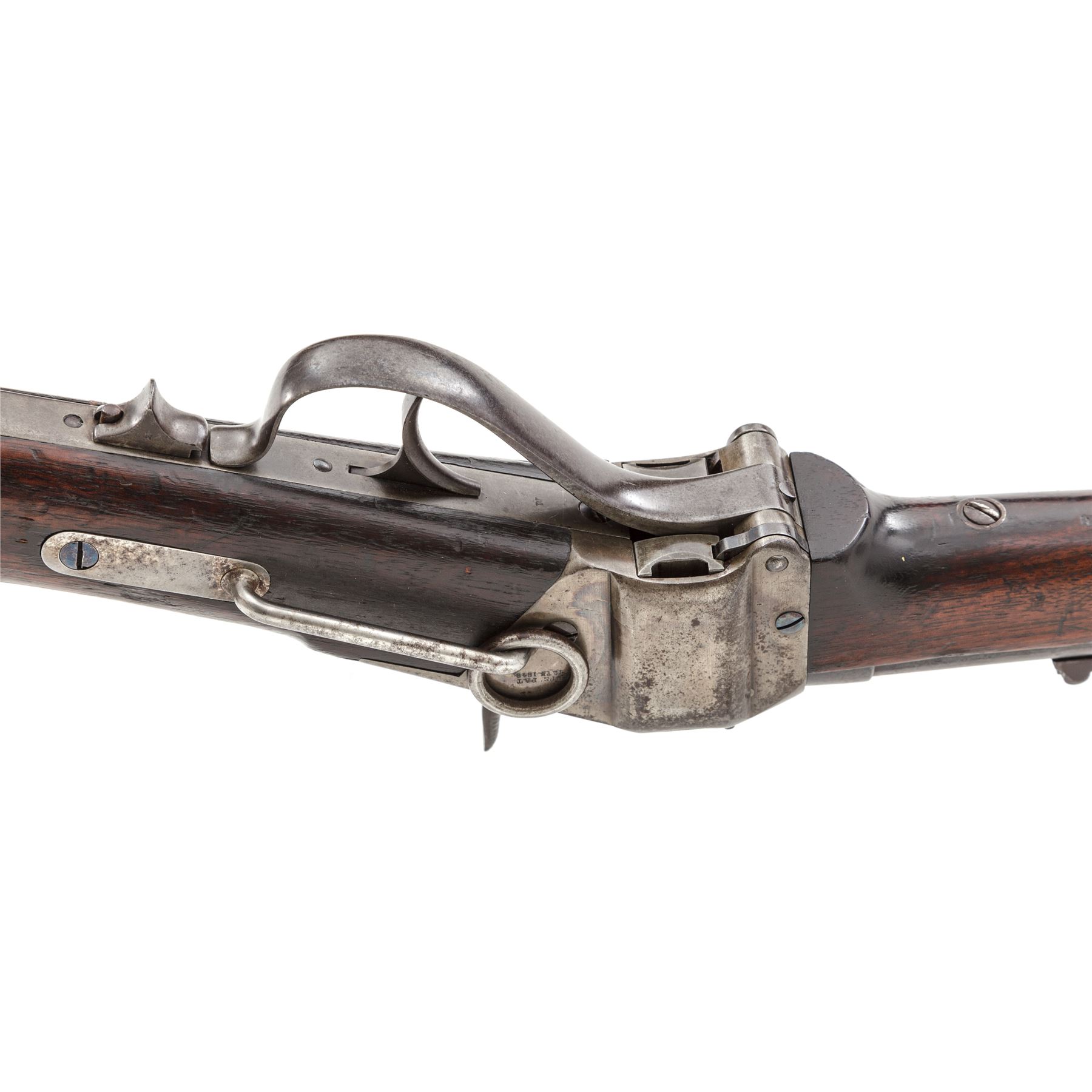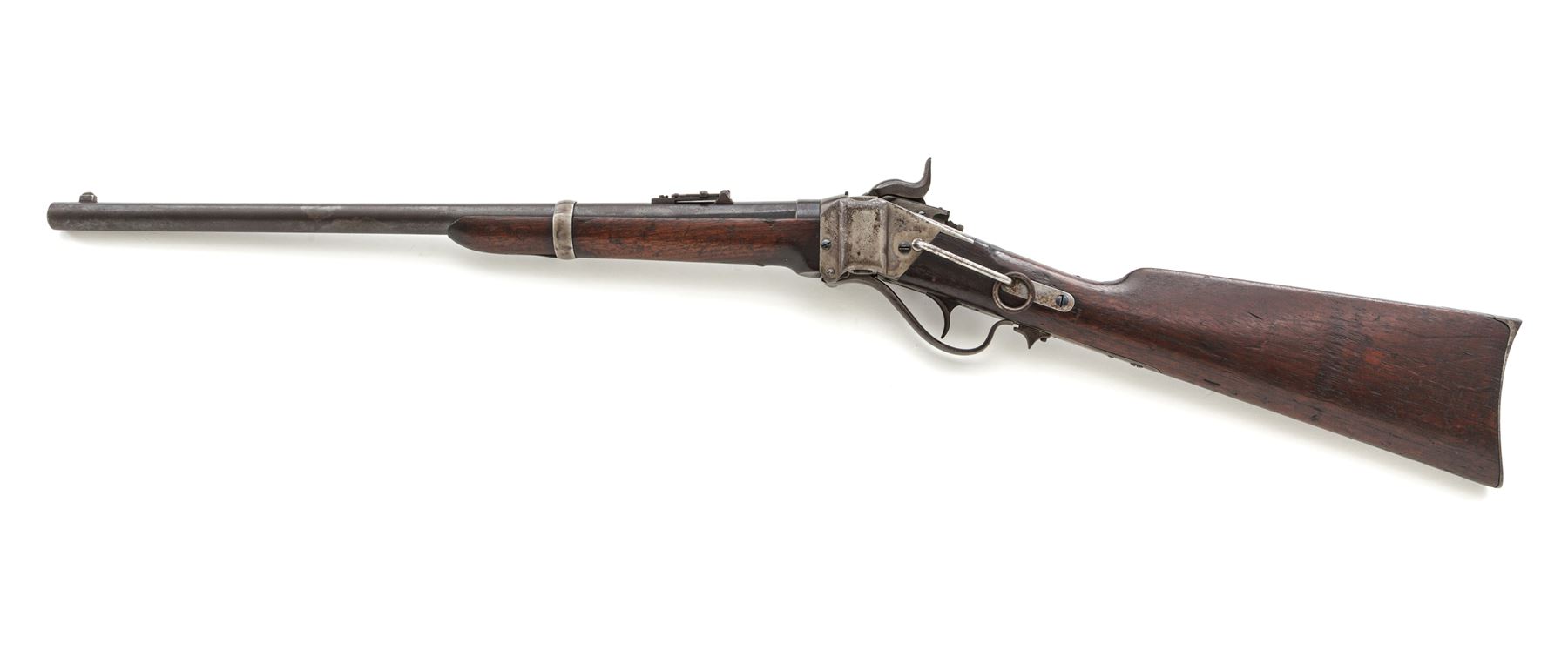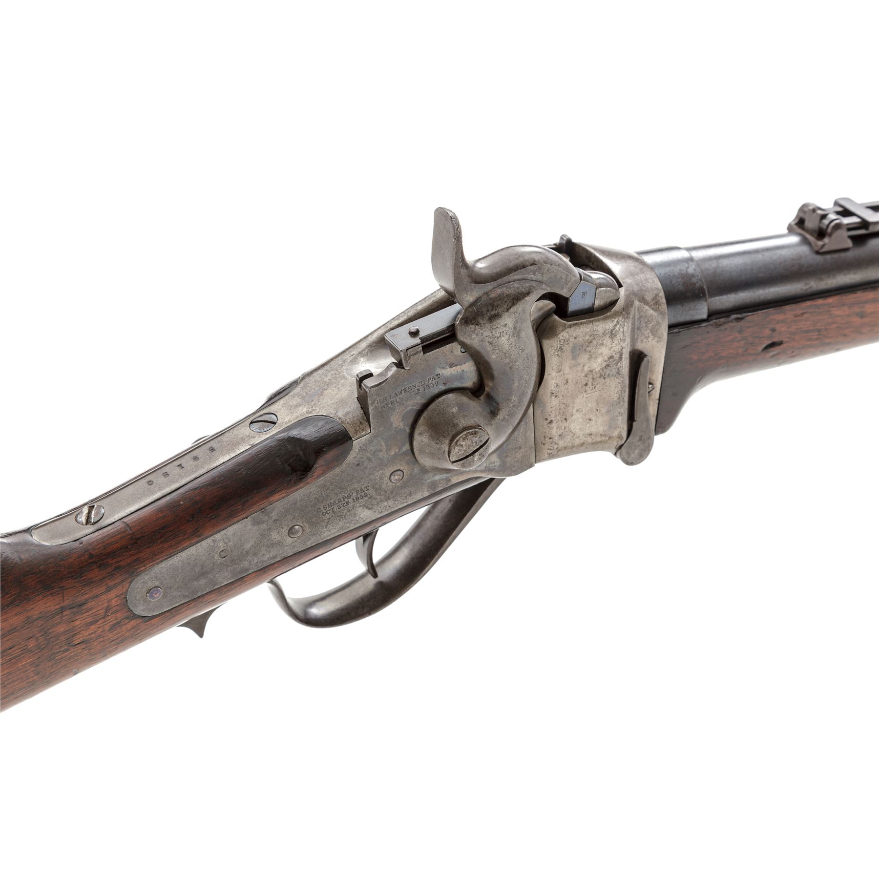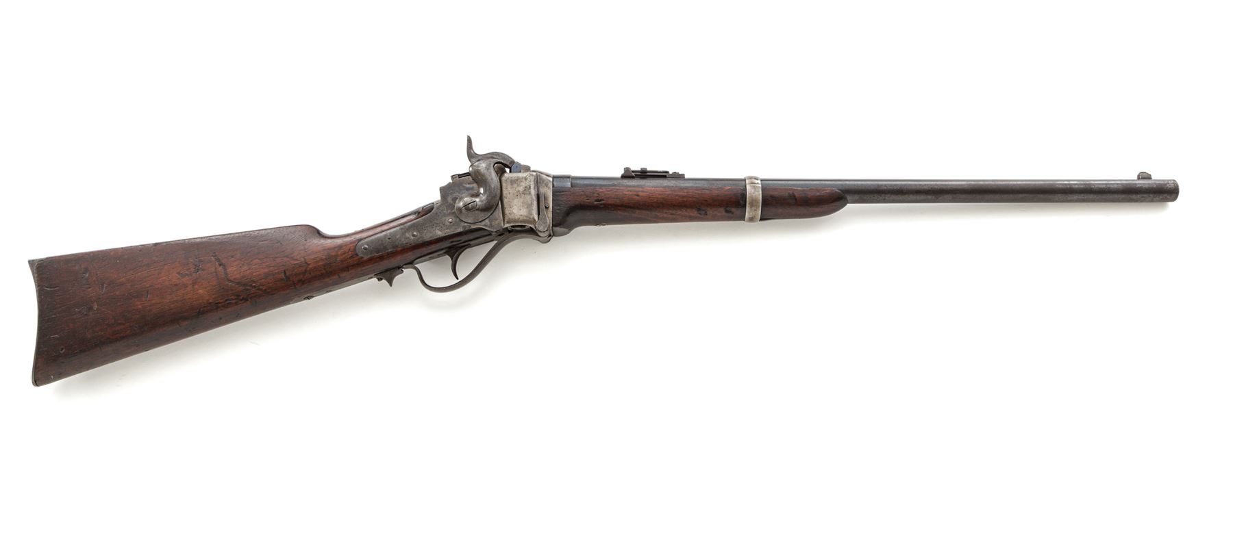 Civil War Sharps New Model 1859 Cavalry Carbine, Factory Altered to Metallic Cartridge, #59180, .50-70 CF cal., blued 22'' barrel has integral block-blade front and Lawrence patent sliding-leaf rear sights; case hardened ''Straight Breech'' receiver is fitted with a sling bar and ring and marked ''C. Sharps' Pat./Sept. 12th, 1848'' on left side, and ''C. Sharps' Pat./Oct. 16th, 1852'' behind ''R.S. Lawrence Pat./April 12th, 1859'' on right side; serpentine operating lever opens the dropping-block action for cartridge loading and cleaning; single spring-retained steel barrel band, trigger, and carbine-style buttplate; oil-finished walnut forend and buttstock. Mfg'd ca. 1859-66; converted in 1867 and after. Condition is very good to near fine, the barrel retaining 80% darkening military blue, the case hardened steel parts showing nicely mottled colors turned silver on sides of receiver. Stocks are sound showing the expected marks of military use and age, a nice ''DFC'' within a ribbon inspector's cartouche on left side of buttstock, and perhaps a later coat of light varnish. Action functions smoothly; sleeved three-groove bore is clean with defined rifling. Est.: $1,750-$2,750. (Antique)