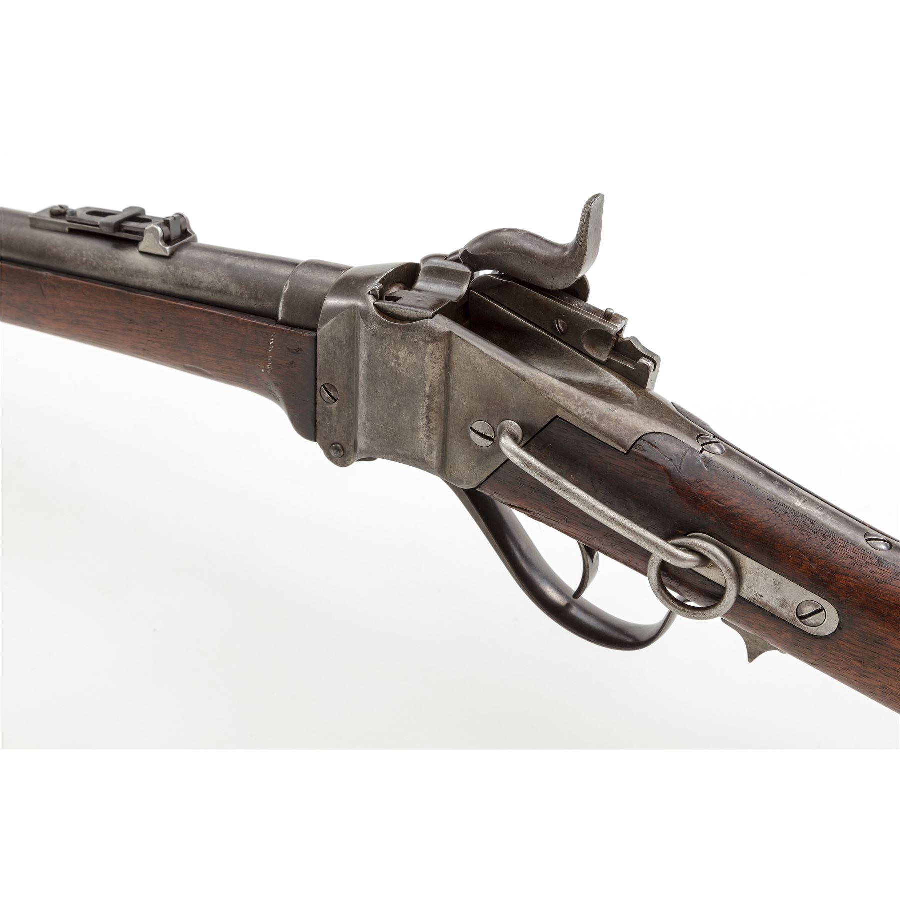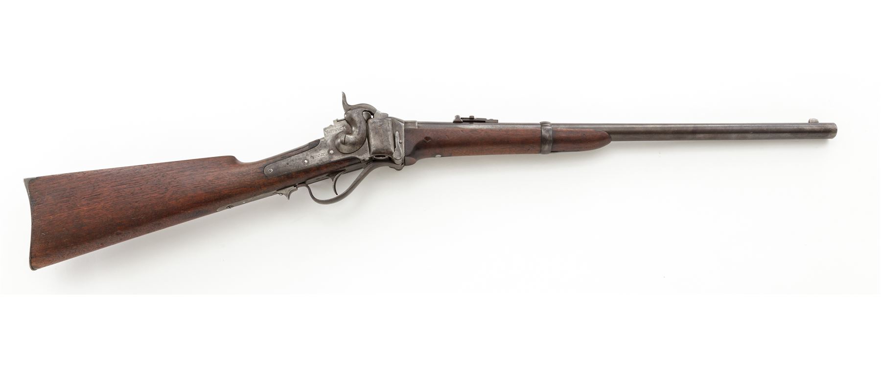 Civil War Sharps New Model 1863 Saddle Ring Carbine, 2nd Type, #93316, post-war altered to .50-70 CF cal. by the Sharps factory, 22'' barrel, with integral block-blade front and Lawrence patent sliding-leaf rear sights marked ''New Model 1863'' both ahead of and behind rear sight; case hardened ''Straight Breech'' receiver is fitted with a sling bar and ring on left side, and marked ''C. Sharps' Pat./Oct. 5th, 1852'' below ''R.S. Lawrence Pat./April 12th, 1859'' on right; serpentine operating lever opens the dropping-block action for single-shot cartridge loading and cleaning, with automatic ejection; steel spring-retained barrel band, trigger, and carbine-style buttplate; oil-stained walnut forend and buttstock without patchbox. Mfg'd ca. 1859-66; converted in 1867 and after. Condition is very good. Barrel is bluish-brown with scattered peppering, receiver case colors have darkened and silvered. Buttstock is smooth and sound with minor use marks and a ''DFC'' (David F. Clark) inspector's cartouche within a ribbon on left side; forearm is smooth with minor marks and two quarter-inch gouges; barrel markings were softened at time of factory refinish. Action functions smoothly; original six-groove bore is bright with defined rifling. Est.: $1,250-$2,250. (Antique)