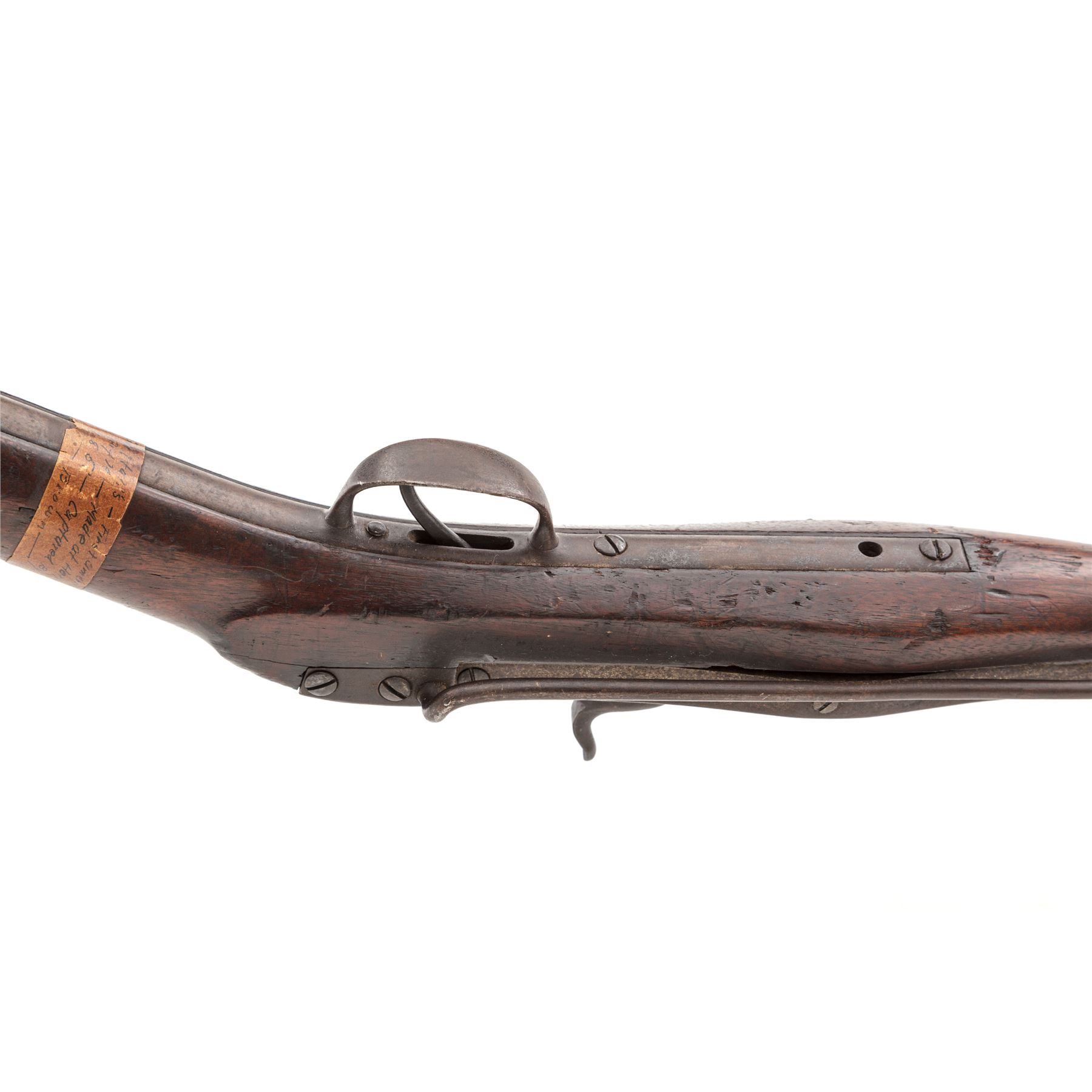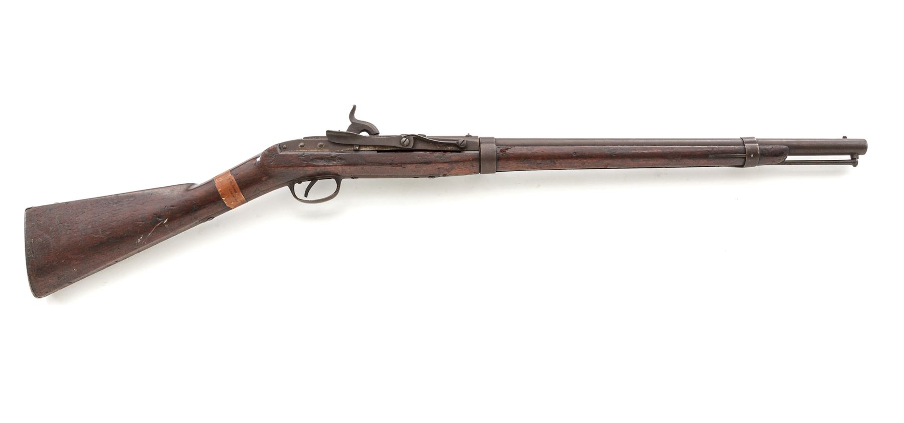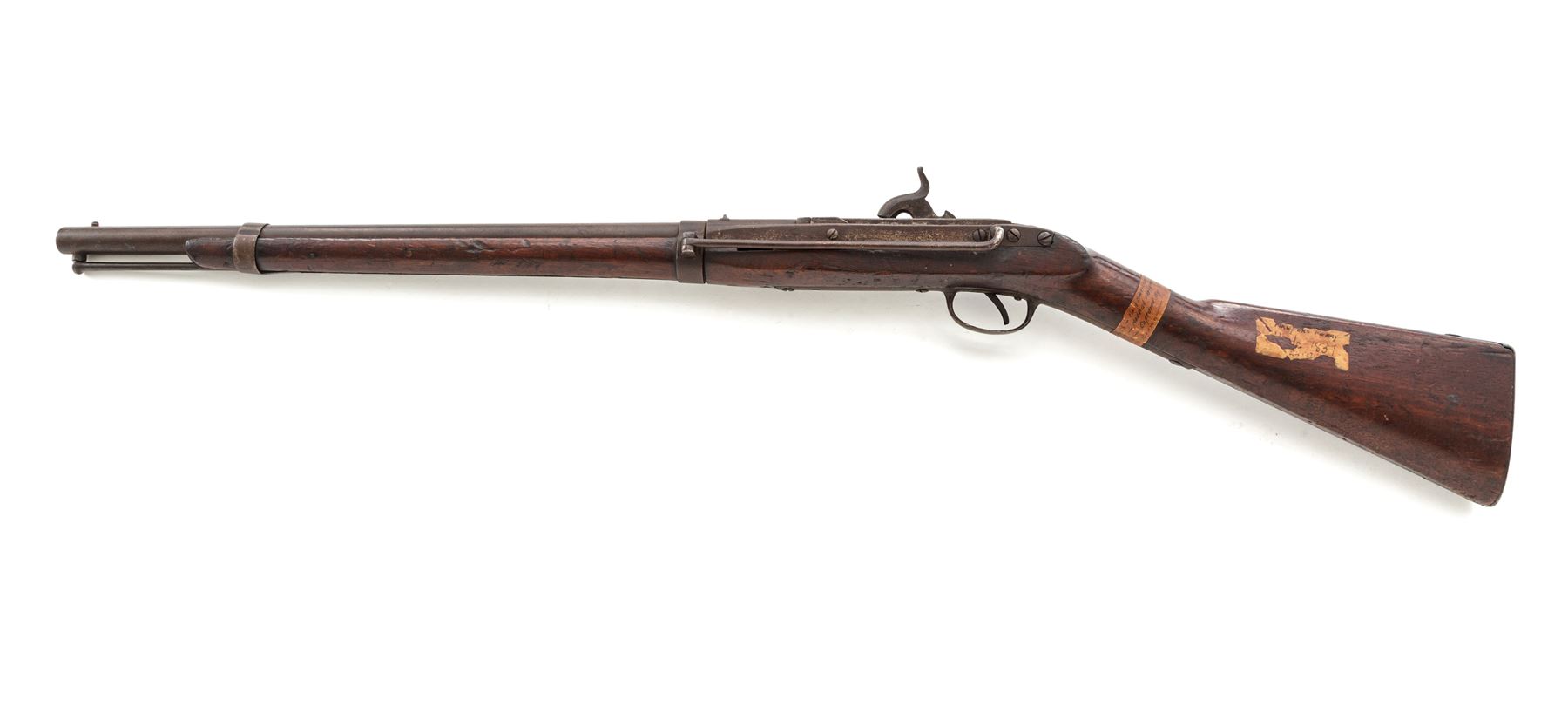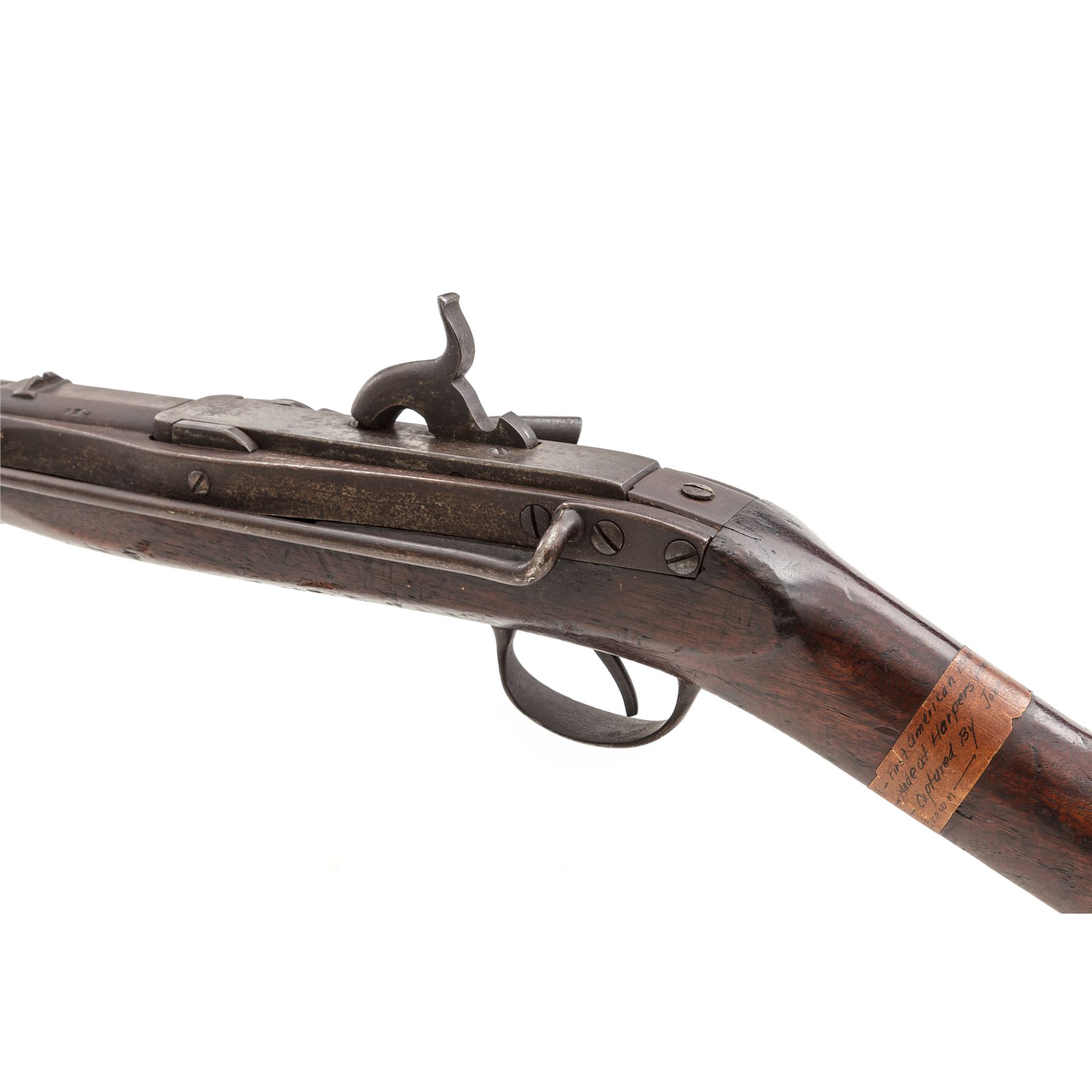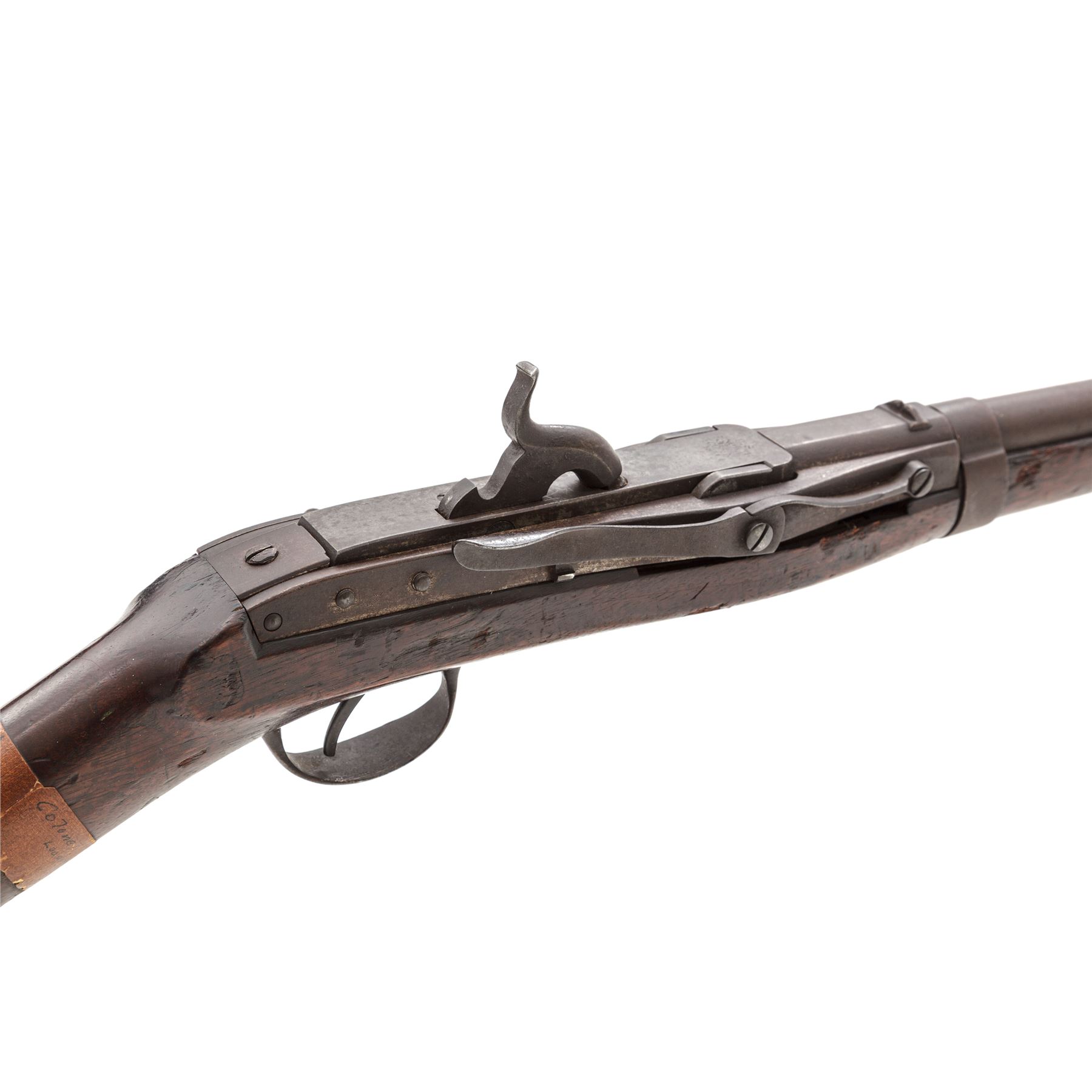U.S. Model 1843 Hall-North Percussion Carbine, a.k.a. ''Side Lever Hall'', NVSN, .52 smoothbore cal., 21'' barrel (semi-octagonal behind lower band) with small post front and notched rear sights; steel receiver is marked ''U.S./S. North/Midltn./Conn./1851'' atop rear-hinged breechblock that pivots upward when long right-side lever is lowered; iron furniture including 8.5'' ring bar on left side, two barrel bands, actuating lever, triggerguard with extended top and bottom tangs, buttplate, and button-tip ramrod; oil-stained walnut fullstock. Barrel and iron furniture originally finished in distinctive Hall brown lacquer, with case hardened breech. Mfg'd ca. 1844-53. Condition is very good, the metal parts showing a darkened age patina with traces of brown lacquer, case hardened receiver and breechblock having silvered out. Stock with the expected marks of age and military service and with a likely later coat of varnish. Stock wrist has an old paper label that reads, in part, ''First American Breech Loading Rifle-Made at Harpers Ferry-Captured by John Brown''; another label on left buttstock is partially legible: ''Harpers Ferry'' and the date ''1837''. These Model 1843 Halls were issued to the 1st and 2nd U.S. Dragoons during the Mexican War, and to Union cavalry regiments in the Civil War. Action is strong; bore is clean with deep rifling. Est.: $1,500-$2,000. (Antique)