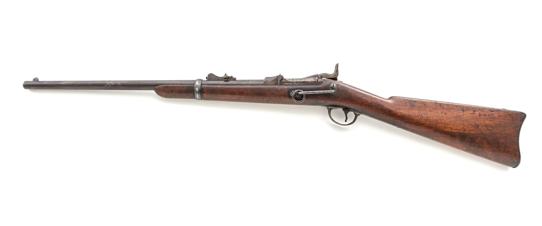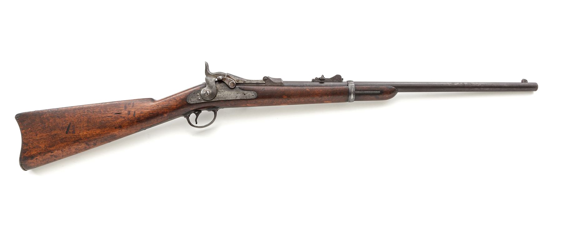 Indian Wars U.S. Springfield Model 1873/1877 Trapdoor Saddle Ring Cavalry Carbine, #122370, .45-70 Gov't. cal., 22'' barrel is marked ''V/P/(eagle head)'' at left breech, and fitted with a block-blade front sight and adjustable sliding-leaf rear sight (correctly marked ''C'' for Carbine); trapdoor is marked ''U.S./Model/1873'' below hinge; lockplate is marked ''(spread-wing eagle)'' to left of ''U.S./Springfield'' below breechblock latch; side opposite lock is fitted with a sling bar and ring; standard two-piece triggerguard, buttplate marked ''US'' on top tang with sliding door opening to cleaning rod trap in butt (three-piece rod is present), and single spring-retained barrel band; oil-finished walnut halfstock. Mfg'd ca. 1877-78. Condition is very good, the barrel with a later dark-bluish finish over scattered pitting, the balance of the steel parts a gunmetal gray color with silvered case hardening. Triggerguard and buttplate retain 40%-50% blue with scattered erosion. Stock is solid with the expected marks from age and military use. Action is stout; bore is clean with defined rifling. The ''P'' proofmark is present on stock belly, but the ''ESA'' cartouche of Master Armorer Erskine S. Allin is not visible at left wrist. The Model 1877 improvements included a thicker stock wrist and longer comb, cleaning rod butt trap with hinged door, ''low arch'' breechblock, and others. Est.: $2,500-$3,500. (Antique)