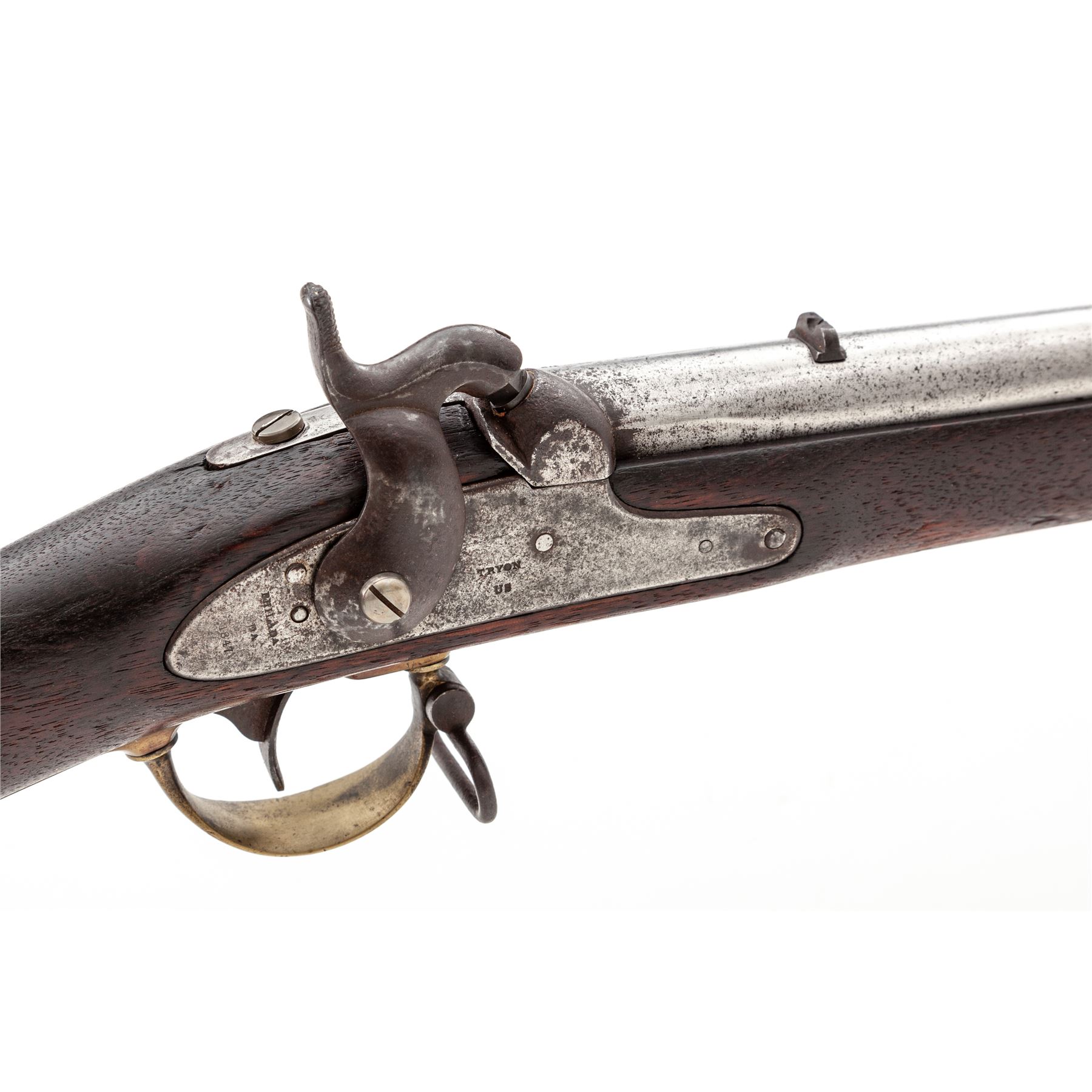 Mexican War Era U.S. Model 1841 ''Mississippi'' Percussion Rifle, George W. Tryon contract, NVSN, .54 cal., 33'' barrel, with brass blade front and dovetailed notch rear sights, is marked ''US/JCB/P'' (the latter in a sunken oval), and ''1848'' on top tang; the beveled-edge lockplate is marked ''Tryon/US'' ahead of the hammer, and ''Philada/PA/1847'' vertically behind; brass furniture including serpentine sideplate, two spring-retained barrel bands (top band of the double-strap type with iron sling swivel), two-piece triggerguard with iron sling swivel at front, and distinctive patchbox with hinged lid opening to trap in butt for spare nipple (present), patches and other spare parts; steel ramrod with brass tulip head; oil-stained walnut fullstock. Mfg'd 1846-48, in quantity of only 5,000 guns. Condition is very good, the barrel, lock and hammer with an overall gunmetal gray color, the brass with a light age patina. Stock is solid with scattered age/use marks and light roughness but generally smooth and with good color; markings are clear, edges are mostly sharp. Action is strong, the nipple a replacement; bore is overall bright with sharp rifling. Est.: $1,000-$2,000. (Antique)