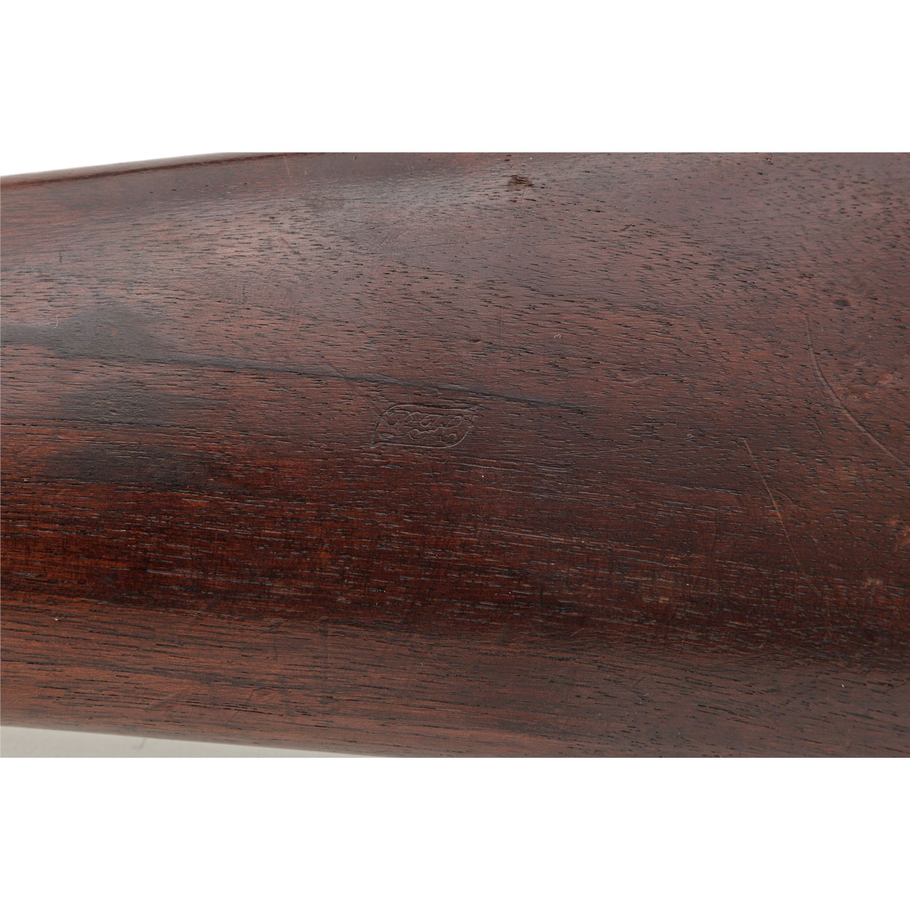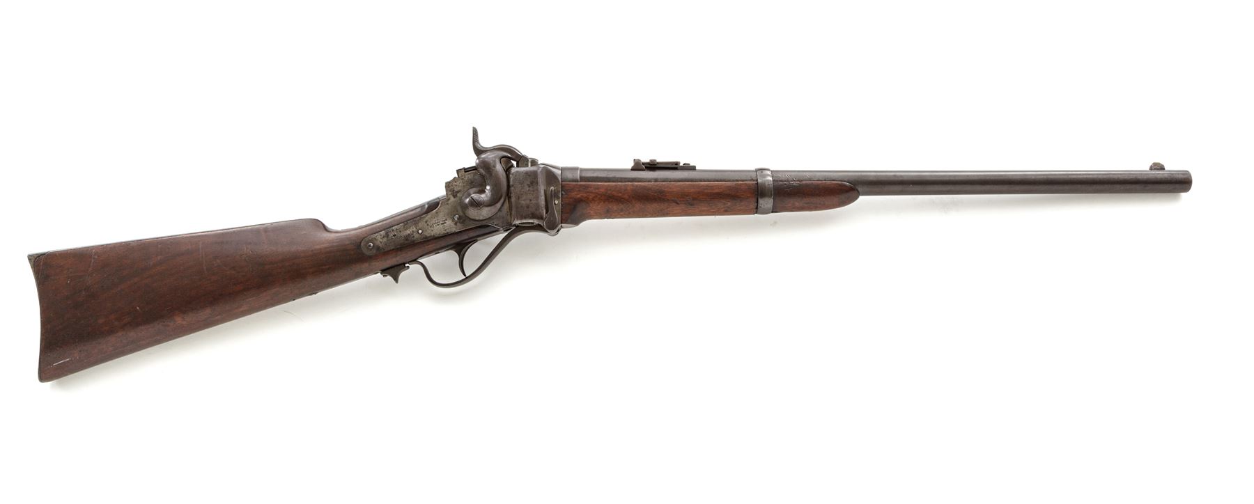 Civil War Sharps New Model 1863 Cavalry Carbine, Factory Altered to Metallic Cartridge, #C,178 (#100178), .50-70 CF cal., blued 22'' barrel with integral block-blade front and Lawrence patent sliding-leaf rear sights marked ''New Model 1863'' ahead of breech and ''10'' (?) at left below; case hardened ''Straight Breech'' receiver is marked ''C. Sharps Pat./Sept. 12th, 1848'' and fitted with a sling bar and ring on left side, and marked ''C. Sharps' Pat./Oct. 16th, 1852'' behind ''R.S. Lawrence Pat./April 12th, 1859'' on right; serpentine operating lever opens the dropping-block action for cartridge loading and cleaning, and automatic ejection; steel single spring-retained barrel band, trigger, and carbine-style buttplate; oil-stained walnut forend and buttstock without patchbox. Mfg'd ca. 1859-66; converted in 1867 and after. Condition is very good, barrel being a smooth bluish-brown, receiver with case colors ahead of hammer and the balance darkened and silvered; sling ring stock mounting with scratched ''WHS'' initials. Factory-replaced buttstock is smooth and sound with minor use marks, and a sharp ''DFC'' (David F. Clark) inspector's cartouche within a ribbon on left side and another (mostly illegible) above sling ring; the original forearm is smooth with a few dings and two minor losses. Sharps markings on barrel and on left receiver were mostly removed at time of alteration. Action functions smoothly; original 6-groove bore is bright with defined rifling. Est.: $1,800-$2,400. (Antique)