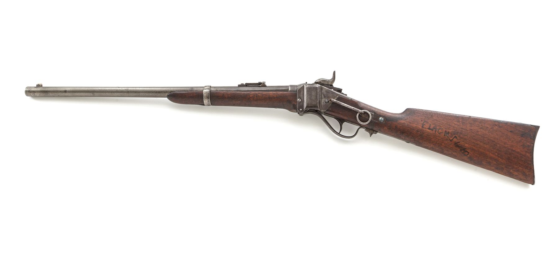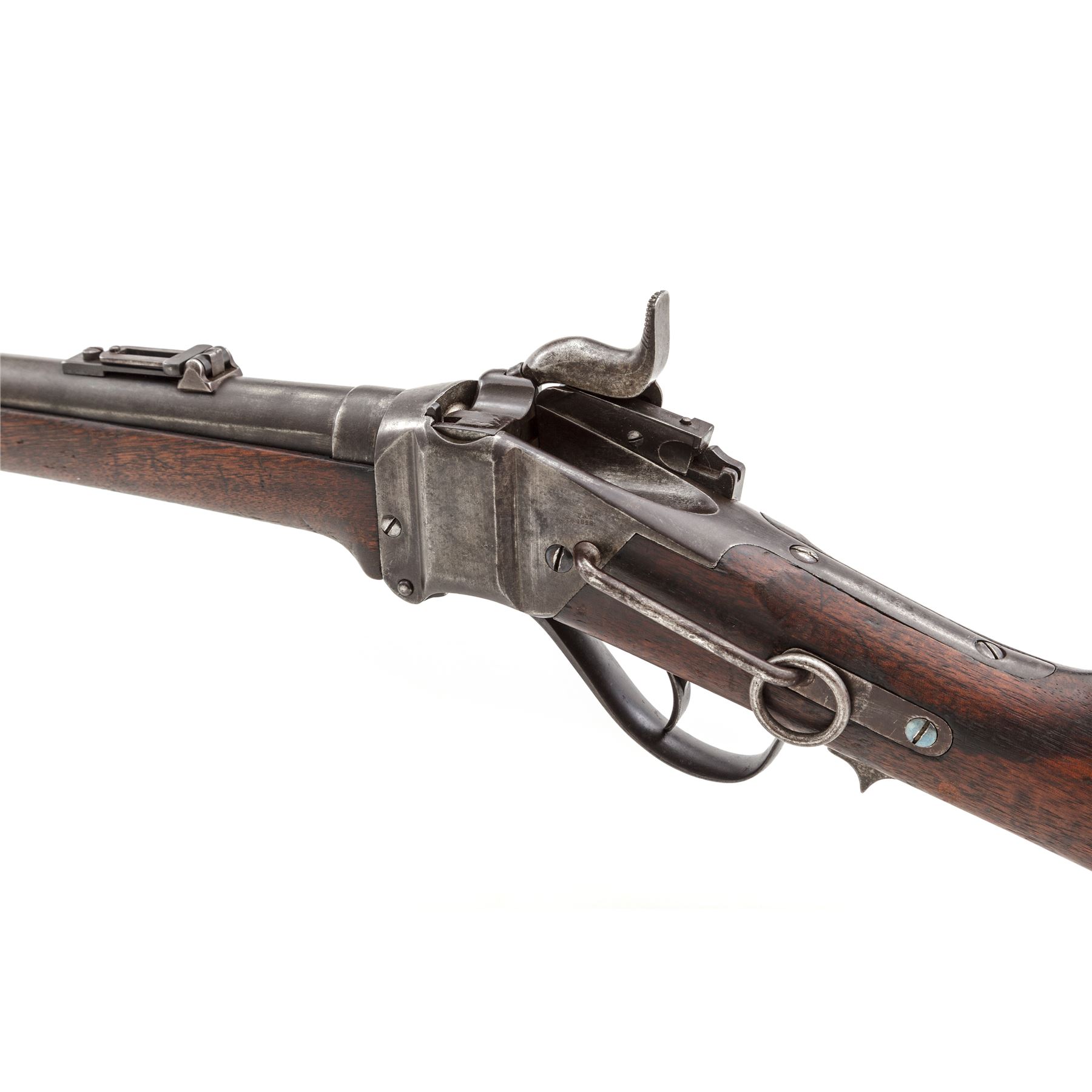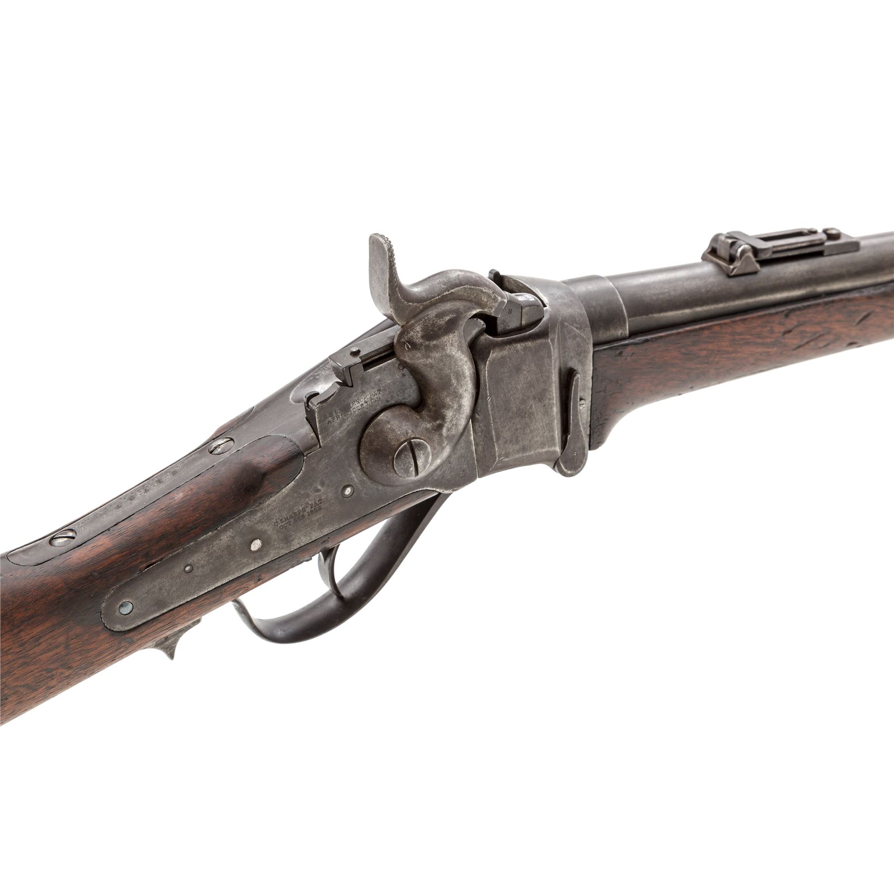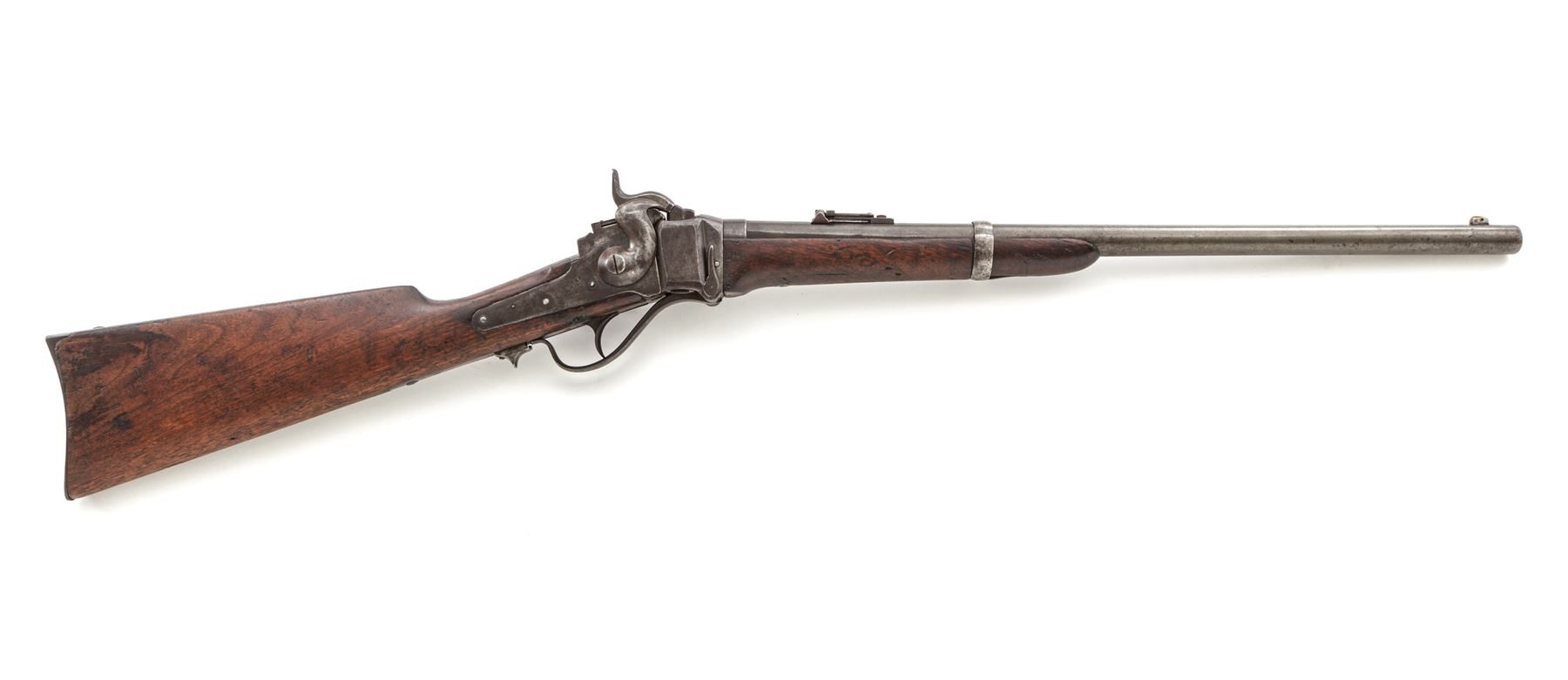 Civil War Sharps New Model 1859 Percussion Cavalry Carbine, #61727, .52 cal., 22'' barrel is marked ''New Model 1859'' on top at breech, has integral block-blade front and Lawrence patent sliding-leaf rear sights; ''Straight Breech'' receiver with integral Sharps pellet-priming system is fitted with a sling bar and ring and marked ''C. Sharps' Pat./Sept. 12th, 1848'' on the left side and ''C. Sharps' Pat./Oct. 16th, 1852'' behind ''R.S. Lawrence Pat./April 12th, 1859'' on right; operating lever opens the dropping-block action for loading paper cartridges and cleaning; single spring-retained steel barrel band, trigger, and carbine-style buttplate; oil-finished walnut forend and buttstock. Mfg'd 1859-66. Condition is very good, the steel parts having an overall smooth gunmetal gray color, the barrel and left-side receiver markings soft. Stocks are sound showing the expected marks from military use and age. Action functions smoothly; bore is clean with deep rifling. Est.: $1,500-$2,000. (Antique)