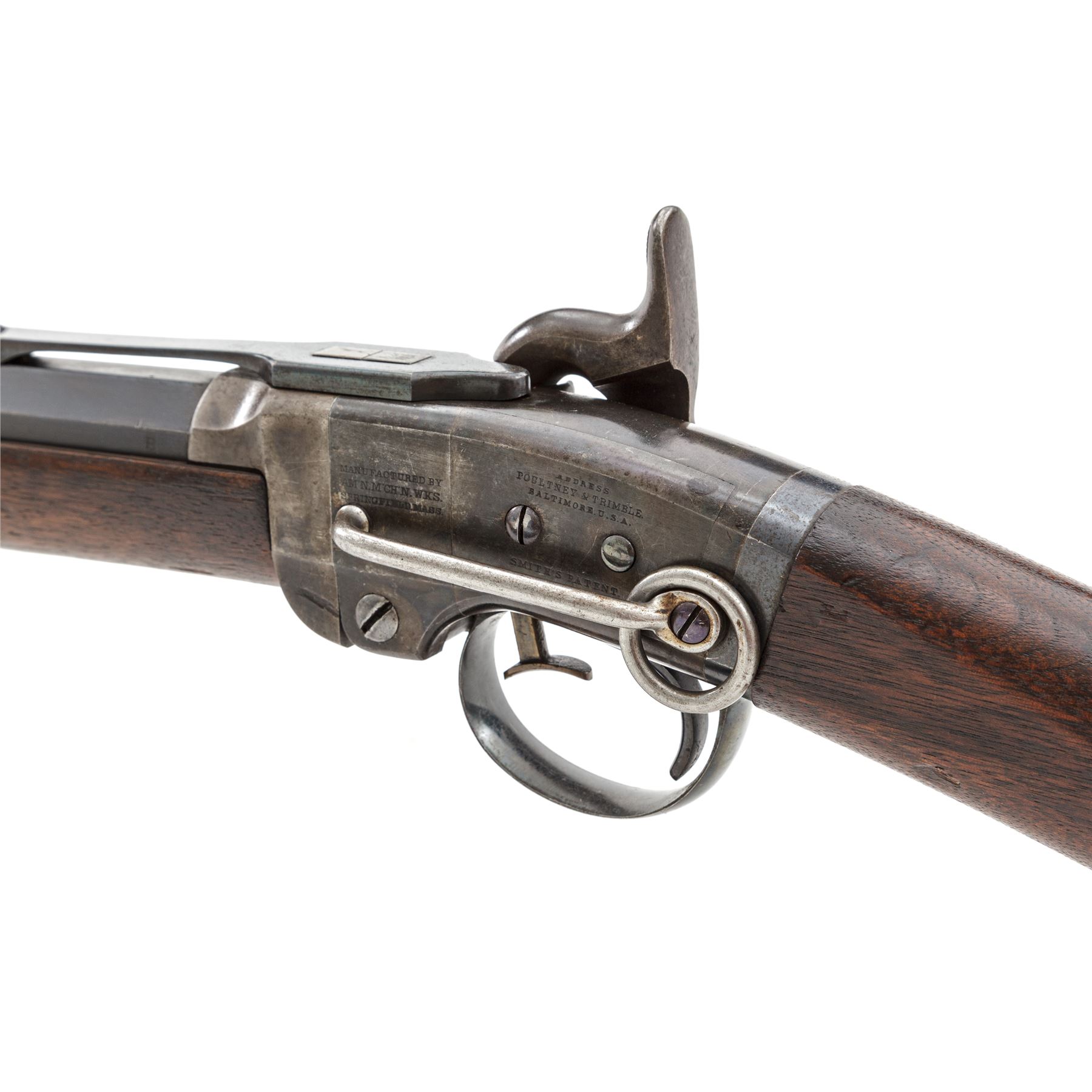 Civil War Smith Percussion Saddle-Ring Cavalry Carbine, #1388, .50 cal., blued 21-5/8'' round-to-octagon barrel with dovetailed blade front and sliding-leaf rear sights; case hardened receiver is marked on its left side ''Manufactured by/Am'n. M'ch'n. Wks./Springfield, Mass.'', ''Address/Poultney & Trimble/Baltimore. U.S.A.'' and mounted with a sling bar and ring; blued steel furniture including single barrel band, loop triggerguard with elongated rear tang, trigger, and carbine buttplate; oil-finished two-piece walnut forend and buttstock. Mfg'd 1861-65; most were issued to Union cavalry regiments. When the latch ahead of the trigger is depressed, the blued steel top spring allows the unique bottom-hinged action to break open for loading and cleaning. Condition is excellent, probably unfired, the barrel retaining 97% soft military blue; the top spring, triggerguard and buttplate with most of their deep blue, and the receiver and hammer showing softly mottled case colors. Stocks are solid and mostly smooth, showing only light marks from use and age; buttstock is marked ''H.J'' on left wrist and ''B'' on right. Action is crisp and tight; bore is brilliant with sharp rifling. Est.: $2,000-$3,000. (Antique)
