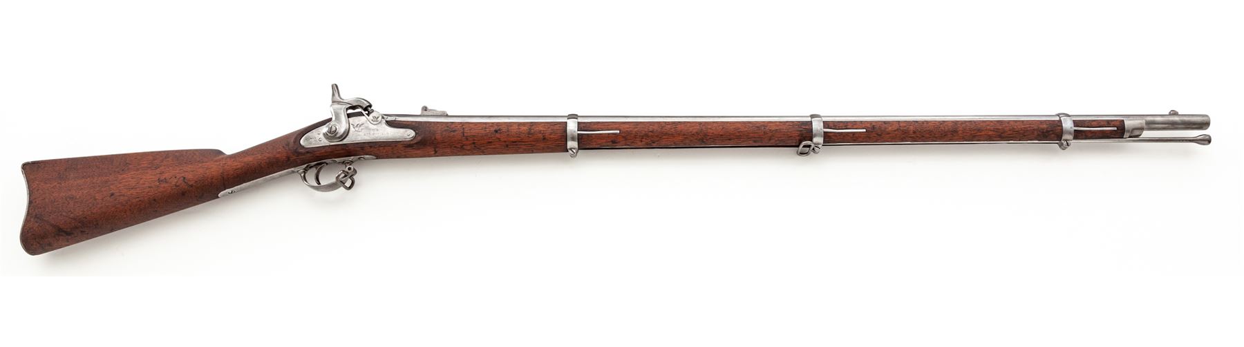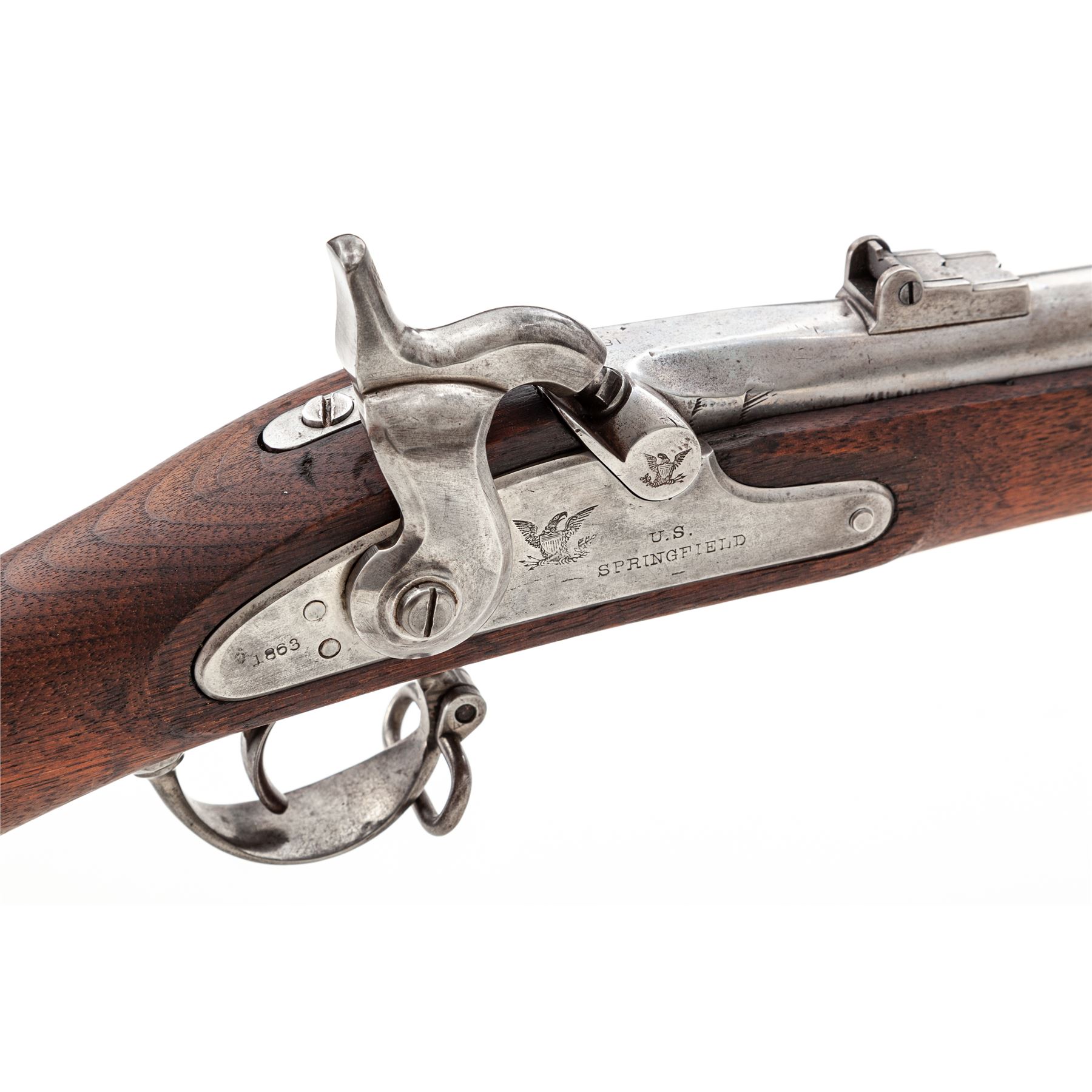 Civil War Springfield Model 1863 Percussion Infantry Rifle-Musket, Type I, NVSN, .58 cal., 40'' barrel with block-blade front sight (doubles as a bayonet lug) and 2-leaf rear sight, marked ''V/P/(eagle head)'' and ''1863'' at breech; flat beveled lockplate is marked ''(spread-wing eagle)'' to left of ''U.S./Springfield'' under nipple bolster stamped with a spread-wing eagle, and ''1863'' to rear; iron furniture including three spring-retained barrel bands (middle with sling swivel), two-piece triggerguard with sling swivel at front, curved rifle buttplate, and tulip-head ramrod. Mfg'd ca. 1863. Condition is near fine, the metal surfaces having a clean ''arsenal-bright'' finish with sharp edges and markings, and the oil-stained walnut fullstock being solid with only minor handling marks, nice color, and two military inspectors' marks to left of lock: ''GH'' (George Haines) within a rectangle and ''ESA'' (Master Armorer Erskine S. Allin) within an oval cartouche. Action is strong; bore is clean with distinct rifling. Est.: $700-$1,200. (Antique)