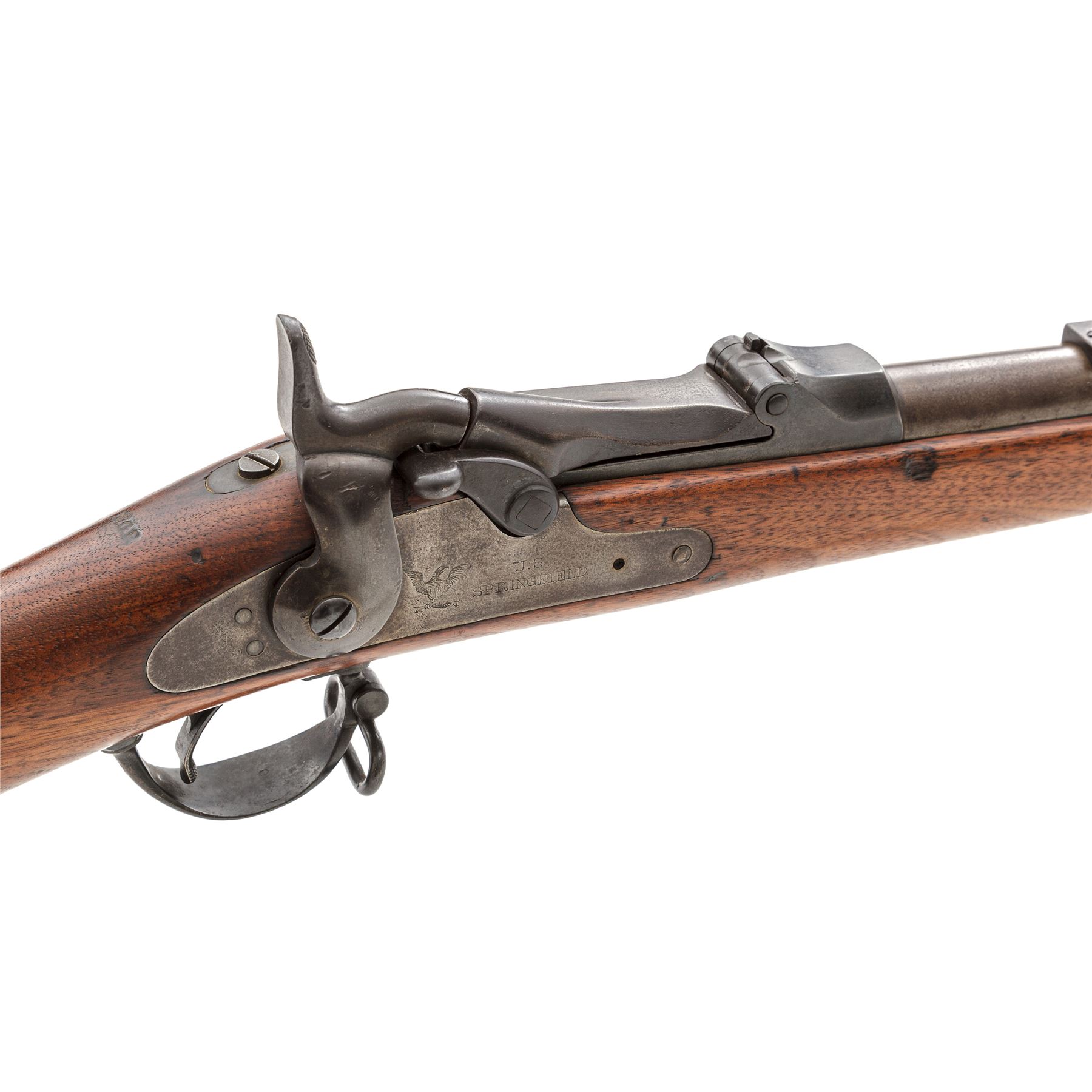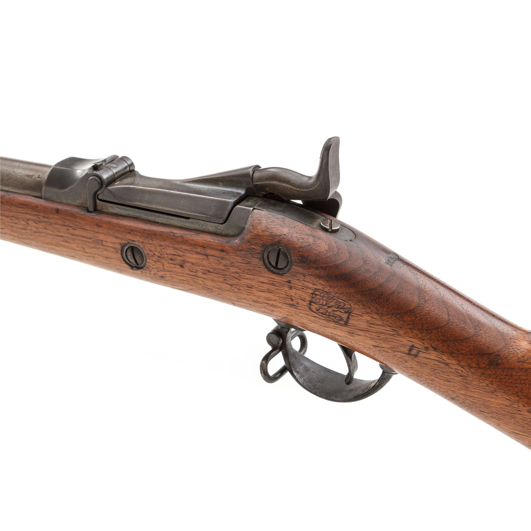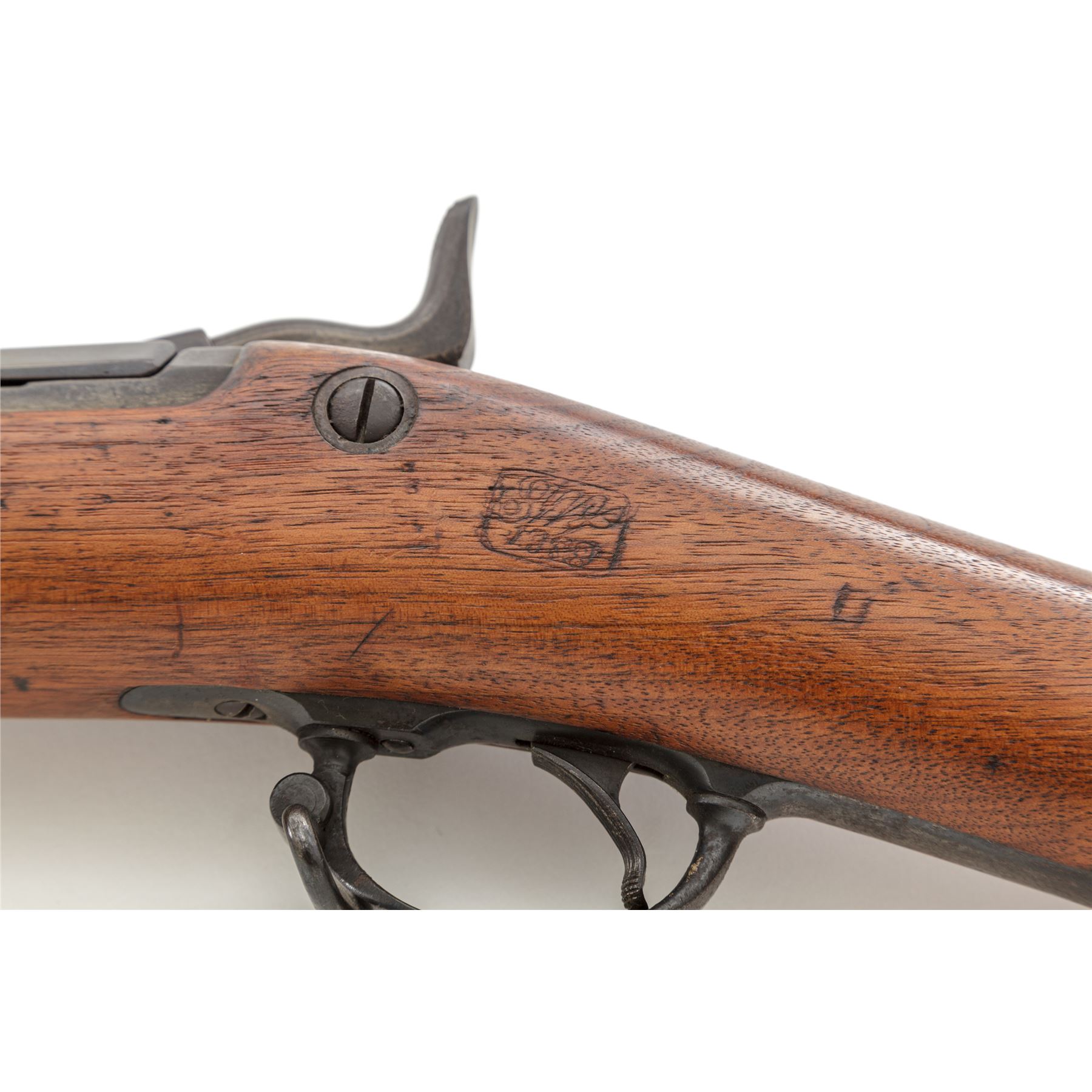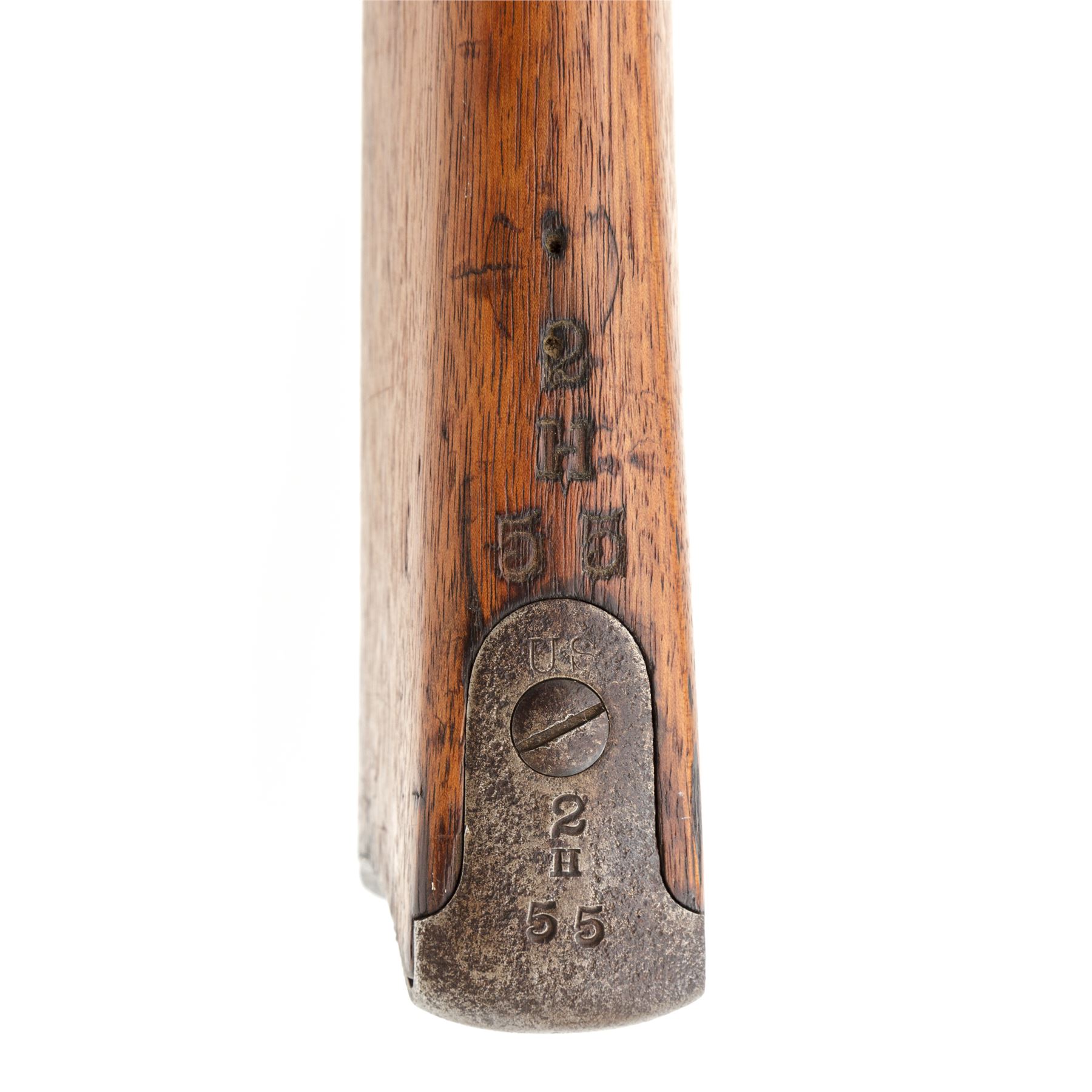 Indian Wars U.S. Springfield Model 1884 Trapdoor Infantry Rifle, #387446, .45-70 Gov't. cal., 32-5/8'' barrel is marked ''V/P/(eaglehead)/P'' and ''A'' at breech and fitted with block-blade front sight (also serves as a bayonet lug) and Buffington adjustable rear sight; flat lockplate is marked ''(spread eagle)'' to left of ''U.S./Springfield'' beneath trapdoor latch; steel furniture including two spring-retained barrel bands (top with stacking swivel), two-piece triggerguard (with sling swivel at front), buttplate marked ''US'' and ''2/H/55'' on top tang, nosecap, slotted button-head steel cleaning rod; one-piece oil-stained walnut fullstock deeply struck ''2/H/55'' ahead of buttplate tang. Mfg'd 1888. Condition is very good, the barrel a gunmetal-brown patina having scattered light dings between top band and muzzle, balance of the metal a dark gunmetal gray showing traces of case hardening, buttplate with cleaned erosion. All markings are clear. Stock is smooth and solid with nice color and a crisp ''SWP/1888'' cartouche of armory inspector Samuel W. Porter at left wrist and an encircled ''P'' on belly. Action is strong and smooth; bore is clean with distinct rifling. Est.: $500-$800. (Antique)