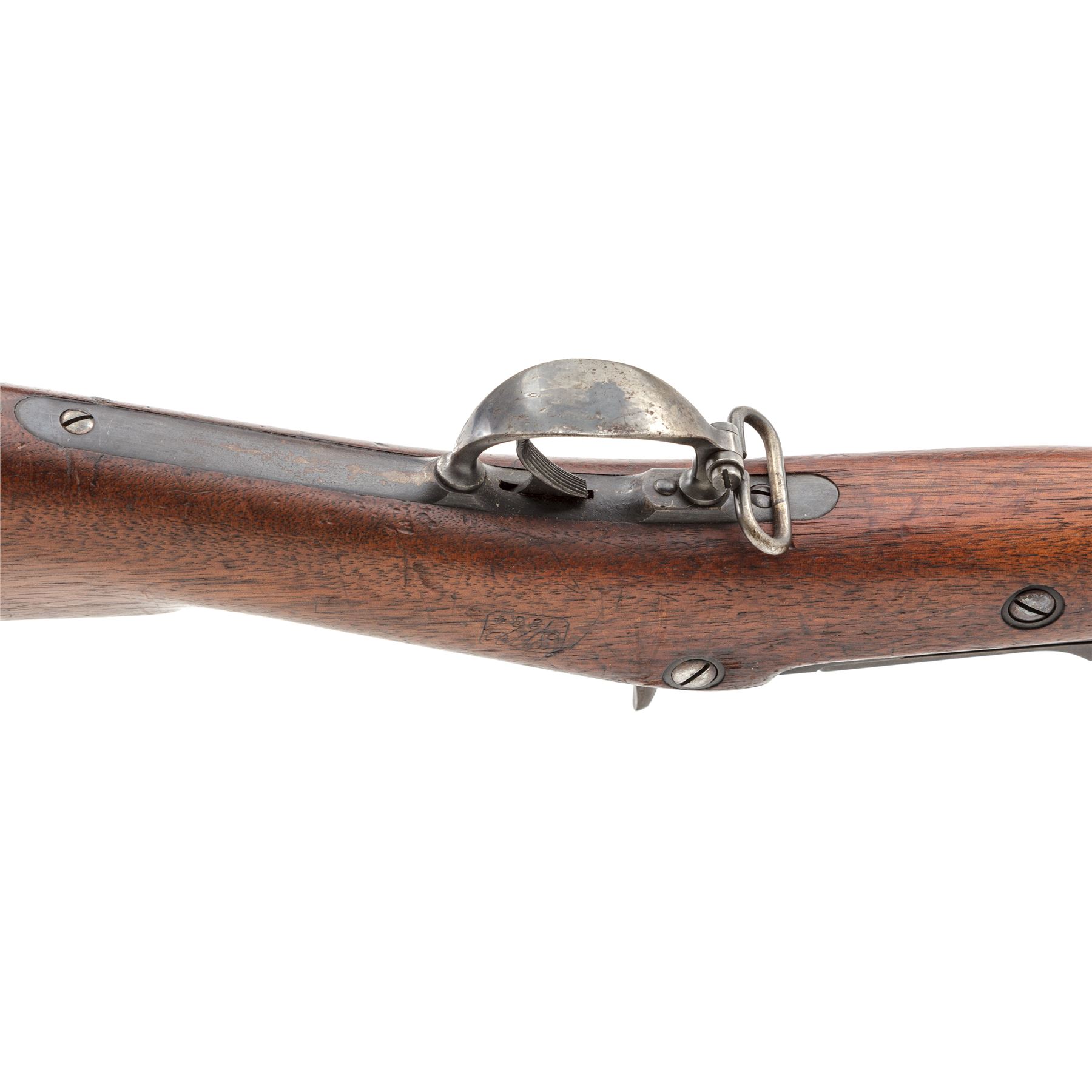 Indian Wars U.S. Springfield Model 1873 Trapdoor Infantry Rifle, #256005, .45-70 Gov't. cal., 32-5/8'' barrel is marked ''V/P/(eaglehead)/P'' and ''P'' at breech with integral block-blade front sight (doubles as bayonet lug) and long-range adjustable rear sight (correctly marked ''R'' for Rifle); flat lockplate is marked ''(spread eagle)'' to left of ''U.S./Springfield'' beneath trapdoor latch; steel furniture including two spring-retained barrel bands (top with sling swivel), two-piece triggerguard with sling swivel, buttplate marked ''US'' on top tang, nosecap, slotted button-head cleaning rod; one-piece oil-finished walnut fullstock. Condition is very good, the barrel with a smooth brownish-blue patina and balance of the metal gunmetal gray with all markings sharp. Stock is smooth and solid with the expected light marks of military use and a very clear ''SWP/1884'' cartouche of armory inspector Samuel W. Porter at left wrist. Action is strong and smooth; bore is shiny with sharp rifling. Est.: $800-$1,200. (Antique)