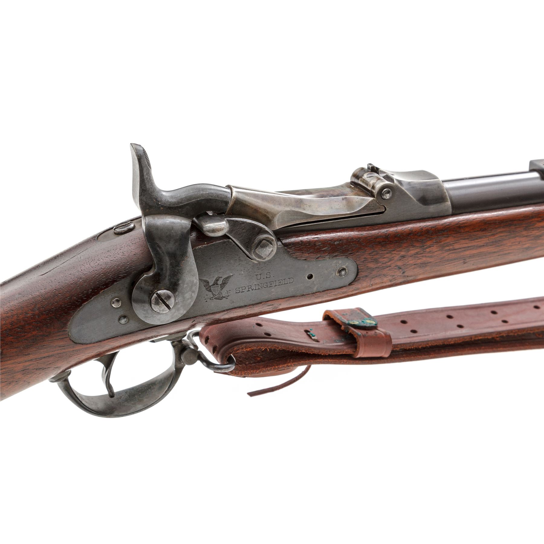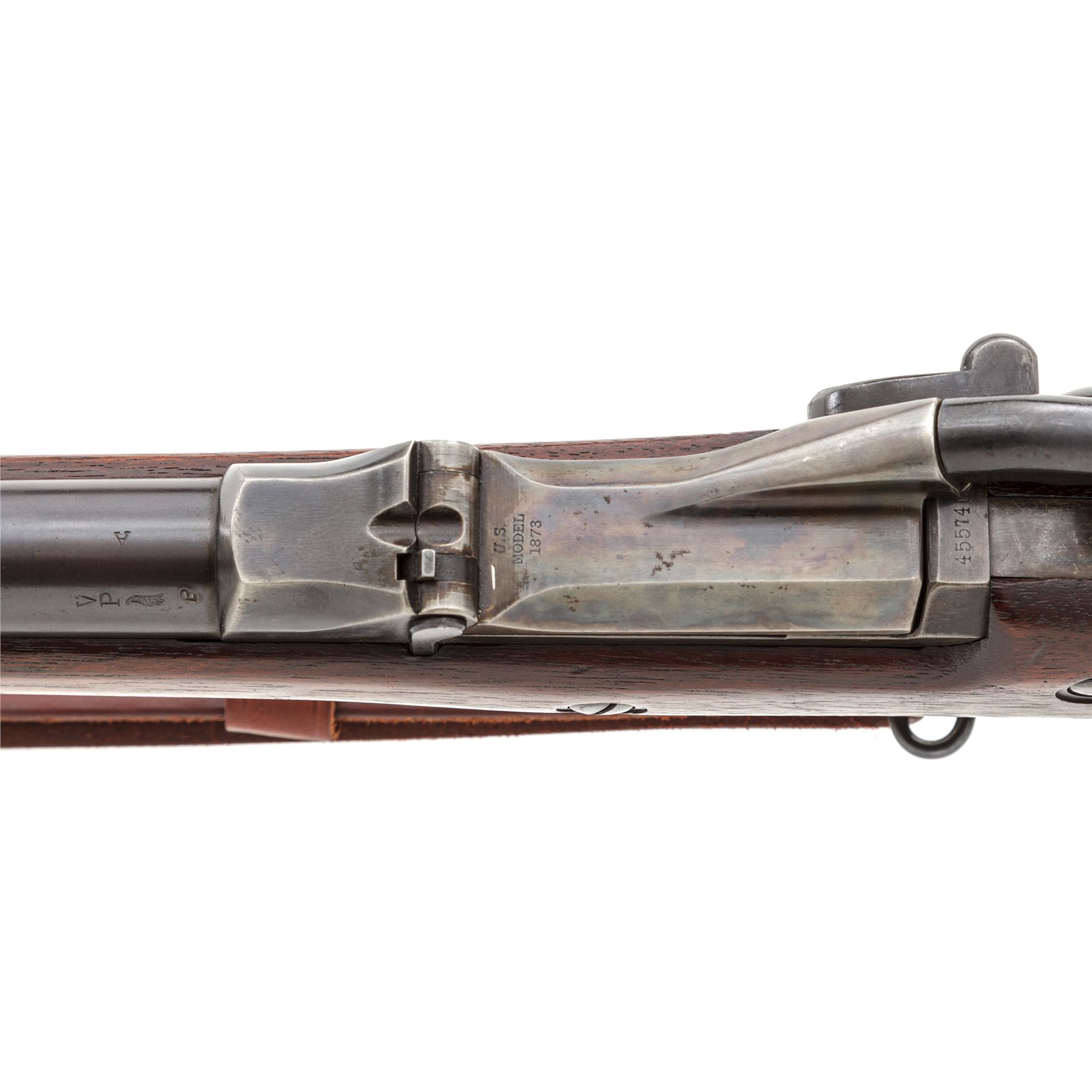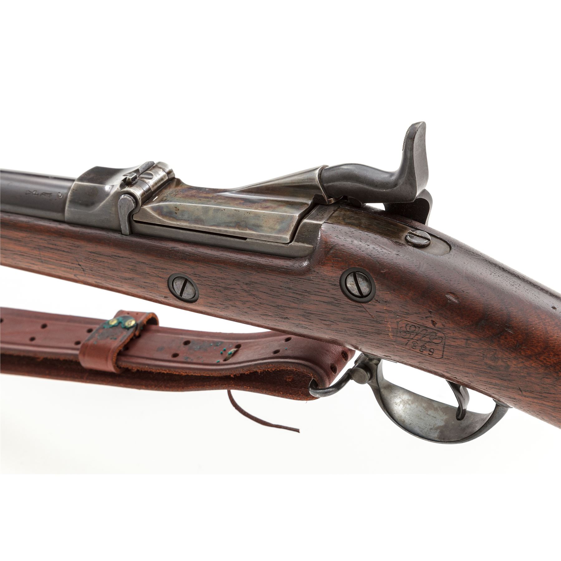U.S. Springfield Model 1873 Trapdoor Infantry Rifle, with 1877 improvements and leather sling, #455746, .45-70 Gov't CF cal., 32-5/8'' round barrel with block-blade front sight and Buffington rear sight (correctly marked ''R'' for Rifle) marked ''V/P/(eaglehead)/P'' and ''A'' at breech; trapdoor breechblock is correctly marked ''U.S./Model/1873'' in three lines at hinge; flush-mounted lockplate with a spread-wing eagle clutching olive branches and ''US/Springfield'' ahead of hammer; correct two-piece triggerguard with sling swivel at front; steel furniture including two spring-retained barrel bands (top band with stacking swivel), buttplate marked ''US'' at tang screw, one-piece ramrod with button tip; period-correct checkered iron pistol grip added behind triggerguard tang. Oil-stained walnut fullstock with ''SWP/1889'' (armory inspector Samuel W. Porter) rectangular cartouche on left side, encircled ''P'' proof and ''B'' behind pistol grip. Mfg'd ca. 1889-93. Condition is fine and all original, with sharp edges and markings, the barrel retaining a smooth deep military blue finish with cleaned erosion at top of muzzle; the lockplate, triggerguard, nose cap, barrel bands and springs with deep glossy blue, breechblock and tang showing lovely case colors, buttplate showing blue amid light scattered discoloration, pistol-grip gunmetal gray. Stock is solid and smooth with sharp edges, only minor marks, fits ''proud'' and has the correct reddish color. Action is strong and smooth; bore is bright with deep rifling. Russet leather sling is a well-made modern reproduction. Est.: $600-$900. (Antique)