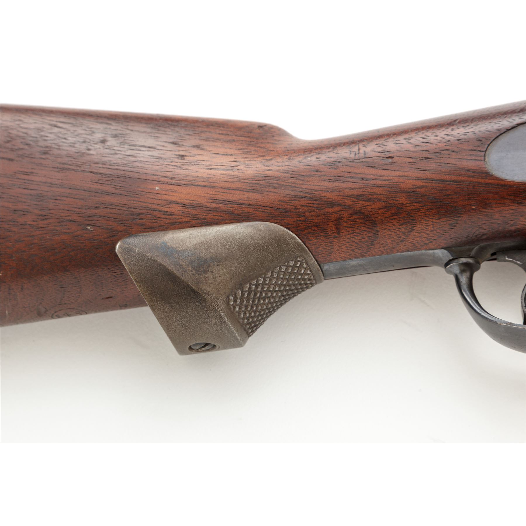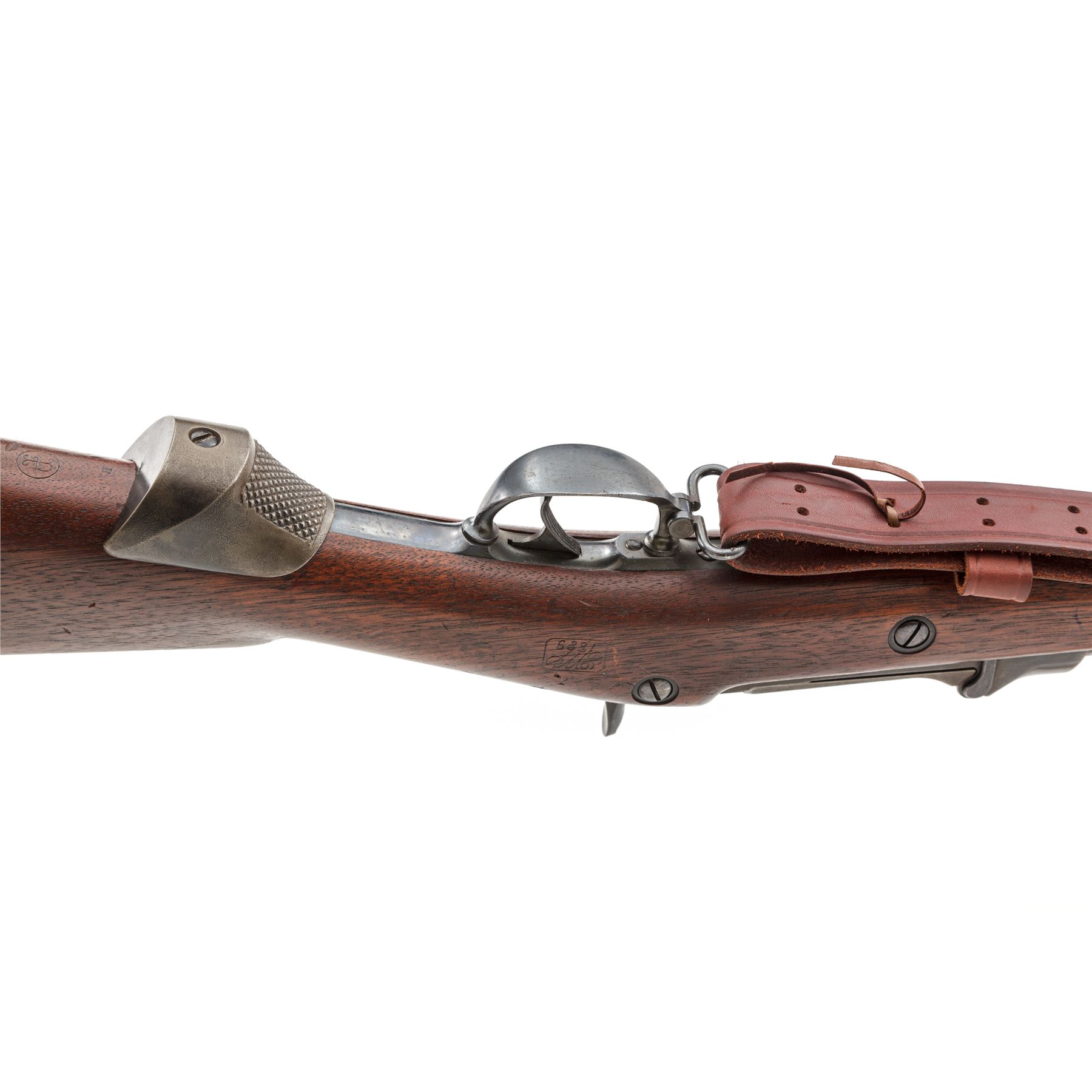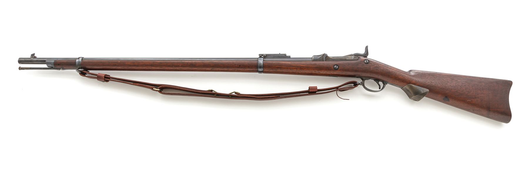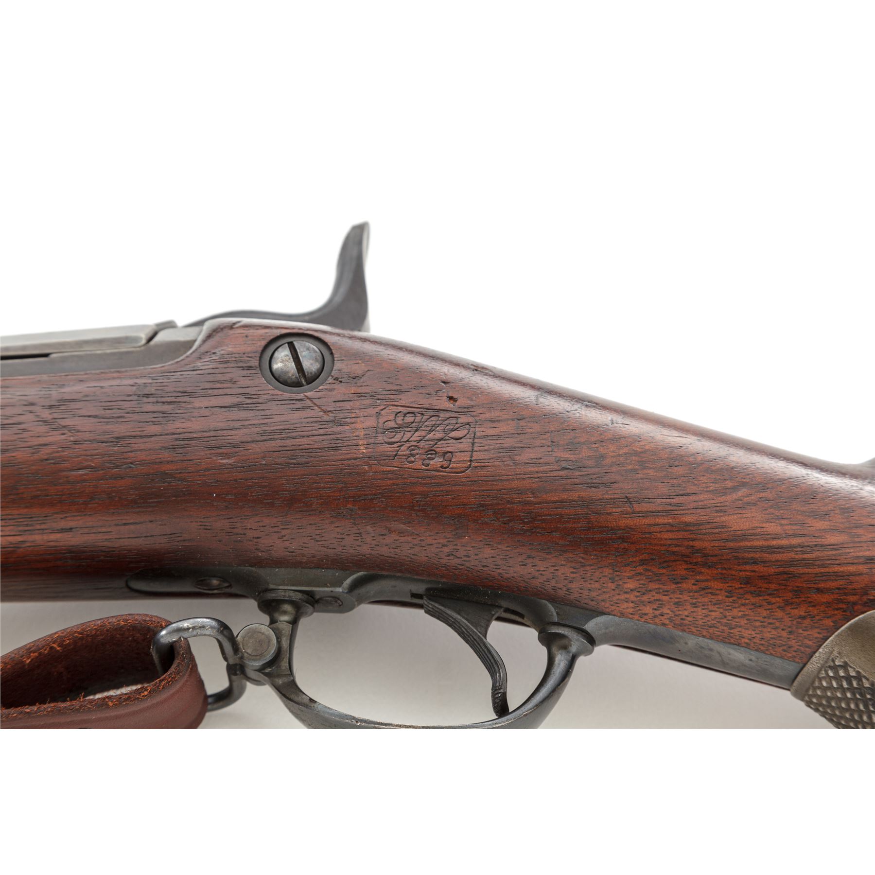 U.S. Springfield Model 1873 Trapdoor Infantry Rifle, with 1877 improvements and leather sling, #455746, .45-70 Gov't CF cal., 32-5/8'' round barrel with block-blade front sight and Buffington rear sight (correctly marked ''R'' for Rifle) marked ''V/P/(eaglehead)/P'' and ''A'' at breech; trapdoor breechblock is correctly marked ''U.S./Model/1873'' in three lines at hinge; flush-mounted lockplate with a spread-wing eagle clutching olive branches and ''US/Springfield'' ahead of hammer; correct two-piece triggerguard with sling swivel at front; steel furniture including two spring-retained barrel bands (top band with stacking swivel), buttplate marked ''US'' at tang screw, one-piece ramrod with button tip; period-correct checkered iron pistol grip added behind triggerguard tang. Oil-stained walnut fullstock with ''SWP/1889'' (armory inspector Samuel W. Porter) rectangular cartouche on left side, encircled ''P'' proof and ''B'' behind pistol grip. Mfg'd ca. 1889-93. Condition is fine and all original, with sharp edges and markings, the barrel retaining a smooth deep military blue finish with cleaned erosion at top of muzzle; the lockplate, triggerguard, nose cap, barrel bands and springs with deep glossy blue, breechblock and tang showing lovely case colors, buttplate showing blue amid light scattered discoloration, pistol-grip gunmetal gray. Stock is solid and smooth with sharp edges, only minor marks, fits ''proud'' and has the correct reddish color. Action is strong and smooth; bore is bright with deep rifling. Russet leather sling is a well-made modern reproduction. Est.: $600-$900. (Antique)
