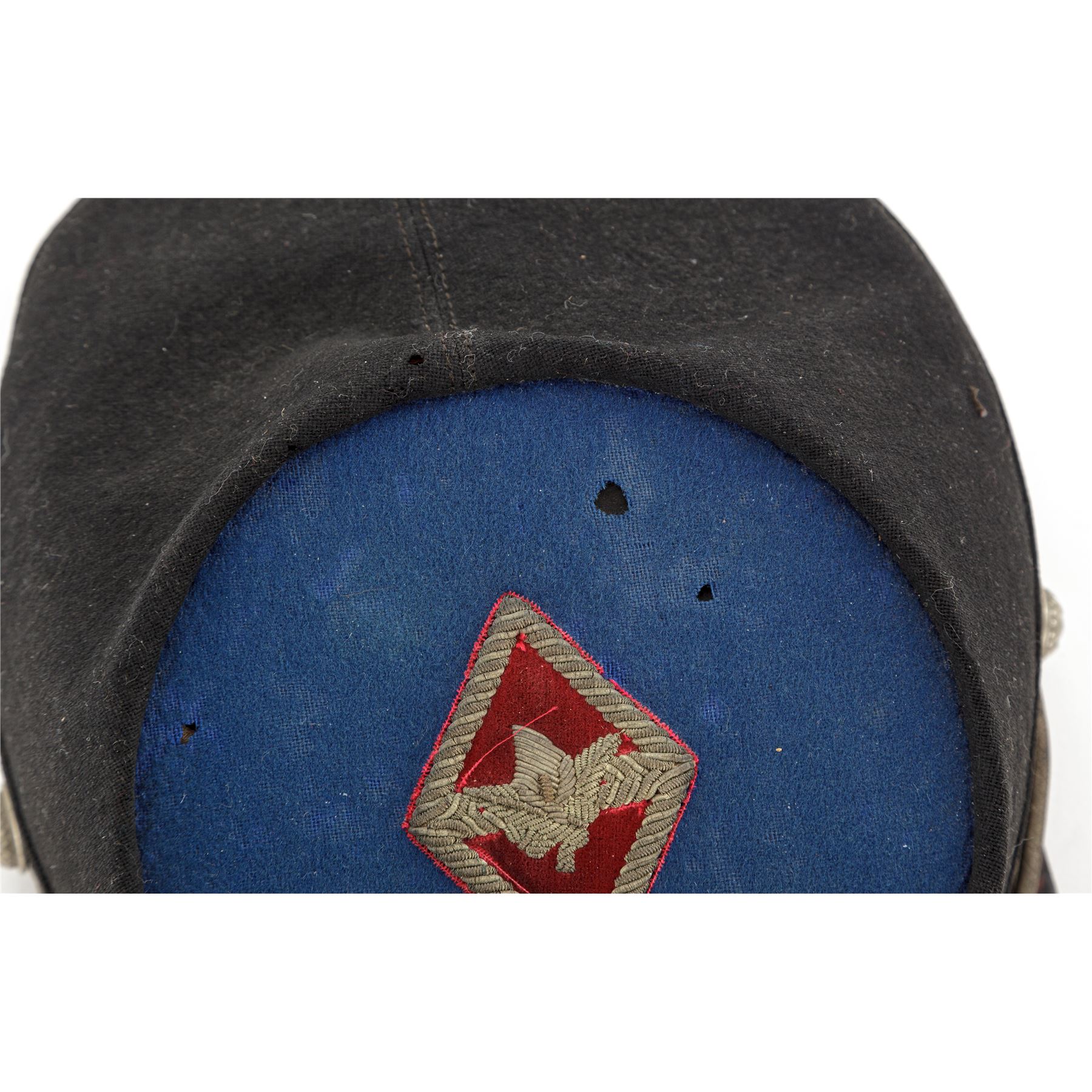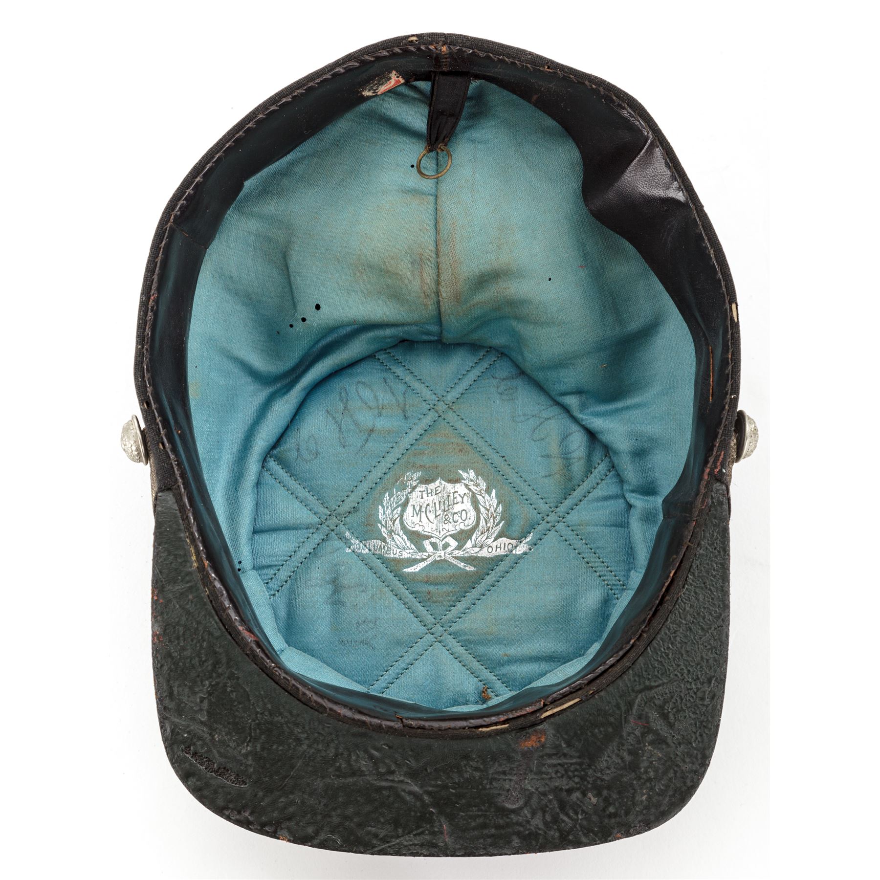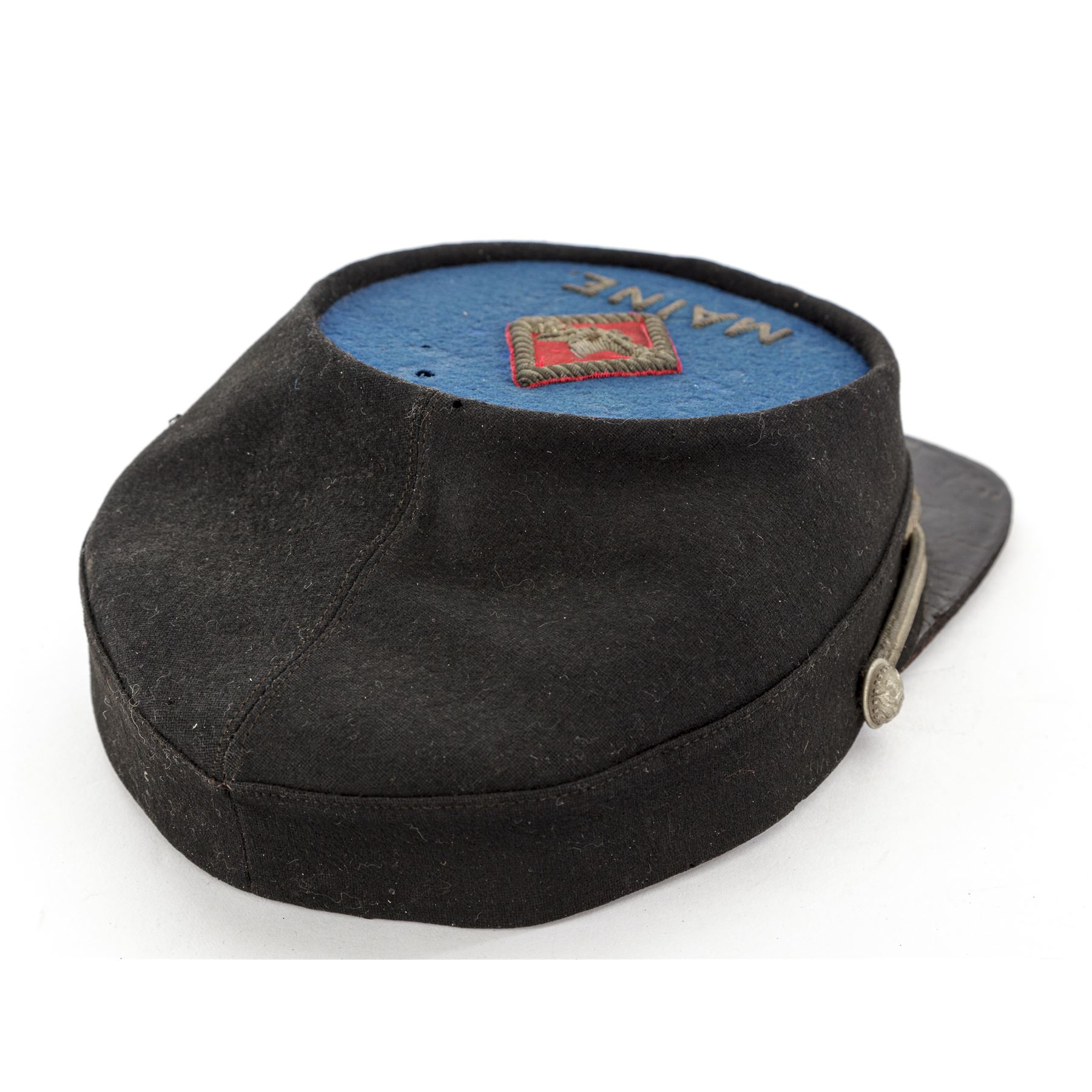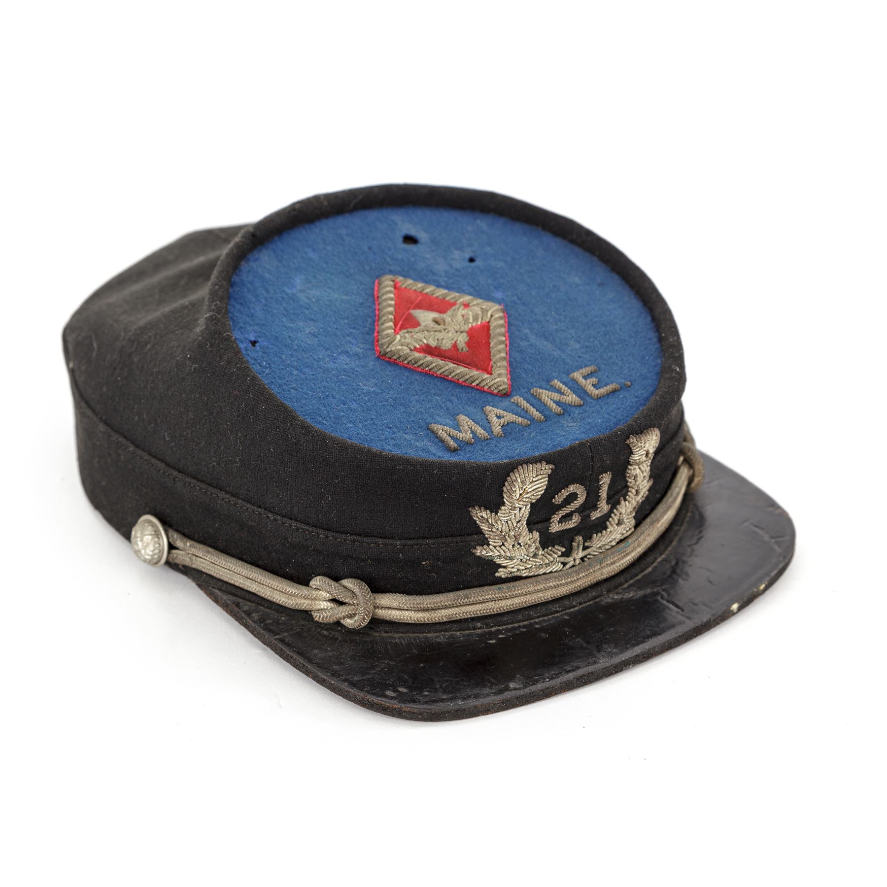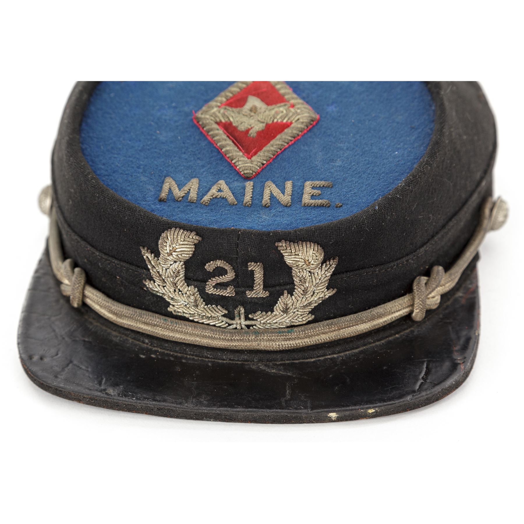 Post-Civil War GAR Officer's Kepi for the 21st Maine Regt., that could date from 1865 to 1900. Black wool body with blue wool top, silver eagle buttons, and silver bullion cord chinstrap. Front has heavy silver bullion embroidered laurel wreath with embroidered numbers ''21'' in the center. Top panel has a red wool diamond with heavy silver bullion embroidered border and device in center. The word ''MAINE'' is embroidered below the diamond. Visor is thick black patent leather. Inside has a thin patent leather sweat band, and blue silk lining with a silver printed maker's mark in the center of ''The McLilley & Co.''. There are faint handwritten initials written in top section of inside lining, a bit hard to read, but looks like ''C H W''. Worthy of further research. Small paper-size tag is mostly gone. Condition is very good for a hat of this age, showing some moth holes to the top edge, front of the body, and blue wool center. Outside material has some wear and thinning, but is very sound. Silver bullion embroidery shows age darkening to the silver and remains tight and intact. Silver bullion chinstrap shows age and soiling. There are creases and surface crazing to the patent leather visor on top and bottom. Silk lining shows a few scattered moth nips and soiling from use. Sweat band is in good condition with a slight detachment near the front. The 21st Maine mustered in Oct. 14, 1862 for 9 months service under Col. Elijah D. Johnson. They participated in operations against Port Hudson, Baton Rouge, and Plains Store, and served duty in the advance, assaults, siege, and final surrender of Port Hudson on July 8, 1863. On July 24, 1863 the regiment was ordered home, and were mustered out on August 25, 1863. Est.: $600-$800.