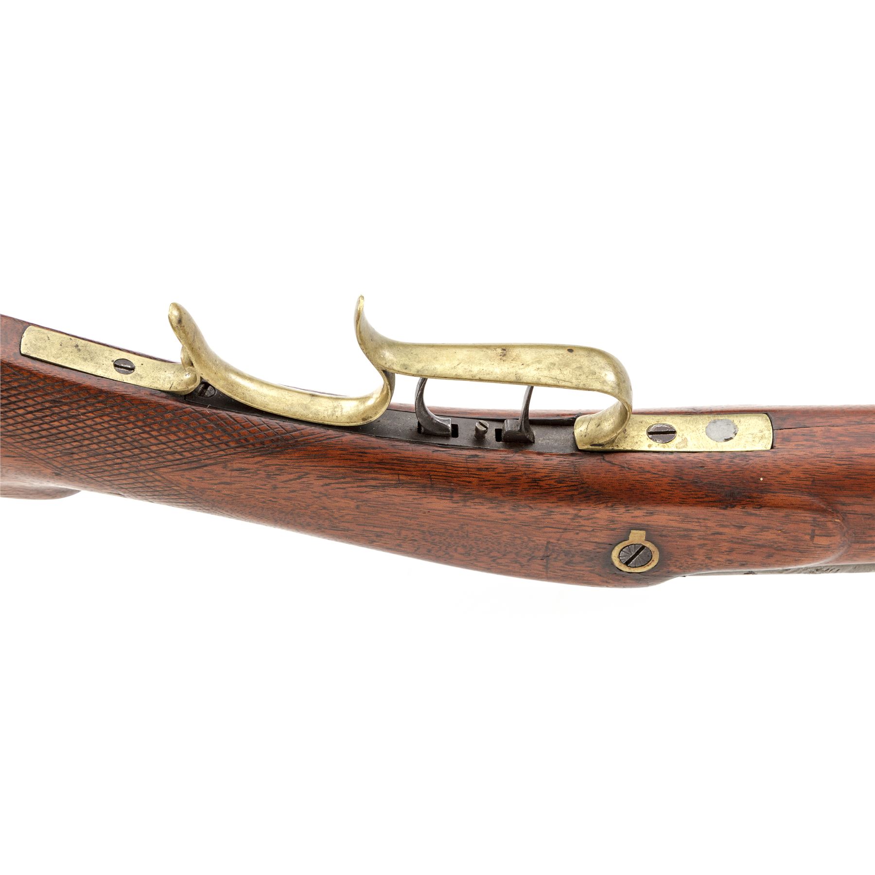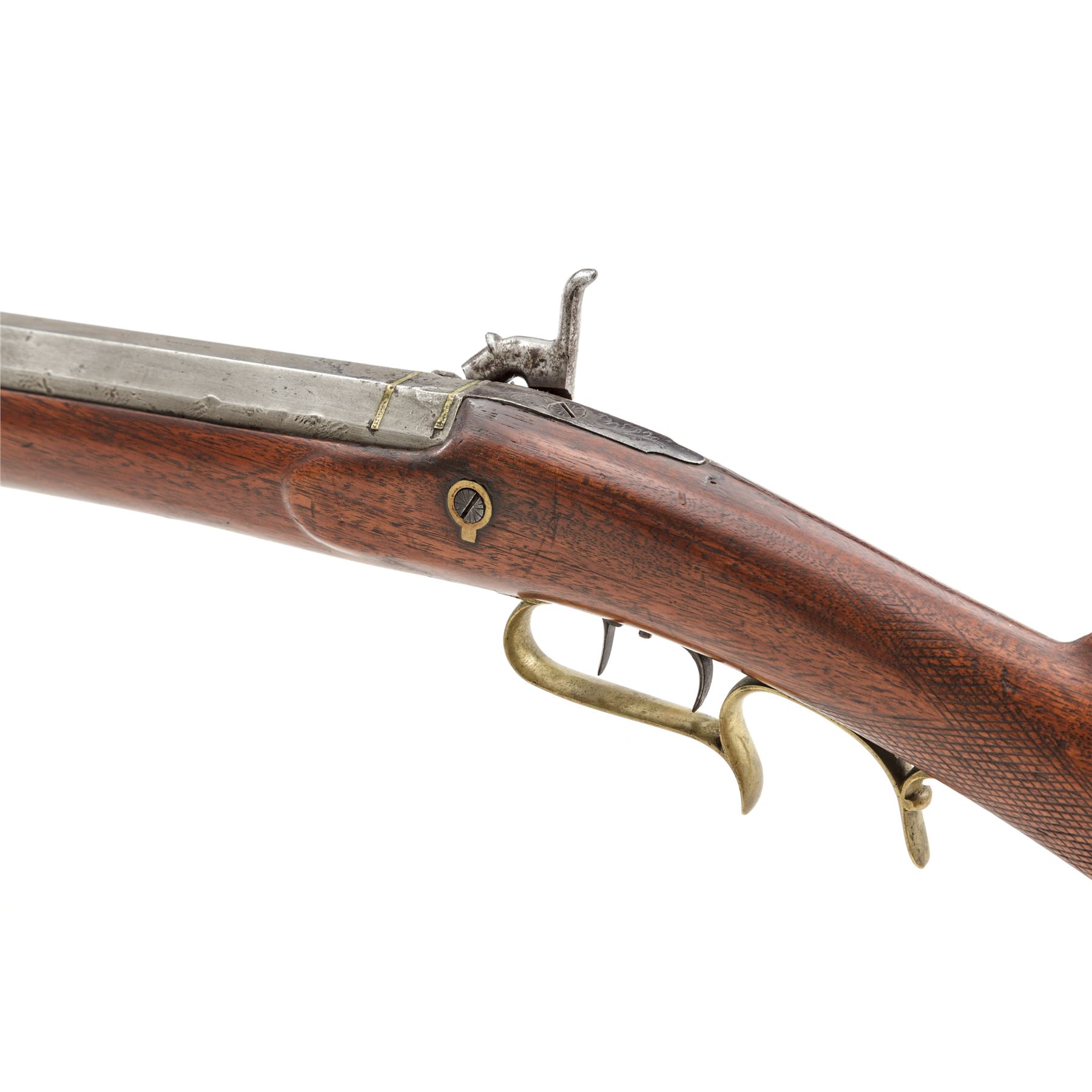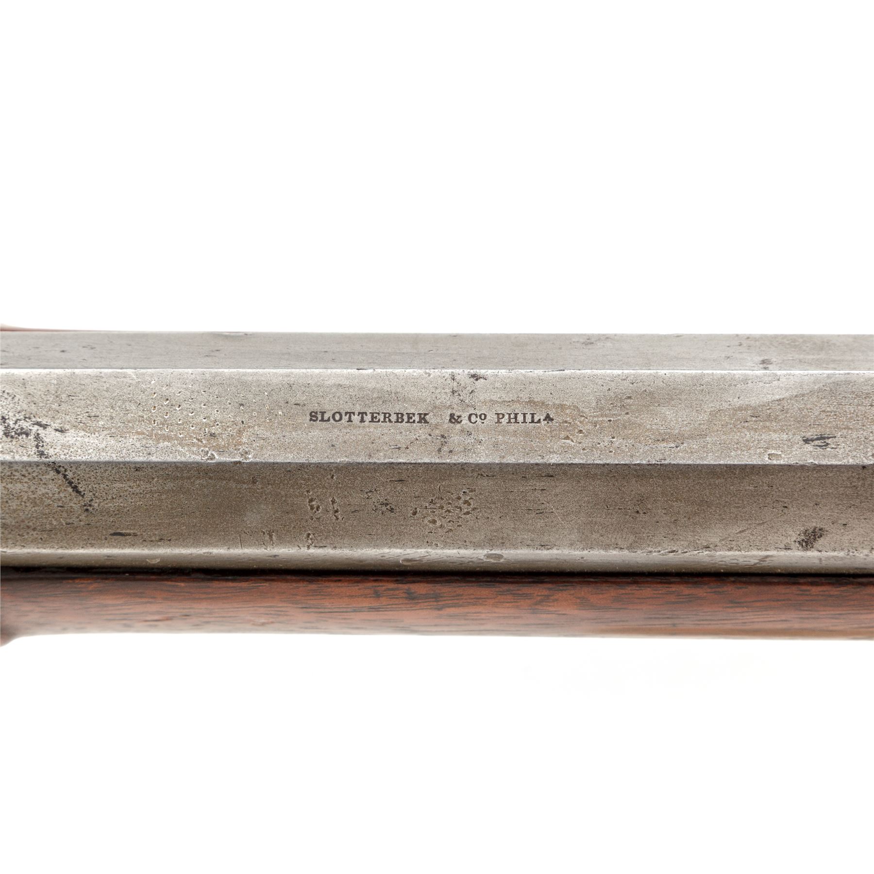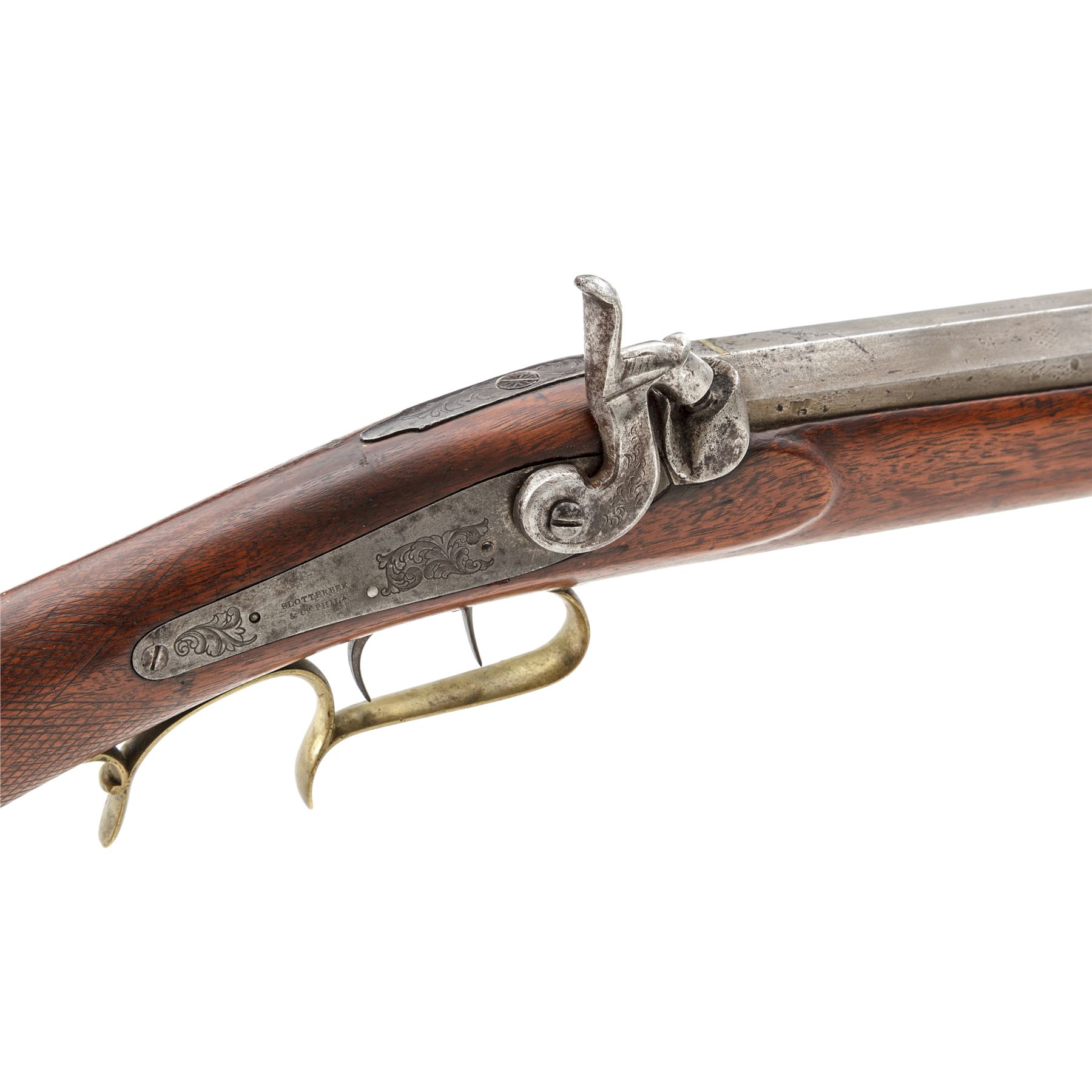 Antique American Percussion Heavy Barrel Plains or Buffalo Rifle, by Slotterbek & Co., Phila., NVSN, approx. .54 cal., 35'' heavy octagonal barrel with dovetailed blade front and buckhorn rear sights marked ''Slotterbek & Co. Phila.'' on top flat, has two platinum bands at breech and a floral engraved top tang; serpentine lockplate is marked ''Slotterbek/& Co. Phila.'' between two floral engraved areas behind hammer; double set triggers; brass scrolled triggerguard with rear finger rest and crescent buttplate having a separate bottom tang; oil-stained walnut halfstock with carved cheekpiece, checkering at wrist, a single barrel key with German silver oval escutcheons, and German silver nose cap; brass-tipped hardwood ramrod retained by two iron ferrules. Mfg'd ca. 1850s-60s. Condition is very good, the steel parts being a smooth gunmetal gray with sharp edges, clear markings, and light black powder pitting at breech; the brass a light age patina. Stock is solid and smooth with good checkering, pleasing color and perhaps a later satin finish; the lower buttplate tang in need of re-fitting. Action functions; bore is shiny with deep rifling. The product of a well-known maker, this is the type of plain, sturdy and serviceable rifle that would have been carried by the buffalo trade and other pioneer market hunters. Est.: $2,500-$3,500. (Antique)