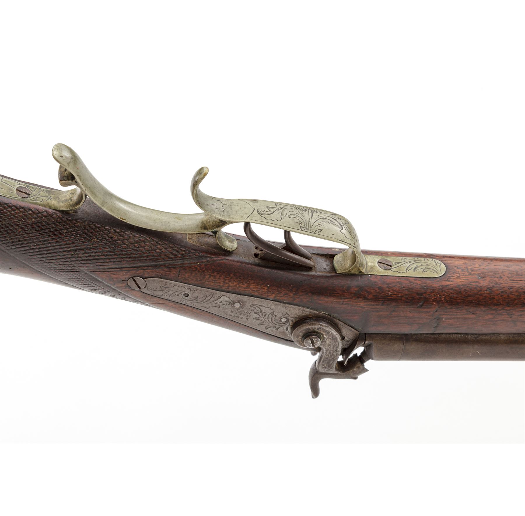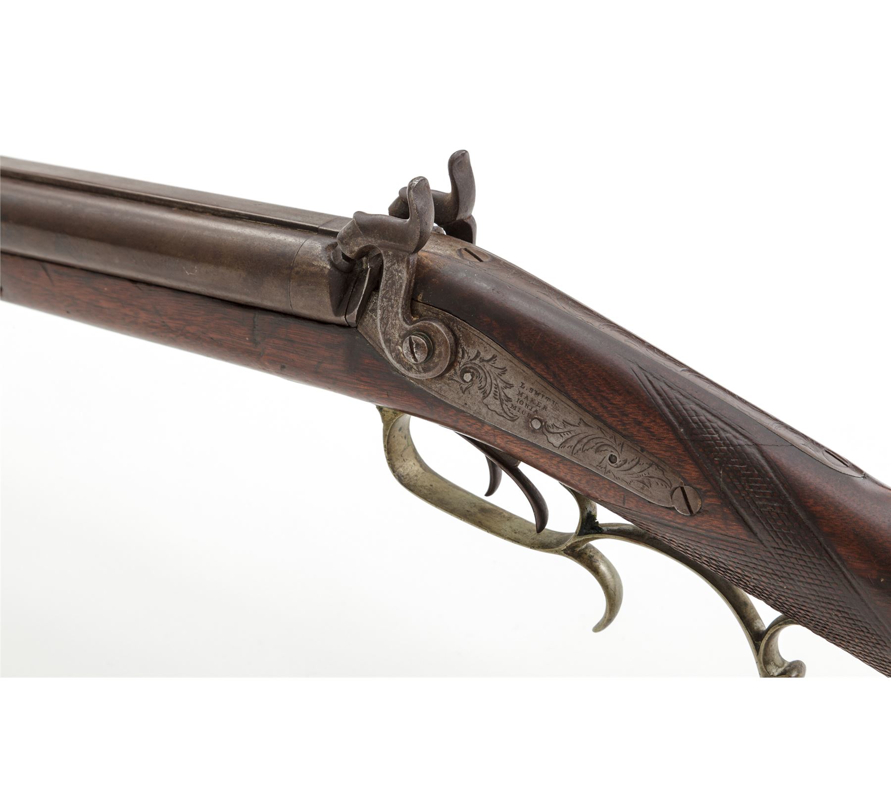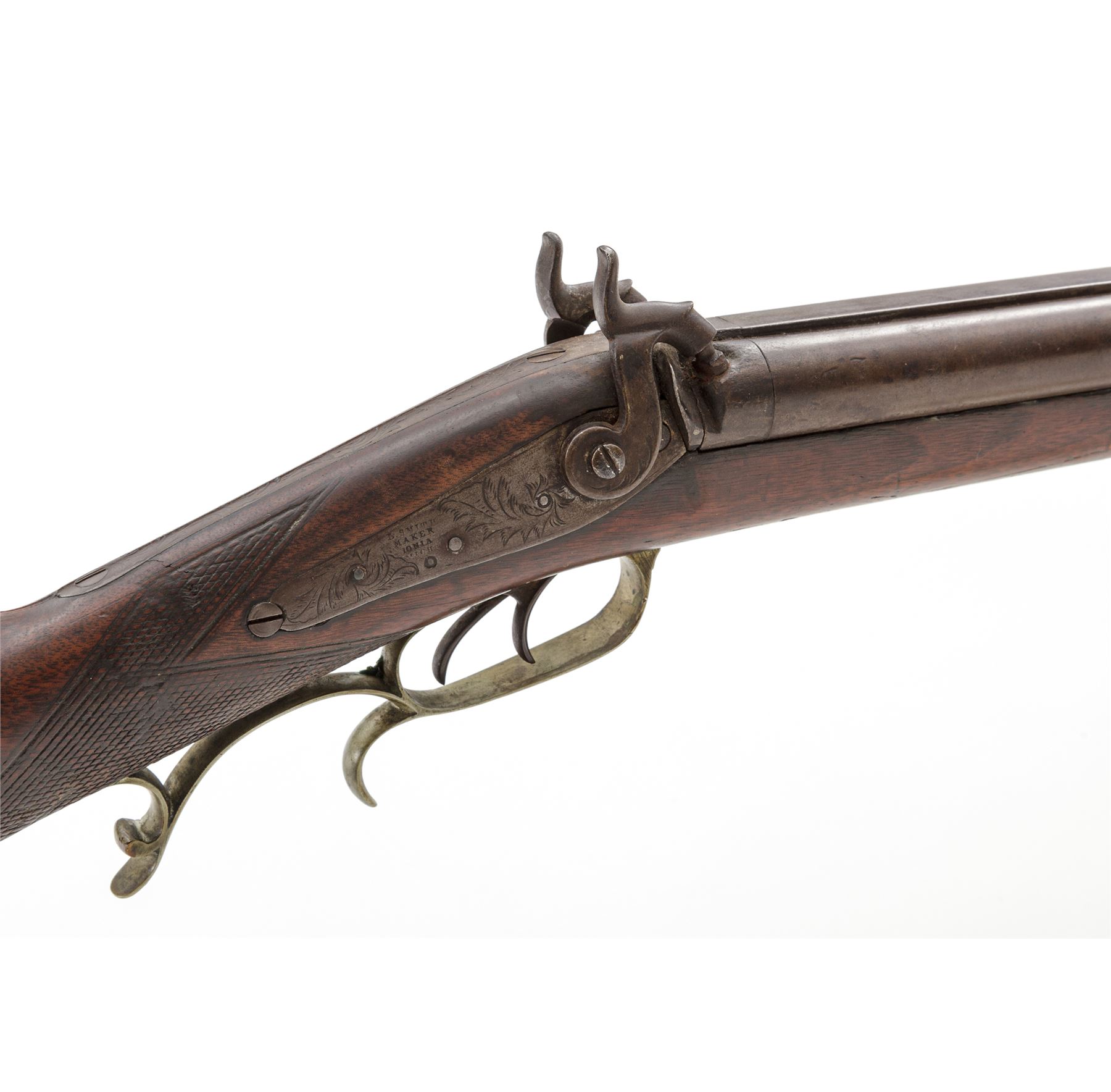 Antique American Side-by-Side Double Barrel Percussion Combination Rifle-Shotgun, by Loren Smith of Ionia, Michigan, NVSN, .38 cal. and 16 ga., unmarked 32'' barrels have dovetailed blade front and adjustable buckhorn-style rear sights on a wide full-length top rib; both serpentine lockplates are floral engraved and marked ''L. Smith/Maker/Ionia/Mich.''; two iron ferrules retain hardwood ramrod; German silver furniture including leaf-shaped forend cap, two oval barrel key escutcheons, engraved scrolled triggerguard with rear finger-rest, scroll-shaped engraved patchbox with hinged door to butt trap for patches and spare parts, crescent buttplate with engraved long lower tang, and an inlaid recumbent deer above the carved left-side cheekpiece; varnished walnut halfstock with checkered panels at wrist. Condition is very good. Barrels retain a smooth gunmetal gray-brown tone, German silver parts have an even age patina. Stock is solid and smooth with worn checkering, scattered minor age and handling marks, nice color, and most of what may be later varnish finish. Ramrod and top ferrule are missing; actions are strong and smooth; bores are shiny; rifle bore shows deep rifling. Loren Smith was listed as a gunsmith in the 1872 History and Directory of Ionia County, Michigan. Est.: $650-$1,250. (Antique)