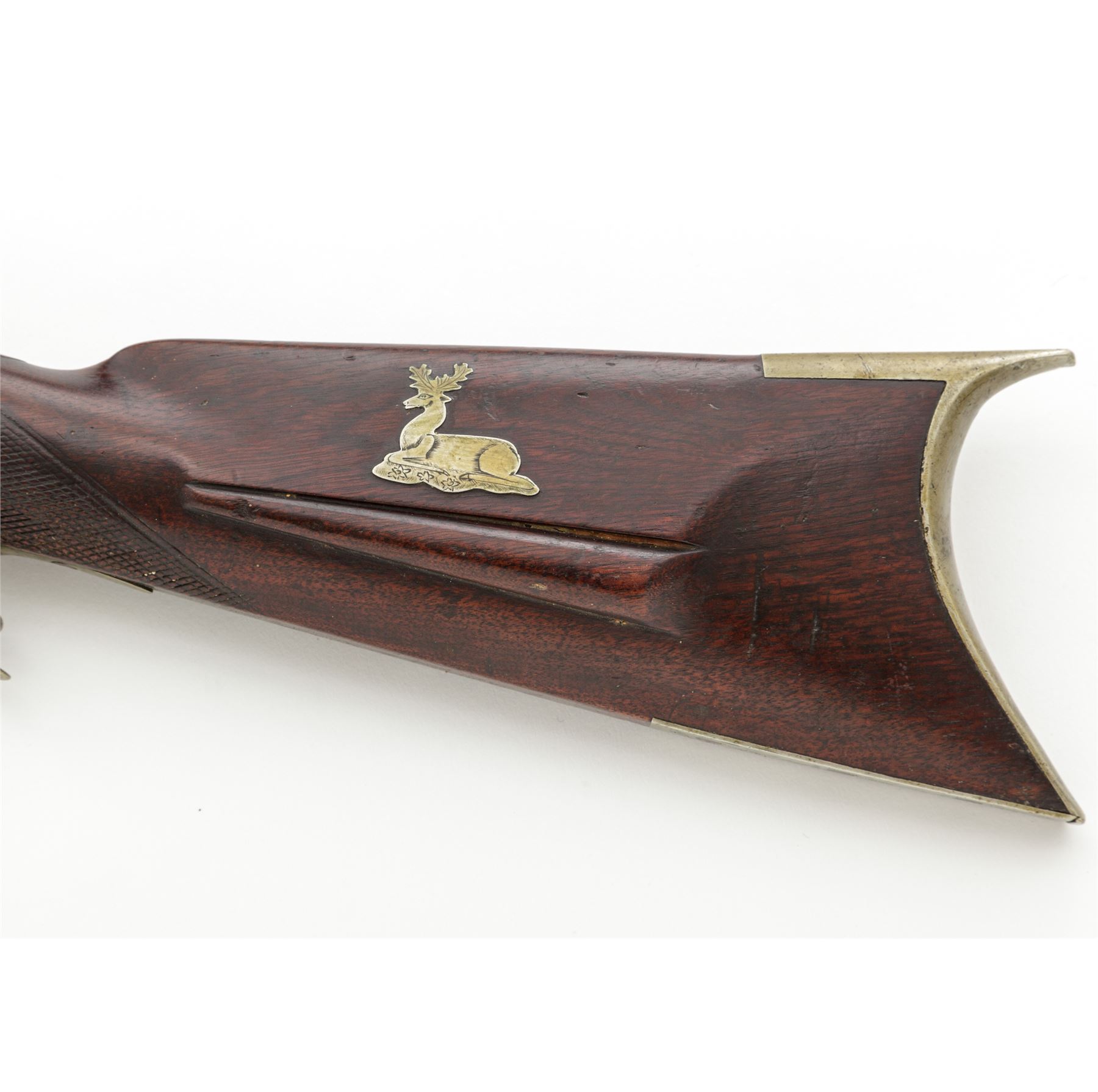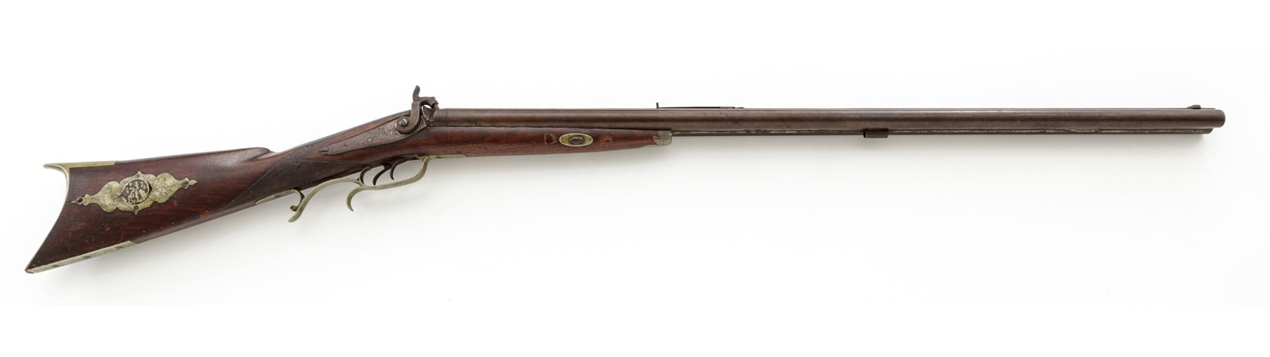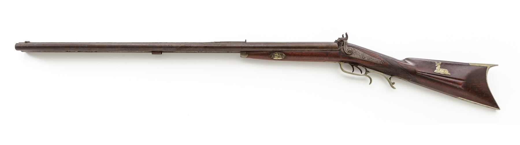 Antique American Side-by-Side Double Barrel Percussion Combination Rifle-Shotgun, by Loren Smith of Ionia, Michigan, NVSN, .38 cal. and 16 ga., unmarked 32'' barrels have dovetailed blade front and adjustable buckhorn-style rear sights on a wide full-length top rib; both serpentine lockplates are floral engraved and marked ''L. Smith/Maker/Ionia/Mich.''; two iron ferrules retain hardwood ramrod; German silver furniture including leaf-shaped forend cap, two oval barrel key escutcheons, engraved scrolled triggerguard with rear finger-rest, scroll-shaped engraved patchbox with hinged door to butt trap for patches and spare parts, crescent buttplate with engraved long lower tang, and an inlaid recumbent deer above the carved left-side cheekpiece; varnished walnut halfstock with checkered panels at wrist. Condition is very good. Barrels retain a smooth gunmetal gray-brown tone, German silver parts have an even age patina. Stock is solid and smooth with worn checkering, scattered minor age and handling marks, nice color, and most of what may be later varnish finish. Ramrod and top ferrule are missing; actions are strong and smooth; bores are shiny; rifle bore shows deep rifling. Loren Smith was listed as a gunsmith in the 1872 History and Directory of Ionia County, Michigan. Est.: $650-$1,250. (Antique)
