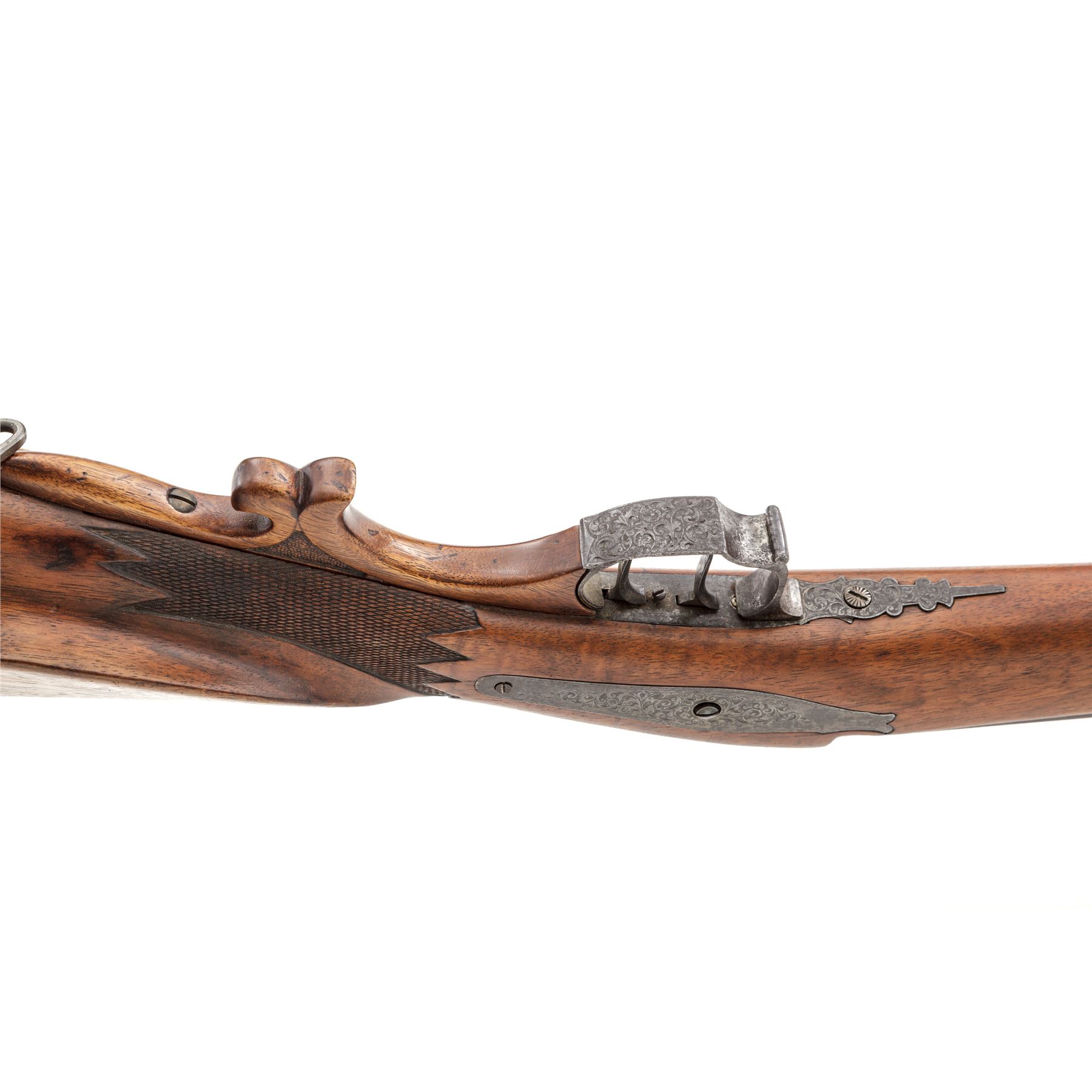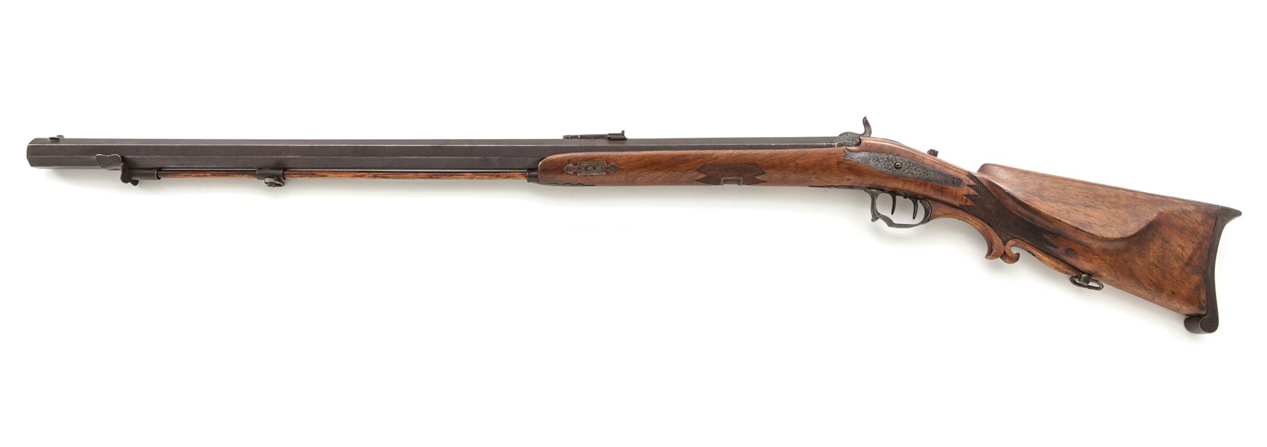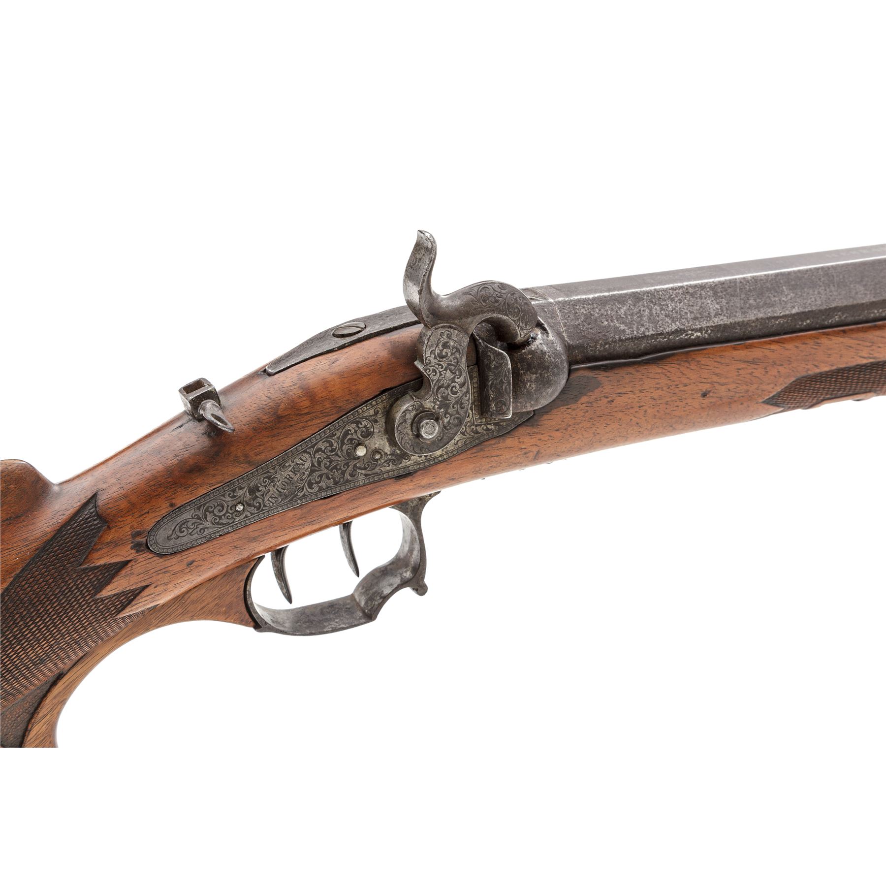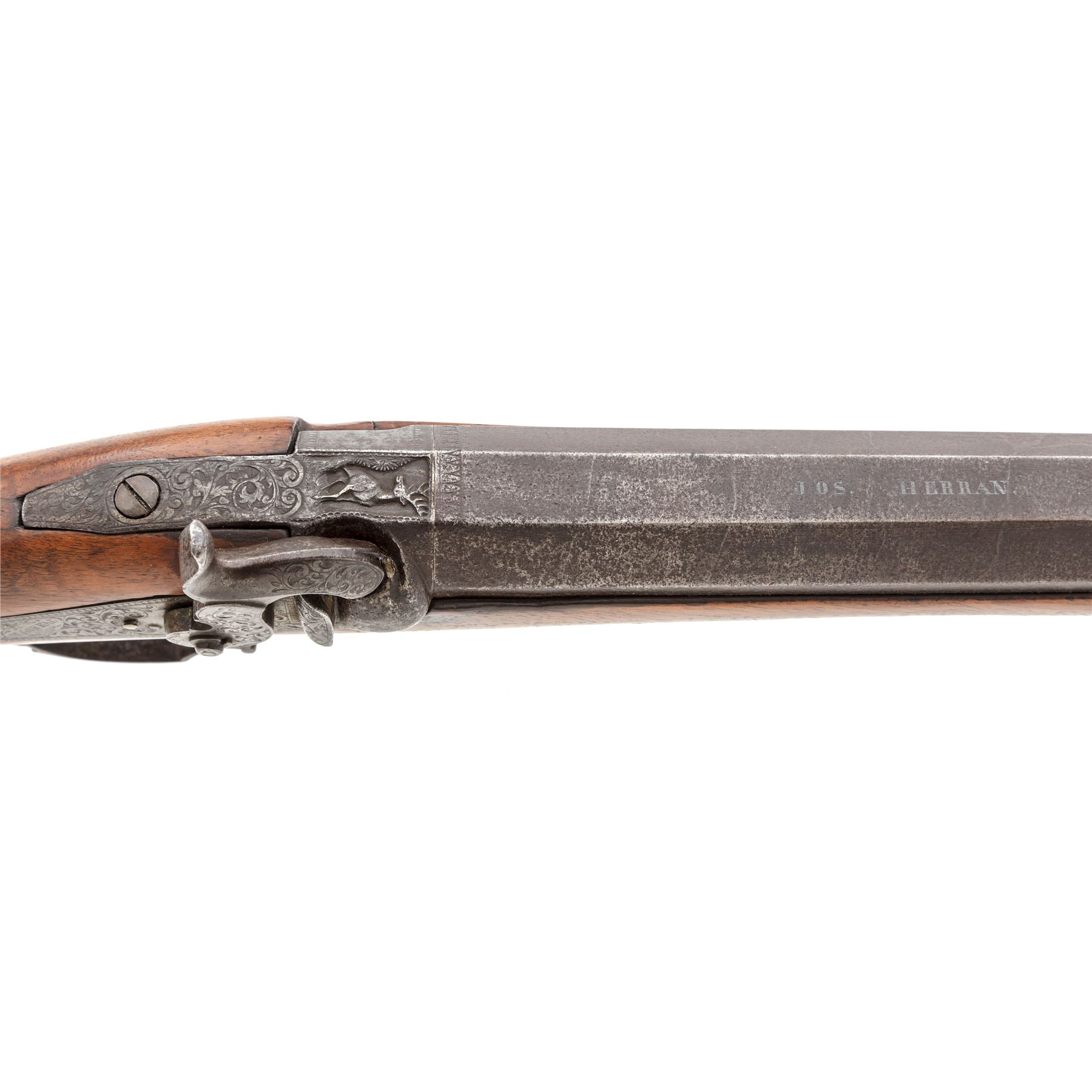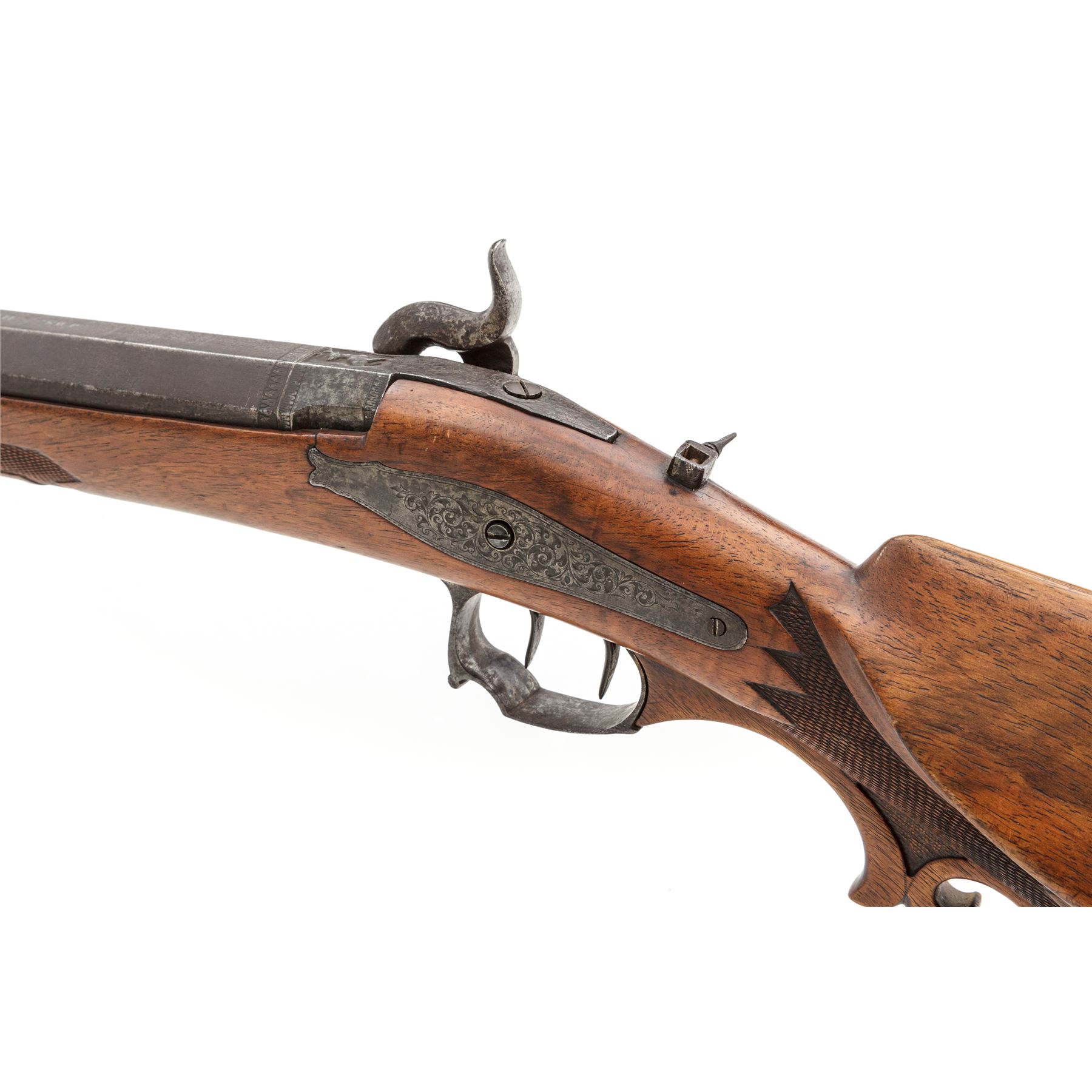 Antique European Heavy Barrel Long-Range Percussion Target Rifle, likely of German or Swiss origin, NVSN, .56 cal., 36'' heavyweight octagonal barrel measures 1-1/4'' across the flats at muzzle and is marked ''Jos. Herran'' in silver inlay ahead of the breech, which features a stag etched in deep relief ahead of the floral-engraved top tang; dovetailed large front blade and notched open rear sights; floral engraved steel hammer and lockplate with a unique flash shield and marked ''In Gorkau'' within a scroll; matching sideplate; floral engraved heavy steel triggerguard with fancy front tang and carved wood rear finger-rest; sling swivels on belly of buttstock and at 2nd ramrod thimble; heavy cast-iron buttplate with scrolled bottom and elongated top tang; plain hardwood ramrod with unusual front keeper and scroll-engraved bottom ferrule. Nicely figured European walnut halfstock with carved cheekpiece is deeply checkered at wrist and at midway balance point, has a single barrel wedge with two engraved escutcheons and pleasing color. There is a screw-type fitting at top of wrist, perhaps for some sort of tang sight, now missing. Double set triggers. Condition is very good, the metal parts showing a dark brownish patina with scattered light etching, the buttplate with pitting at sides, the markings and engraving generally sharp. Action functions; bore is brilliant with deep spiral rifling. Est.: $1,500-$2,500. (Antique)