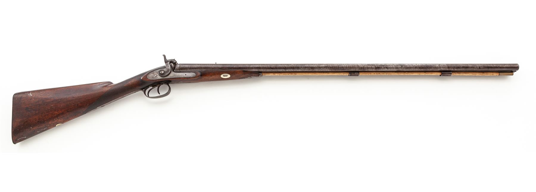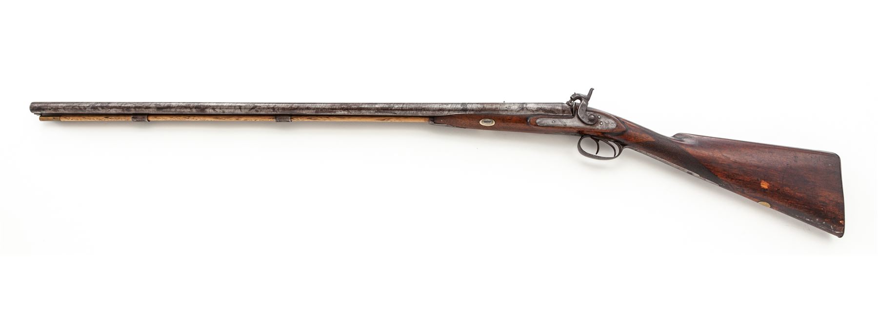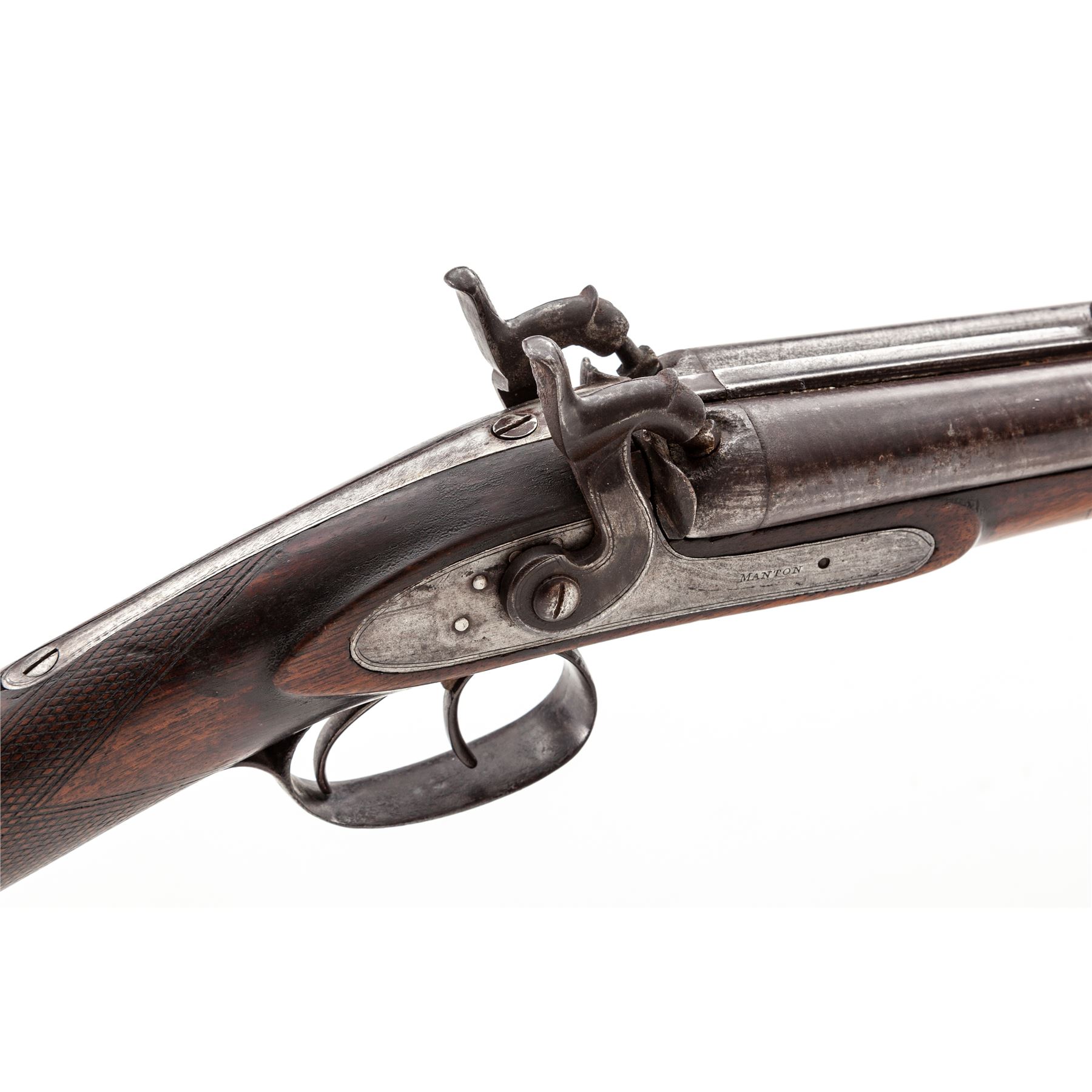 Antique English Side-by-Side Double-Barrel Percussion Shotgun, by Manton, NVSN, 16 ga., 34'' barrels with bead front and added small buckhorn style rear sights, marked ''London Fine Twist'' on full-length top rib; plain lockplates are marked ''Manton'' and have fine double borders, as do the hammers; double triggers; steel furniture including the border-engraved triggerguard with long front and rear tangs having fancy finials, buttplate, and three ferrules retaining the brass-tipped hardwood ramrod; single barrel key with two oval German-silver escutcheons; varnished English walnut halfstock with checkering at wrist and a vacant German-silver nameplate at bottom of butt. Condition is good to very good, the barrels with a pronounced twist pattern and otherwise a gunmetal gray-brown color, the balance of the metal smooth with clear markings and engraving (moderate erosion to buttplate). Stock is smooth and solid with moderately worn checkering and nicks and dings from age and use. Actions function smoothly; bores are clean with only light etching. Est.: $500-$750. (Antique)