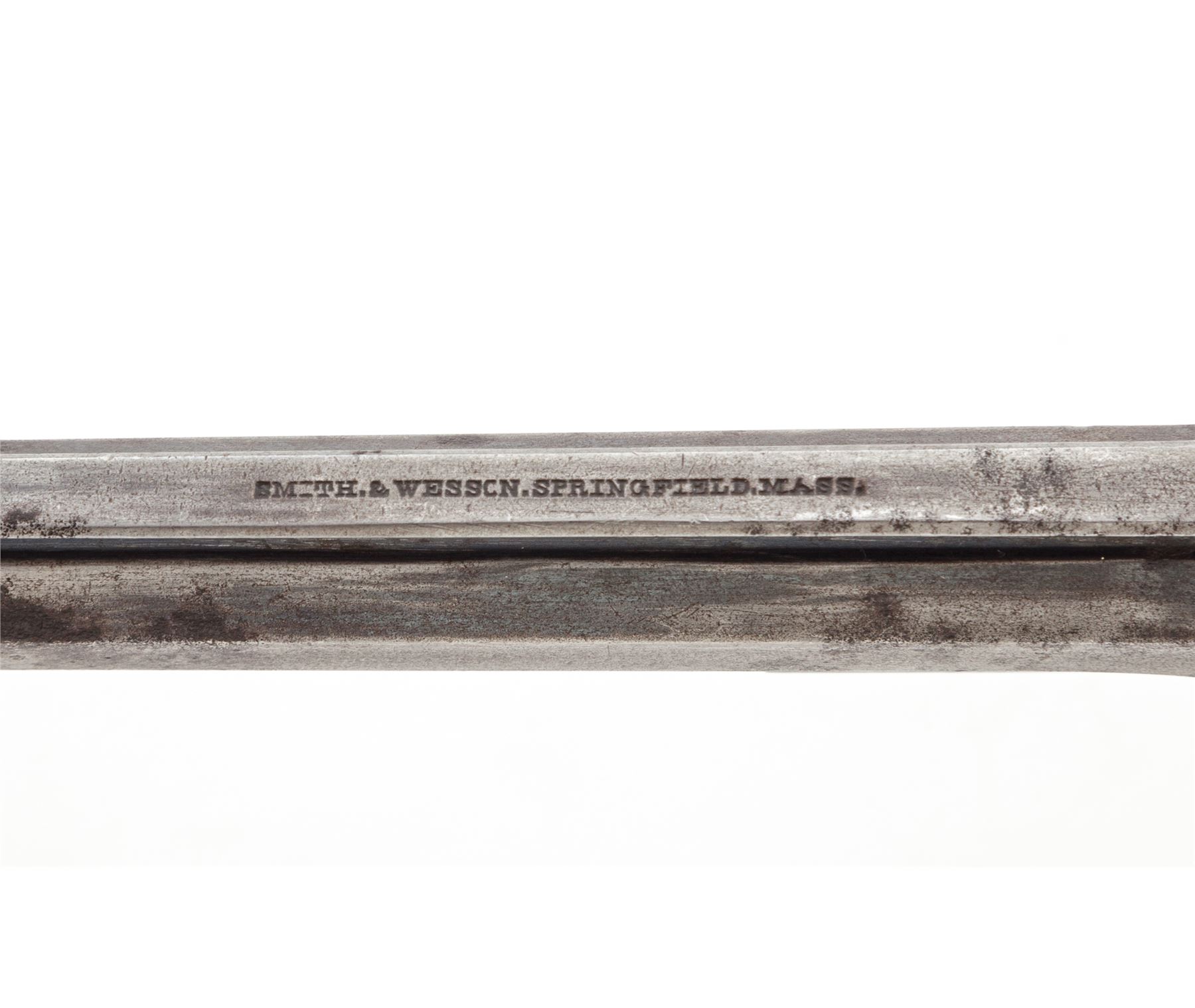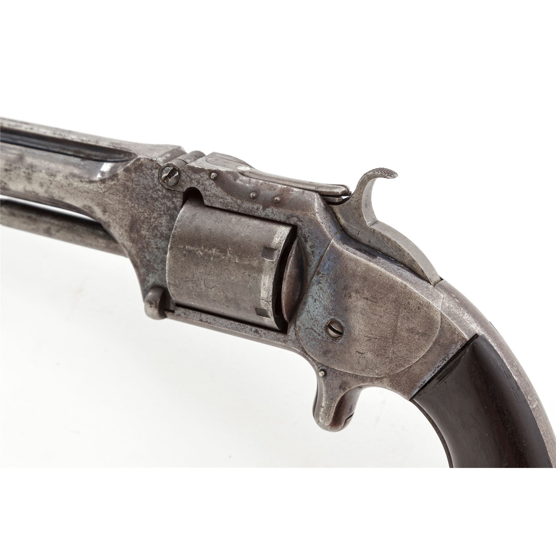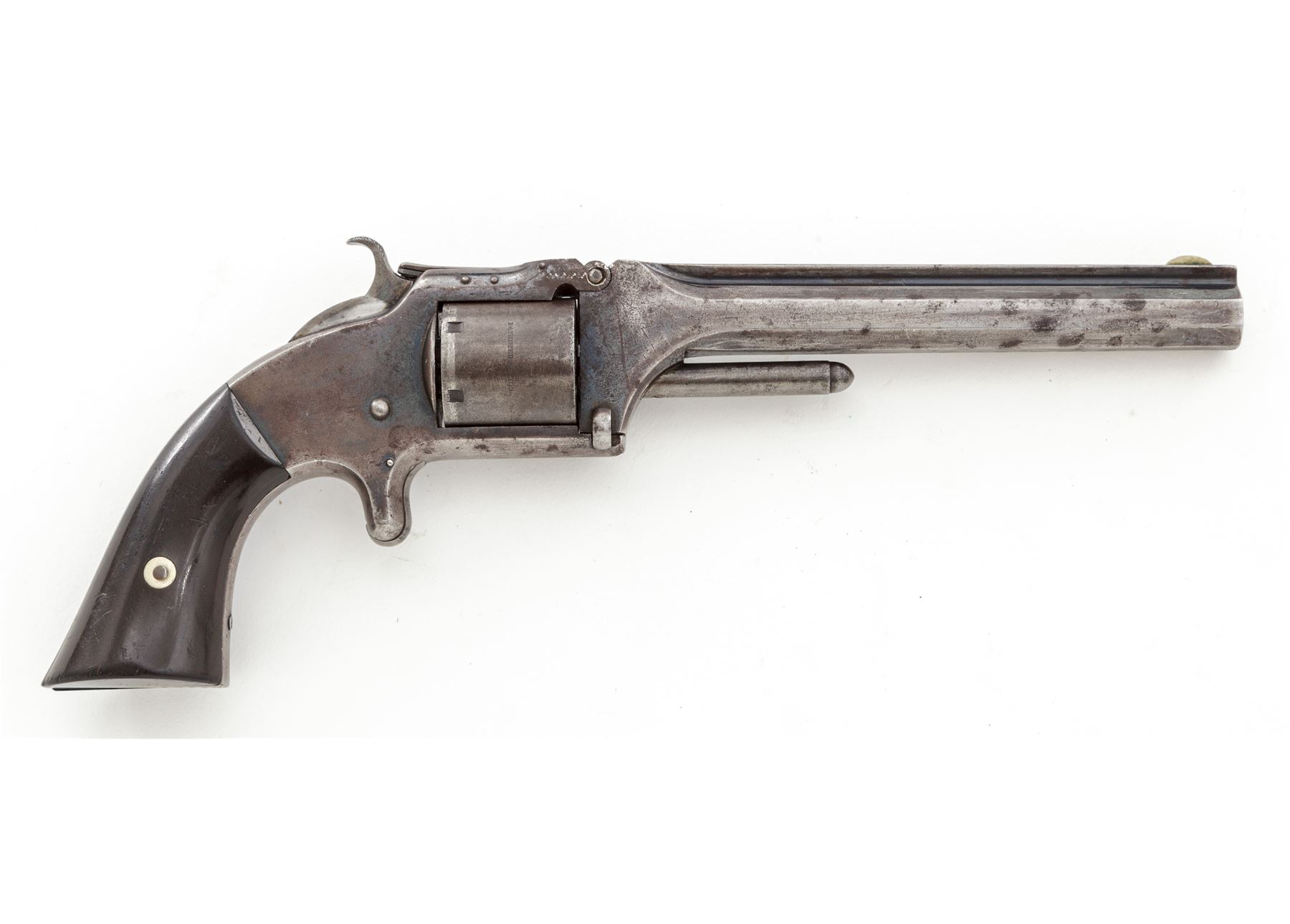 Civil War Smith & Wesson No. 2 Old Model Spurtrigger Revolver, #20140, .32 Long RF cal., 6'' octagonal barrel marked with the S&W name and address on top rib; round 6-shot cylinder has 1855-59-60 patent dates in tiny letters on its circumference; solid frame with top barrel hinge and cylinder stop, and integral grip straps; two-piece varnished rosewood grips. Mfg'd 1861-74, originally with full blued finish and case hardened hammer. Condition is very good retaining approx. 20% blue in protected areas, the balance a gunmetal gray with scattered cleaned erosion to sides of barrel, the hammer with mottled case colors. Grips are smooth and sound with minor wear at bottom edges and 90% original finish. Barrel hinge is a bit wobbly, but not cracked. Action is smooth and tight; bore is clean with defined rifling. Est.: $600-$900. (Antique)