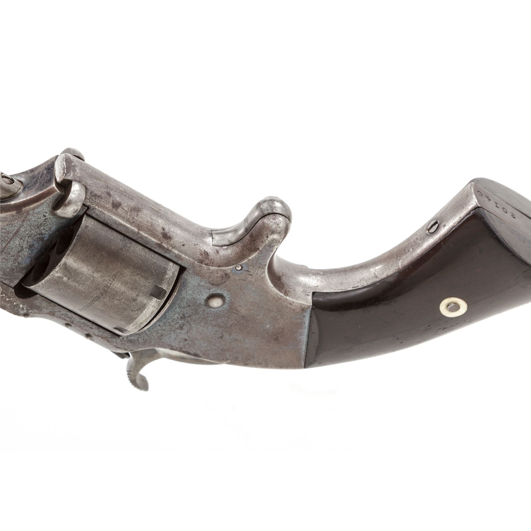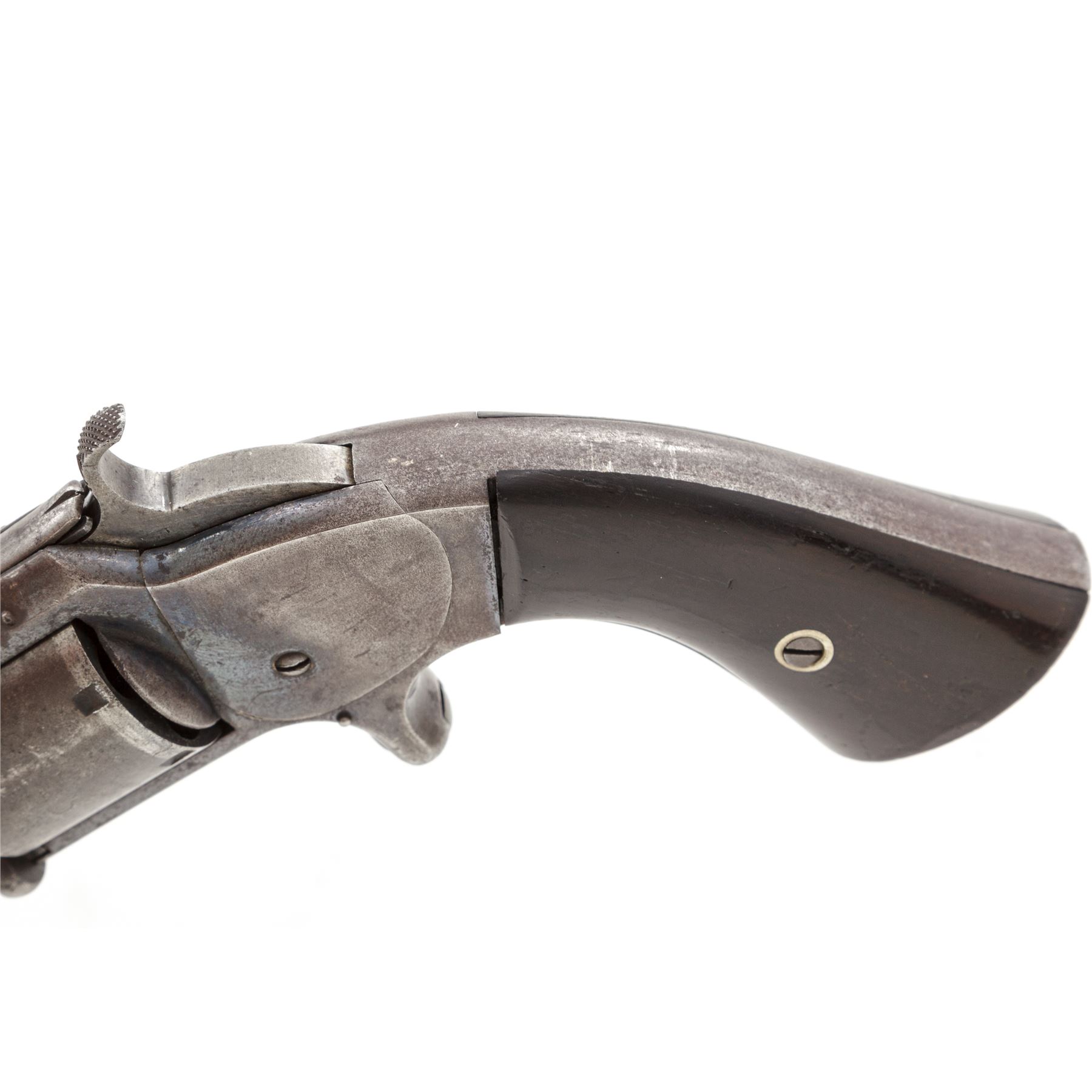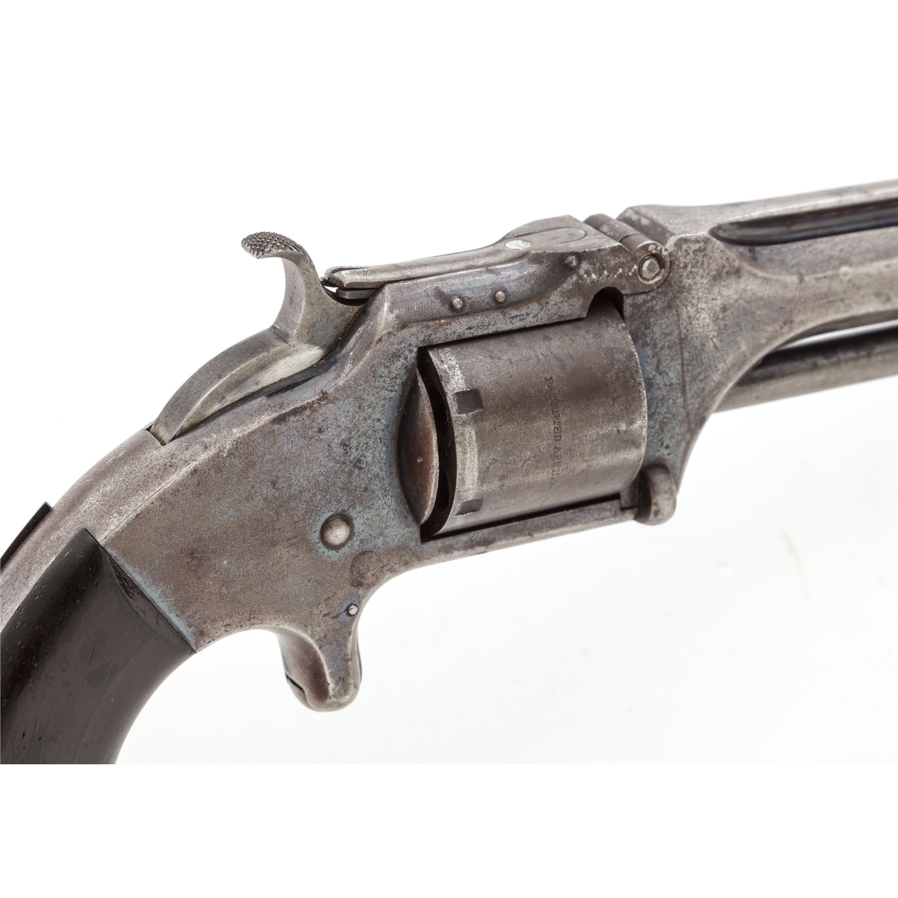 Civil War Smith & Wesson No. 2 Old Model Spurtrigger Revolver, #20140, .32 Long RF cal., 6'' octagonal barrel marked with the S&W name and address on top rib; round 6-shot cylinder has 1855-59-60 patent dates in tiny letters on its circumference; solid frame with top barrel hinge and cylinder stop, and integral grip straps; two-piece varnished rosewood grips. Mfg'd 1861-74, originally with full blued finish and case hardened hammer. Condition is very good retaining approx. 20% blue in protected areas, the balance a gunmetal gray with scattered cleaned erosion to sides of barrel, the hammer with mottled case colors. Grips are smooth and sound with minor wear at bottom edges and 90% original finish. Barrel hinge is a bit wobbly, but not cracked. Action is smooth and tight; bore is clean with defined rifling. Est.: $600-$900. (Antique)