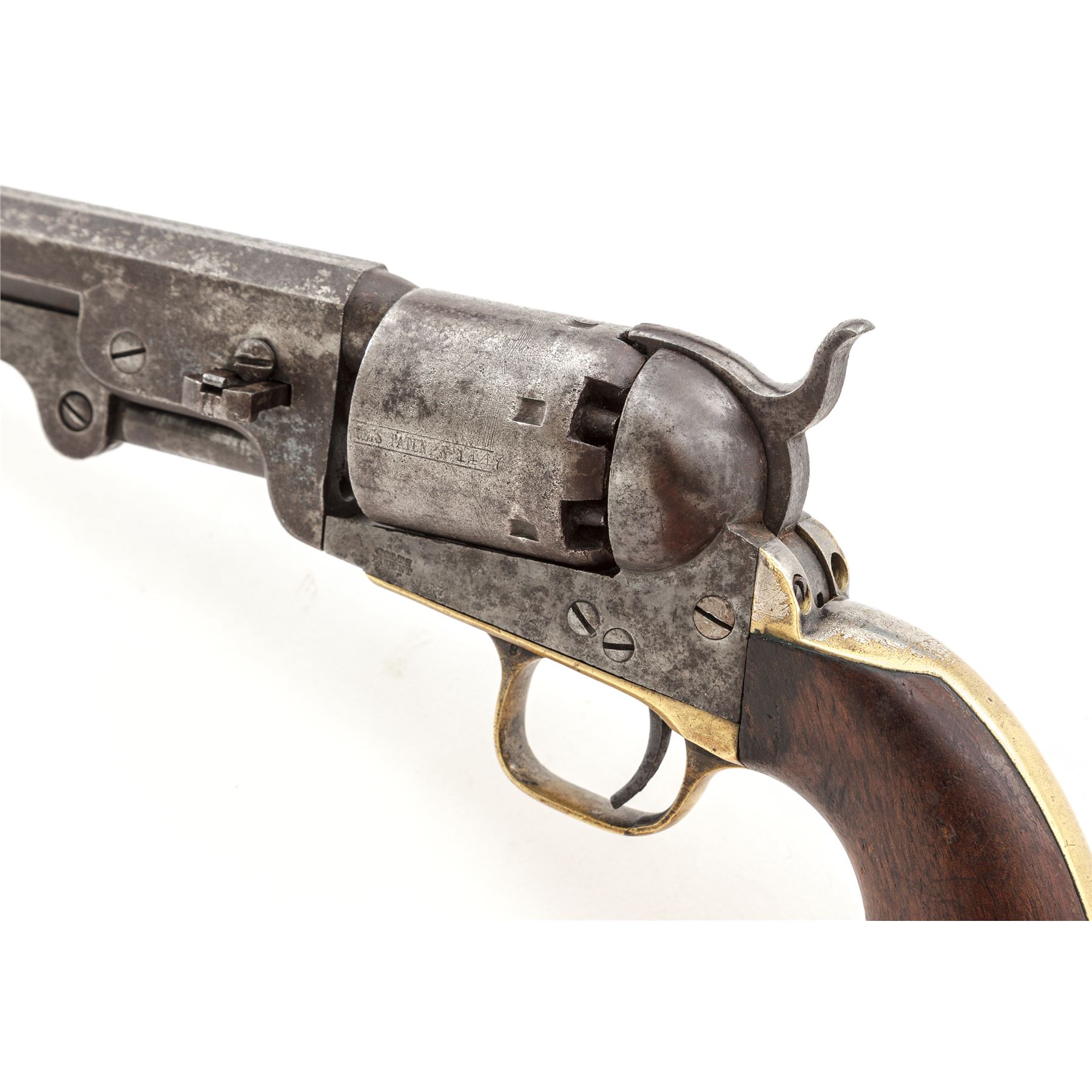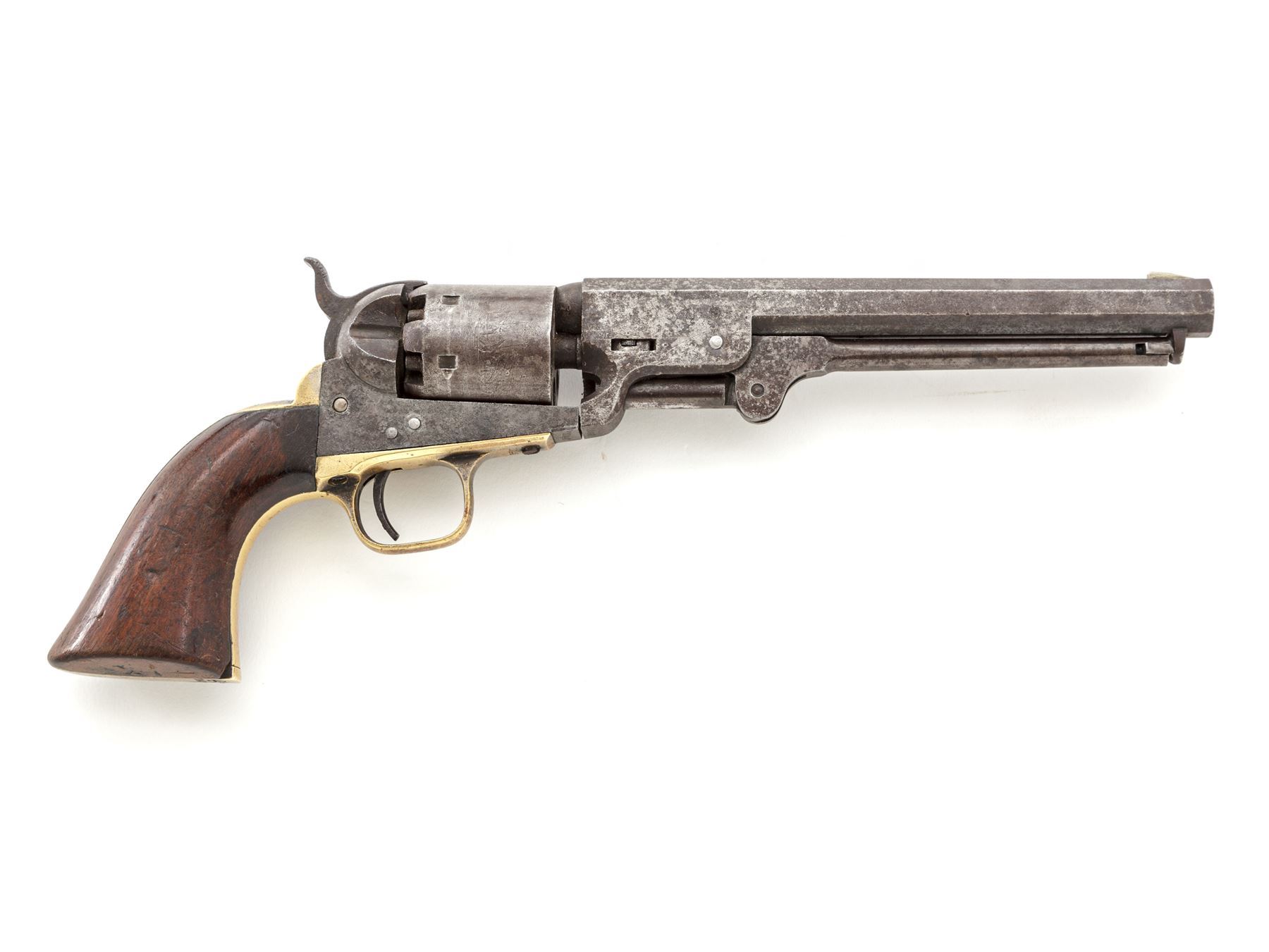 Antique Colt Model 1851 4th Type Navy Percussion Revolver, #131447, .36 cal., 7.5'' octagonal barrel fitted with a German silver blade front sight marked on top ''Address Col Saml Colt New-York U.S. America'' in one line; round 6-shot cylinder is roll engraved with the familiar naval battle scene and marked ''Colt's Patent 131447 (faint)'' within two lines; frame is marked ''Colts/Patent'' in two lines on left side; brass gripstraps; varnished one-piece walnut grips. Mfg'd 1862, originally with blued barrel and cylinder, case hardened frame, hammer, lever and plunger, and silver-plated straps. Condition is near very good, the steel parts an overall dark blue-brown with scattered light pitting (heavier on right side), the barrel showing traces of blue, the cylinder showing approx. 20% scene (pitted/obscured in area of serial number), the brass retaining good traces of silver (especially on backstrap apron), else with an aged patina. Grips with minor use marks and highpoint wear, a small chip at bottom front, and retaining approx. 75% original varnish. All serial numbers match including wedge and lever. Pistol is tight and appears factory original with the exception of the front sight, which is a very nicely done addition. Est.: $800-$1,200. (Antique)