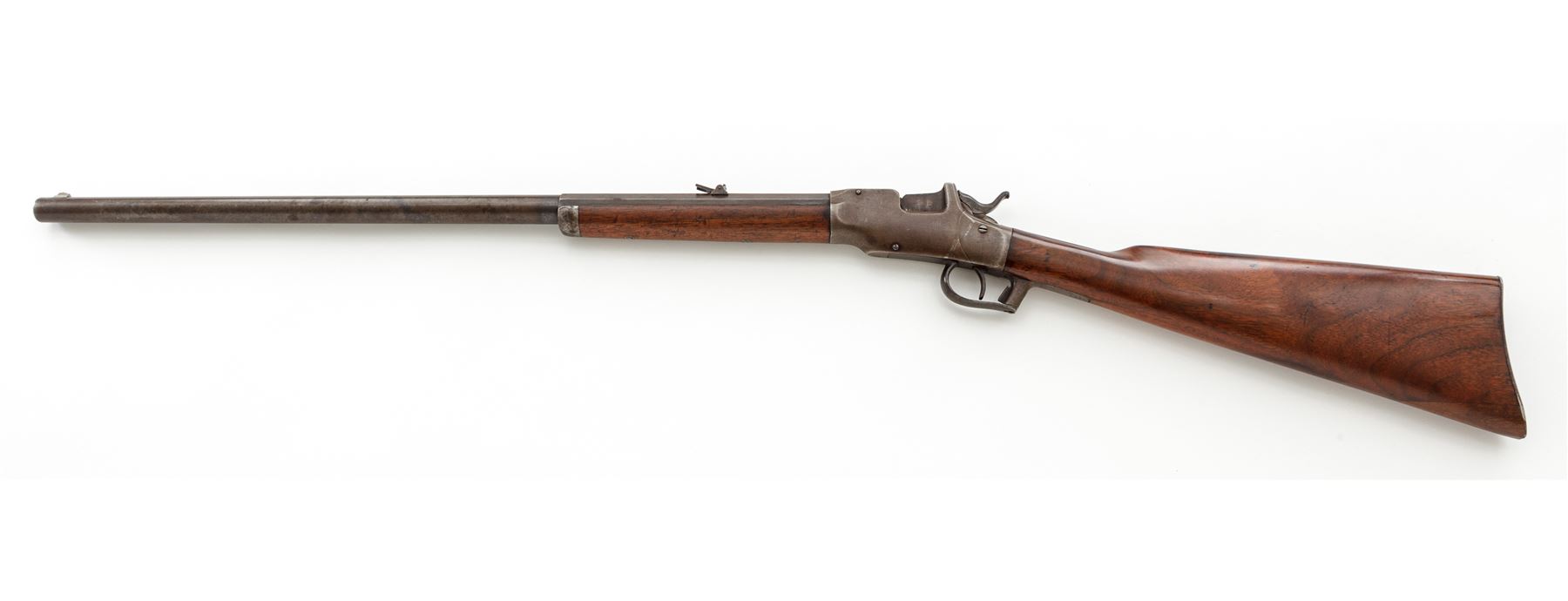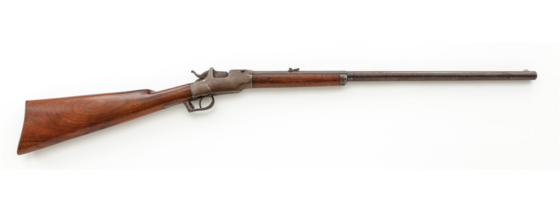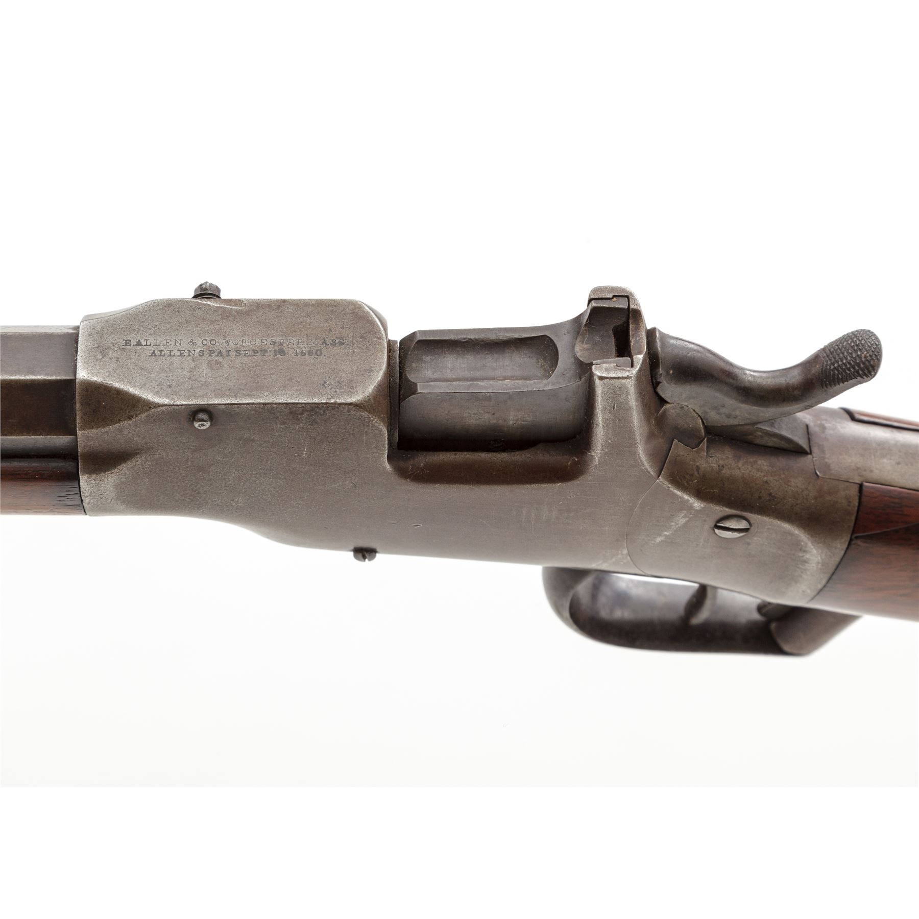 Antique Falling-Block Single Shot Rifle, by Ethan Allen & Co., #2620, .44 RF cal., 26'' half round-half octagonal barrel, with dovetailed German-silver blade front and adjustable-leaf rear sights unmarked, and has a unique takedown feature via a small threaded pin through top of frame, the latter marked ''E. Allen & Co., Worcester, Mass./Allen's Pat. Sept. 16, 1860''; steel receiver with under-lever that actions the dropping breech with automatic cartridge extraction, and also acts as a triggerguard with latch on bottom frame tang; varnished walnut forend with a steel cap, and matching buttstock having a curved steel buttplate with hinged door opening to trap in butt for jointed cleaning rod (not present). Mfg'd ca. 1860-70s, in a quantity of 2,000 or fewer guns. Condition is very good. Barrel shows a smooth blue-brown tone with perhaps 15% original blue on side flats and protected areas; receiver, lever and hammer are a smooth brown patina with traces of case hardening colors; forend shows scattered age and use marks, and dulled varnish. Buttstock is smooth with a secure crack at wrist and very professional wood repairs at top tang, buttplate toe, and where a sling swivel was originally fitted below, and retains all of its varnish with lovely grain and color. Action is smooth; bore is shiny with deep rifling. This Allen rifle, with its largest caliber offered, large rounded frame, and takedown feature, is considered scarce. Est.: $500-$950. (Antique)