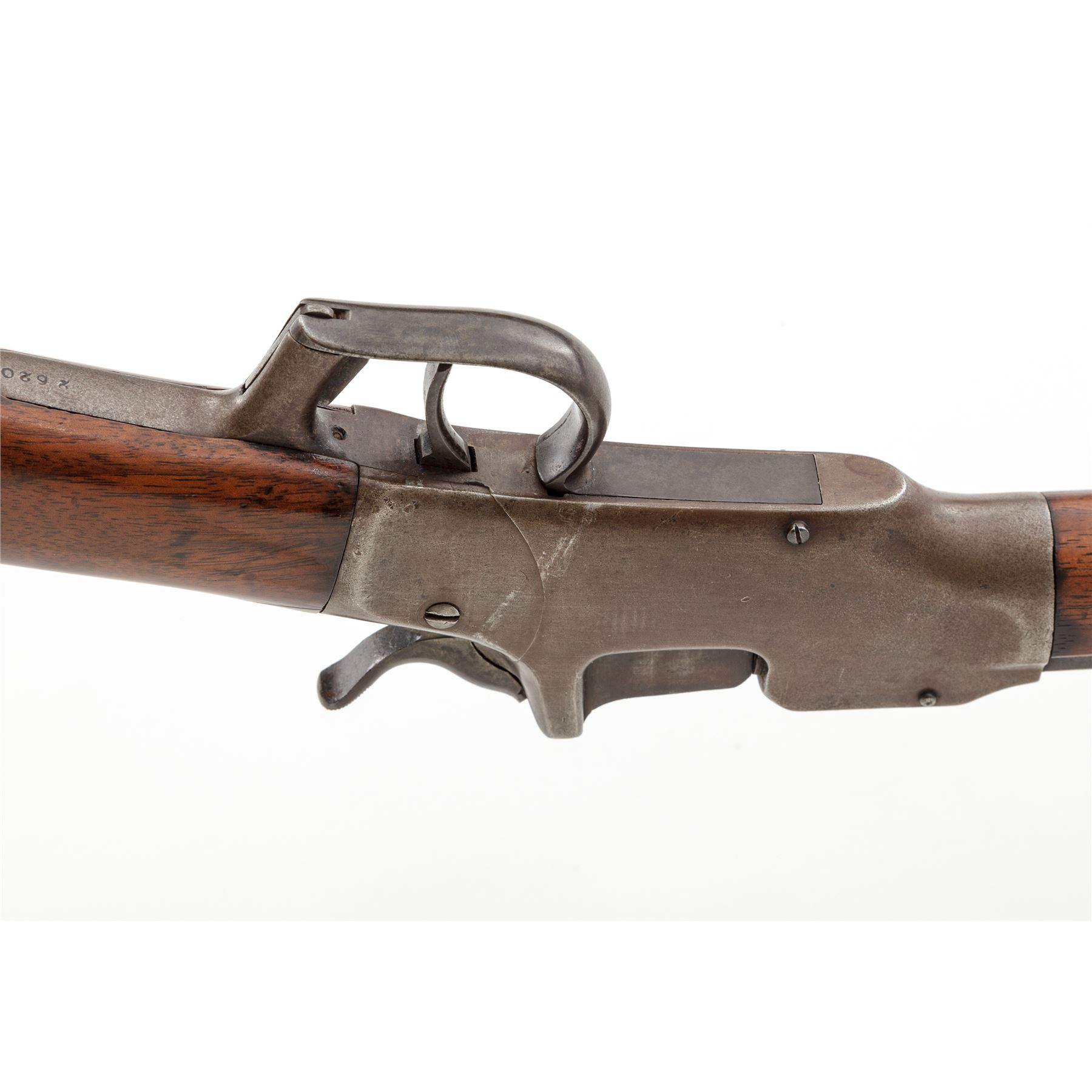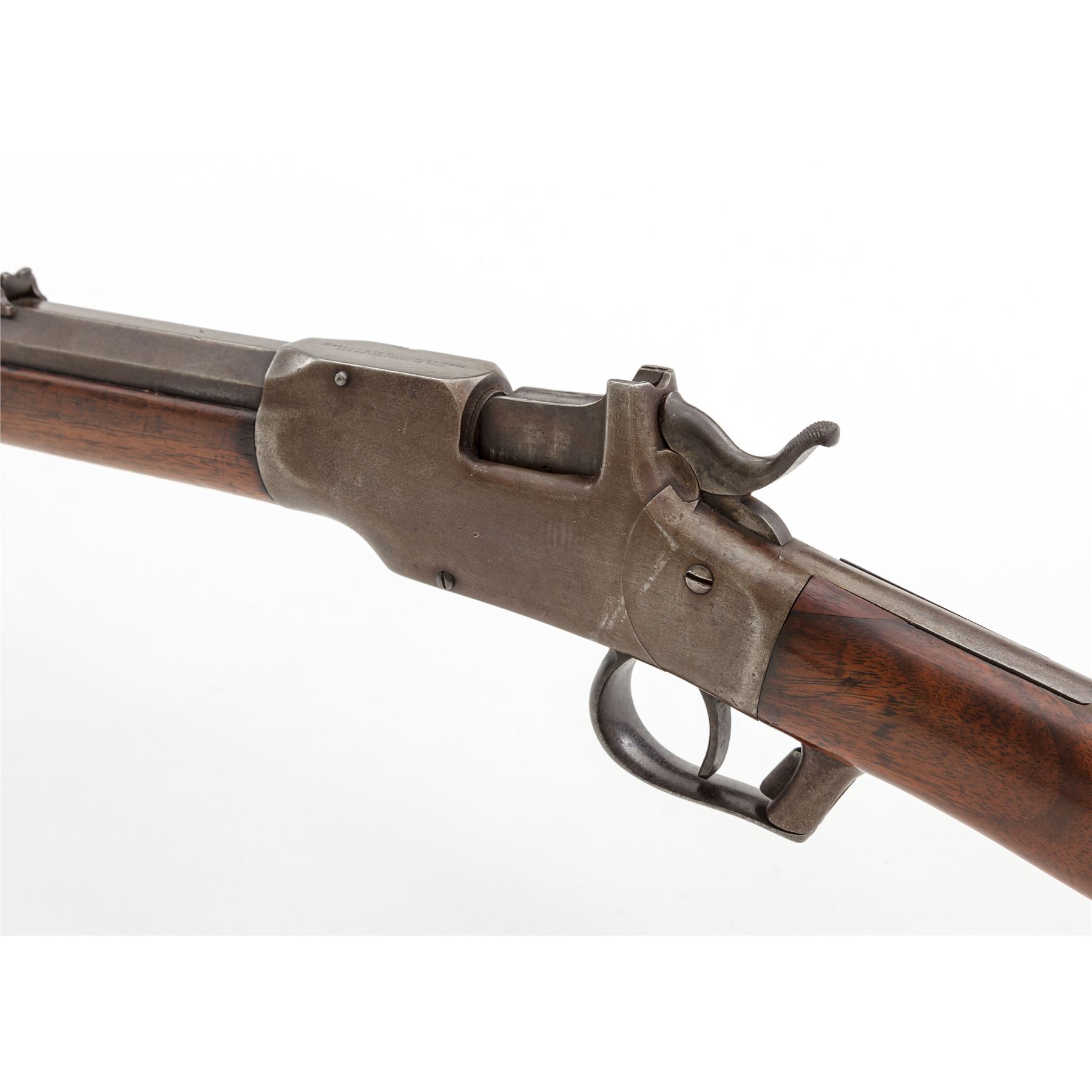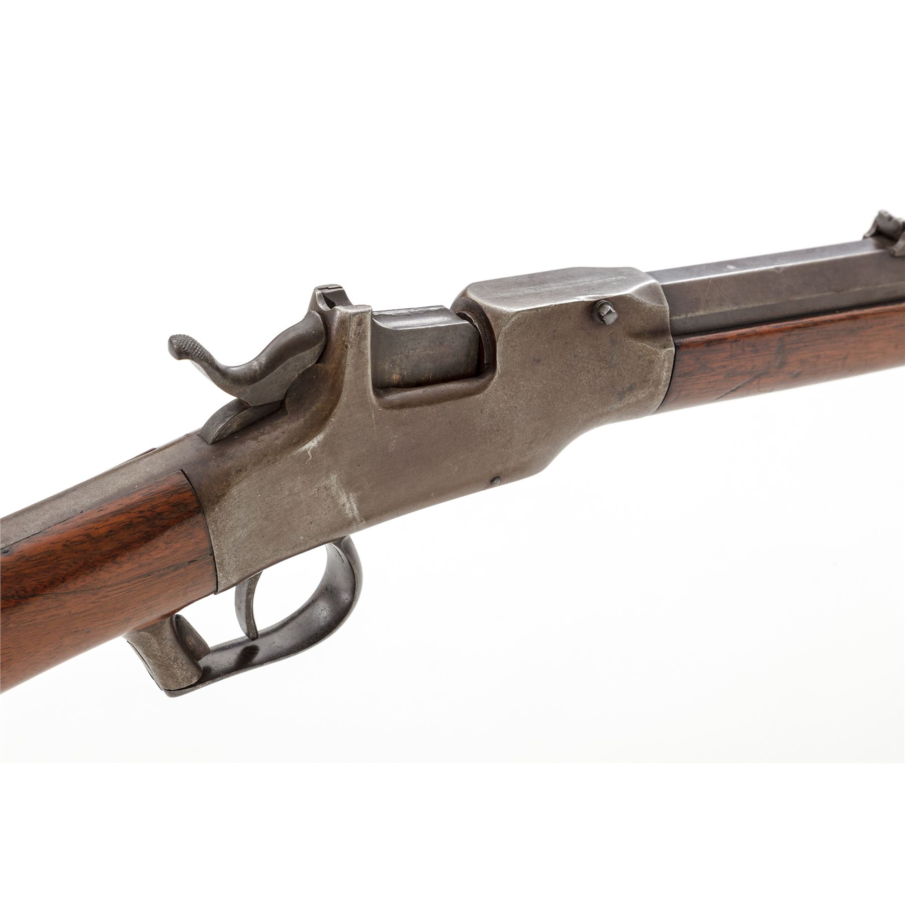 Antique Falling-Block Single Shot Rifle, by Ethan Allen & Co., #2620, .44 RF cal., 26'' half round-half octagonal barrel, with dovetailed German-silver blade front and adjustable-leaf rear sights unmarked, and has a unique takedown feature via a small threaded pin through top of frame, the latter marked ''E. Allen & Co., Worcester, Mass./Allen's Pat. Sept. 16, 1860''; steel receiver with under-lever that actions the dropping breech with automatic cartridge extraction, and also acts as a triggerguard with latch on bottom frame tang; varnished walnut forend with a steel cap, and matching buttstock having a curved steel buttplate with hinged door opening to trap in butt for jointed cleaning rod (not present). Mfg'd ca. 1860-70s, in a quantity of 2,000 or fewer guns. Condition is very good. Barrel shows a smooth blue-brown tone with perhaps 15% original blue on side flats and protected areas; receiver, lever and hammer are a smooth brown patina with traces of case hardening colors; forend shows scattered age and use marks, and dulled varnish. Buttstock is smooth with a secure crack at wrist and very professional wood repairs at top tang, buttplate toe, and where a sling swivel was originally fitted below, and retains all of its varnish with lovely grain and color. Action is smooth; bore is shiny with deep rifling. This Allen rifle, with its largest caliber offered, large rounded frame, and takedown feature, is considered scarce. Est.: $500-$950. (Antique)