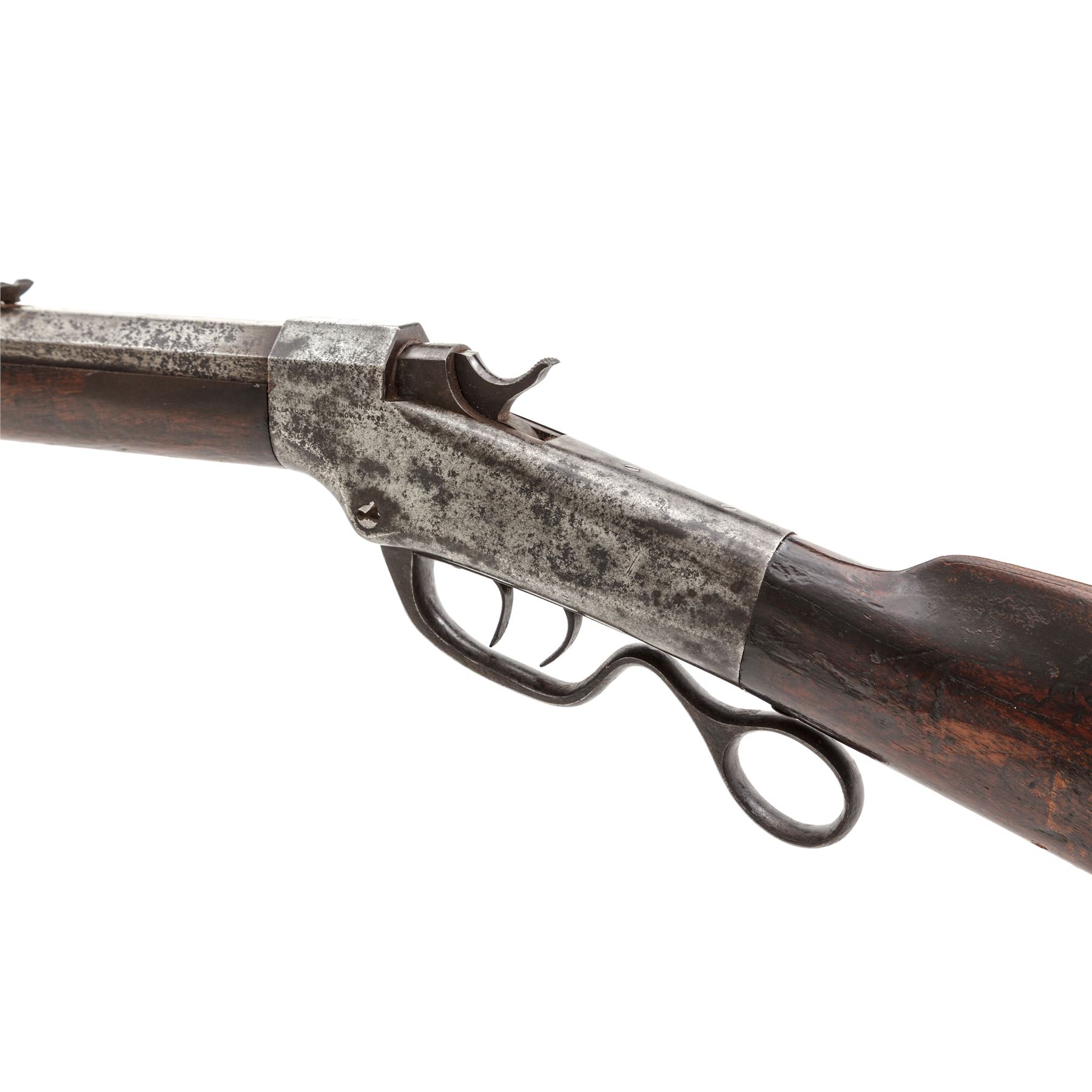 Marlin-Ballard Heavy Barrel Lever Action No. 5 Pacific Sporting Rifle, #6459, .40 CF cal., 30'' heavyweight octagonal barrel with dovetailed long blade front and Rocky Mountain type open rear sights; steel ramrod beneath barrel retained by two dovetailed ferrules; steel receiver with dropping-block action is marked on left side, ''J.M. Marlin New Haven Conn. U.S.A./Ballard's Patent Nov. 5, 1861''; finger-loop operating lever, double set triggers, steel crescent buttplate; oil-finished forend (with ebony insert at ramrod channel) and buttstock. Mfg'd 1876-91. Condition is about good, the metal parts being a gunmetal gray color over cleaned pitting, the markings faint or obscured. Stocks show overall wear and knackering and a nail repair or fastening at underside of wrist. Ramrod is likely a period replacement, as it is too long. Action functions correctly; bore is clean with distinct rifling. Est.: $800-$1,500. (Antique)