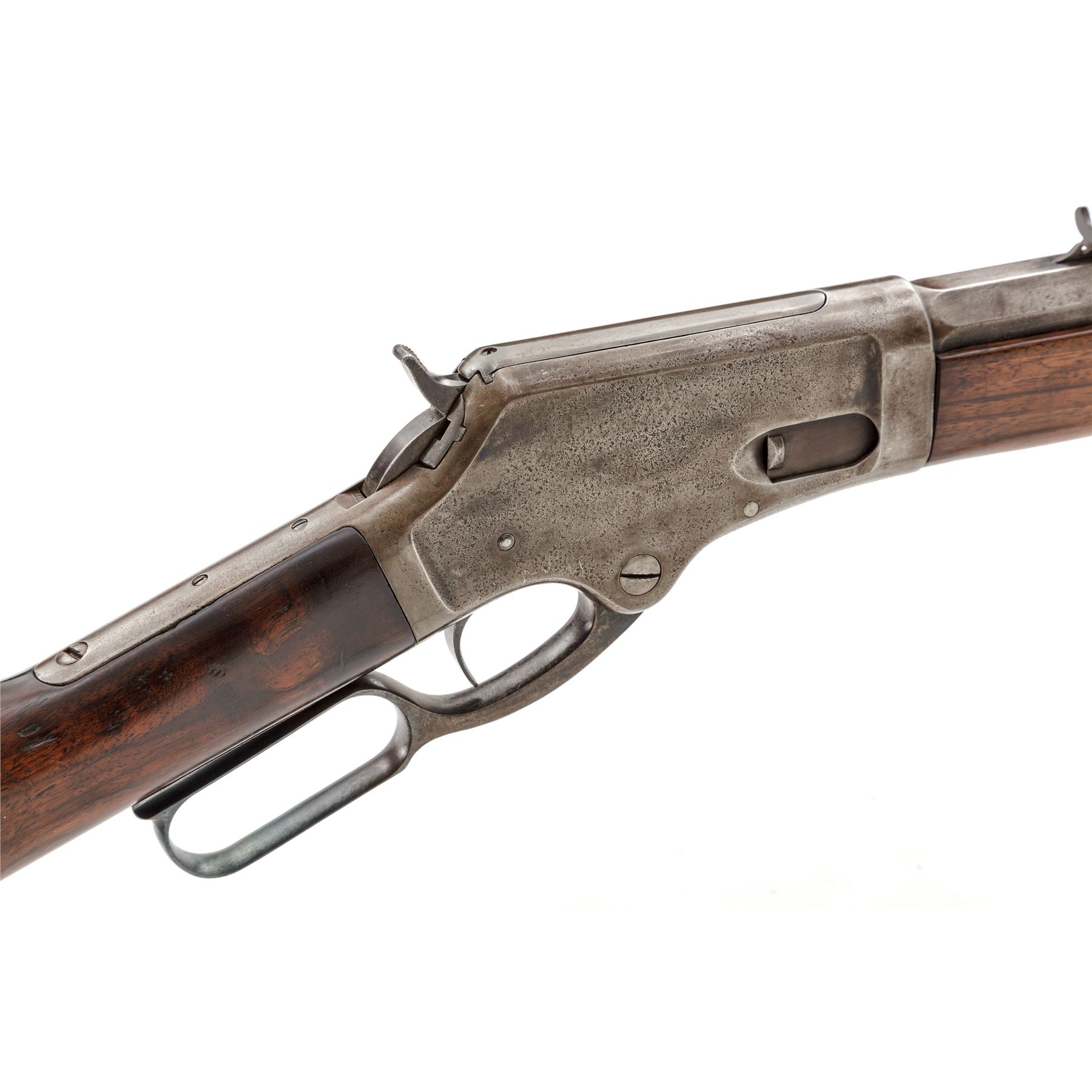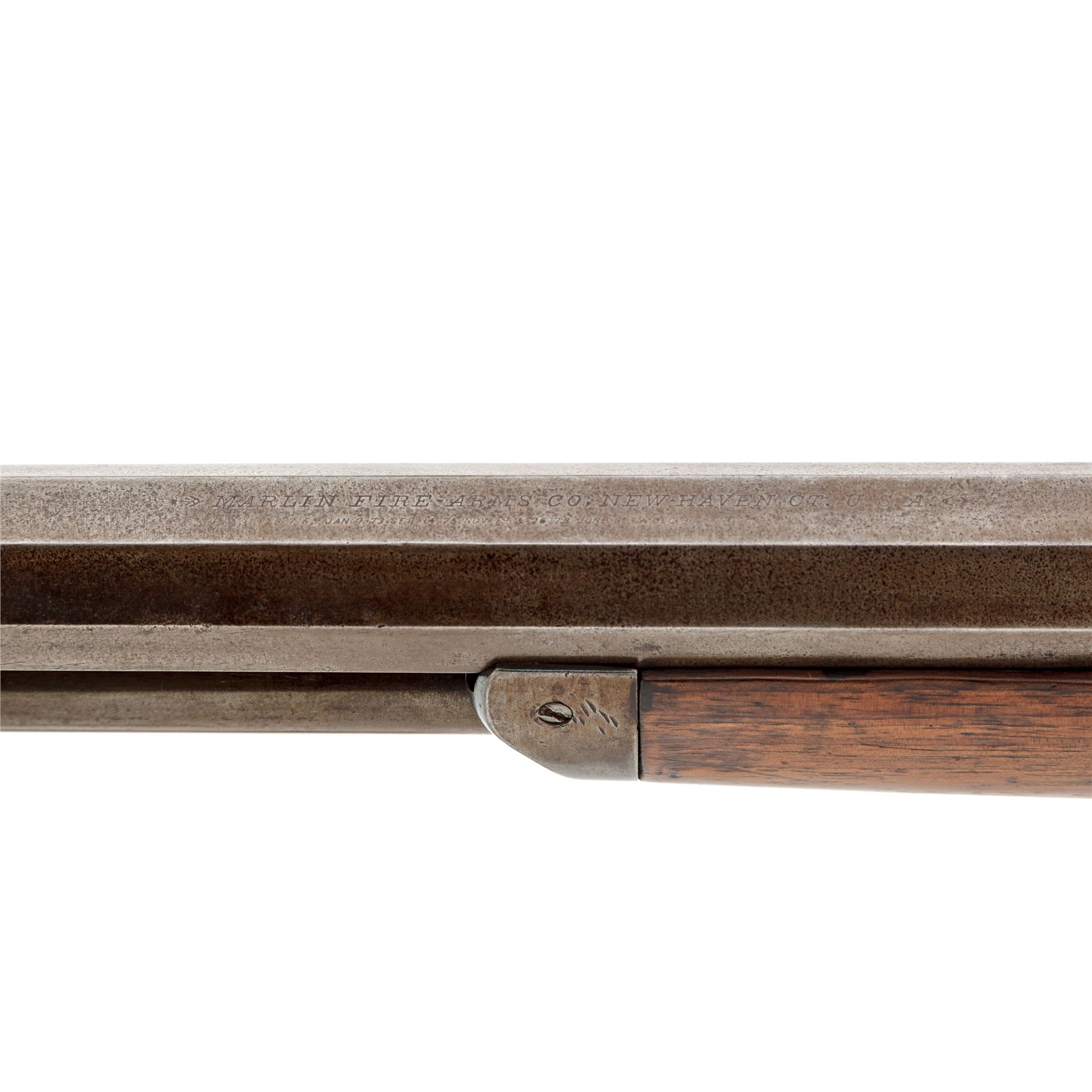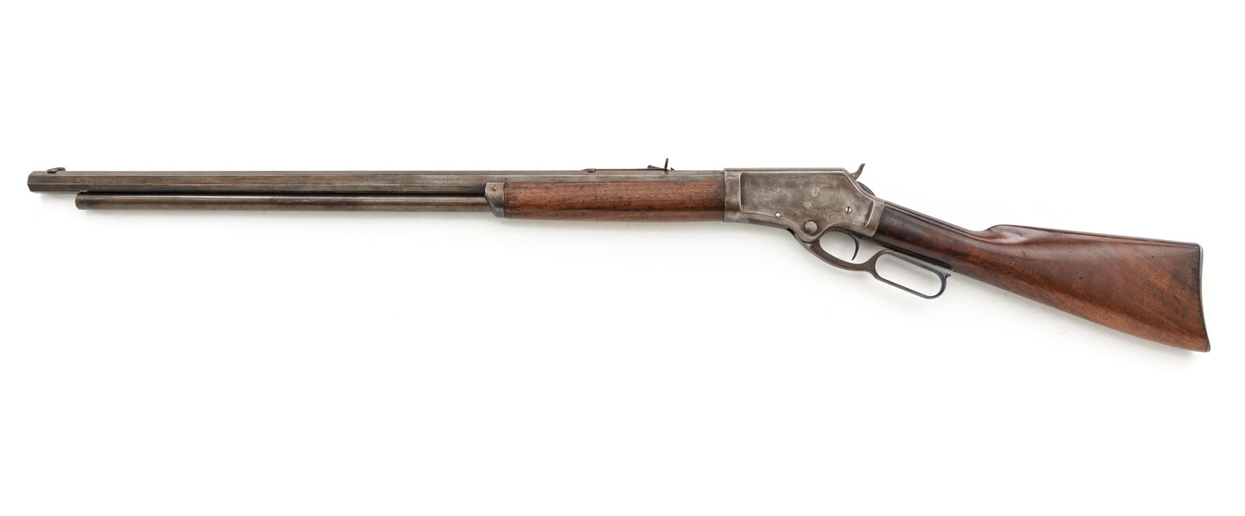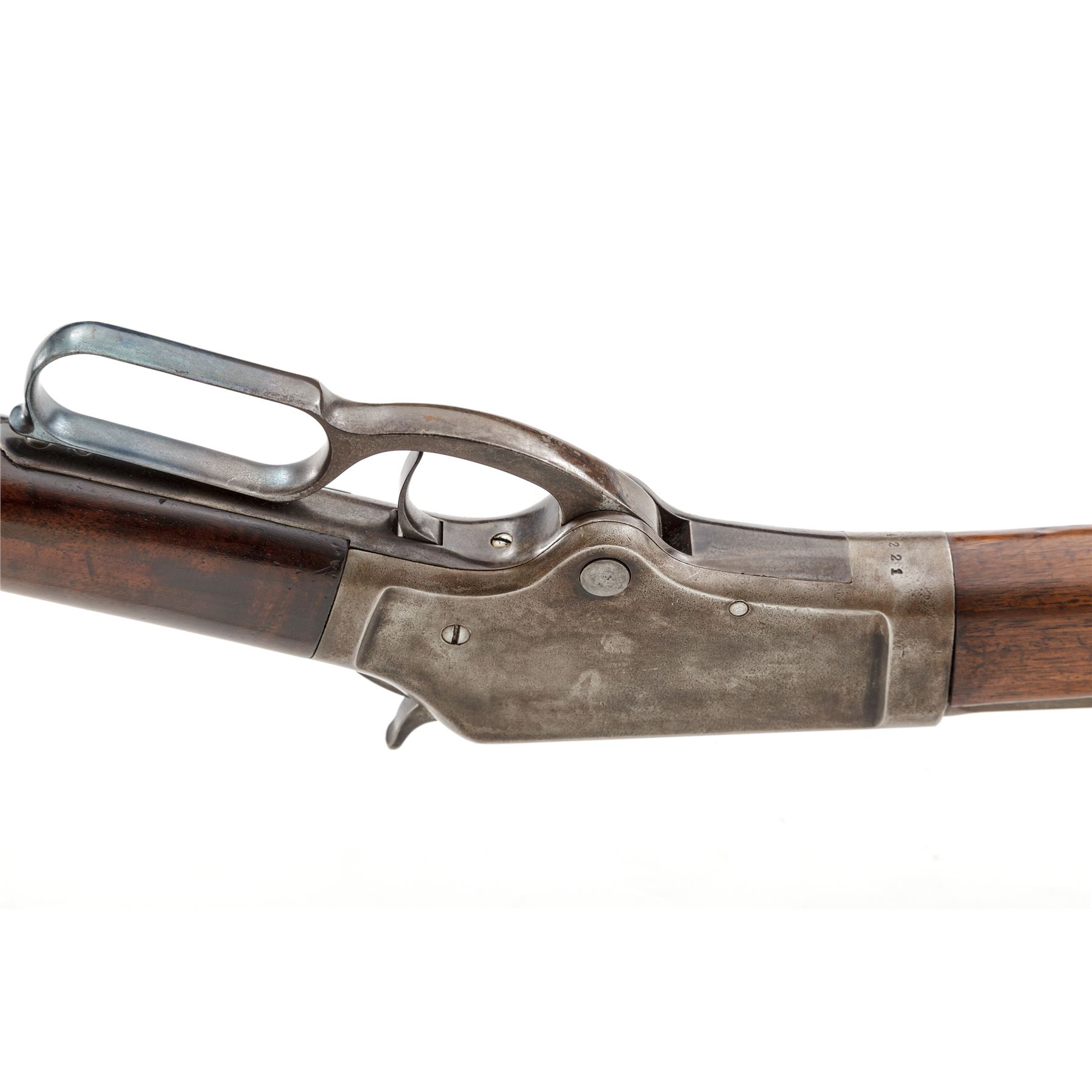 Antique Marlin Model 1881 Heavy Barrel Lever Action Rifle, #4221, .40-60 CF cal., blued 30'' heavyweight octagonal barrel, with dovetailed blade front and buckhorn rear sights, marked with maker's name, address and patent dates in two lines on top flat, and ''40 Cal'' at breech; blued tubular cartridge magazine; blued receiver with top ejection port is marked ''4221'' at bottom front, and has two screw-filled holes (likely for a tang sight, not now present) on upper tang; loop operating lever; varnished walnut forearm with steel nose cap, matching ''fish belly'' buttstock with steel crescent buttplate. Mfg'd ca. 1881, likely first year of production. Condition is very good. Metal surfaces retain traces of original blue with scattered light pitting/discoloration (heavier on receiver sides, the lever loop and buttplate with discoloration, possibly from heating, and perhaps later coloration). Stocks are sound and smooth showing minor marks from age and use, nice grain and color, and much original varnish. Action is smooth; bore is shiny with deep rifling. The first lever-action Marlin, this Model 1881 is unusual with its extra-long (just 780 were made) and extra-heavy barrel, and larger caliber. Est.: $900-$1,500. (Antique)