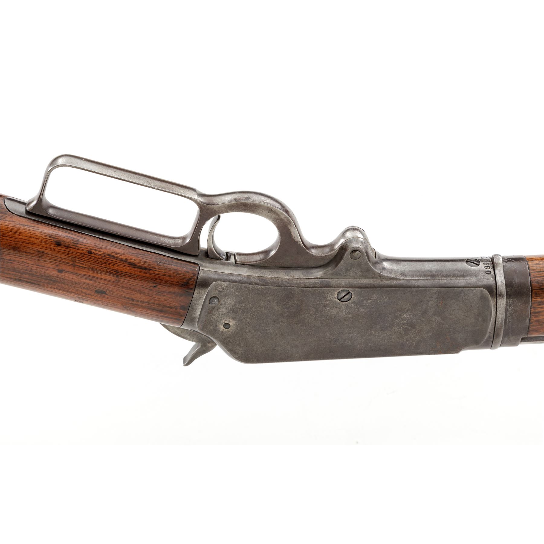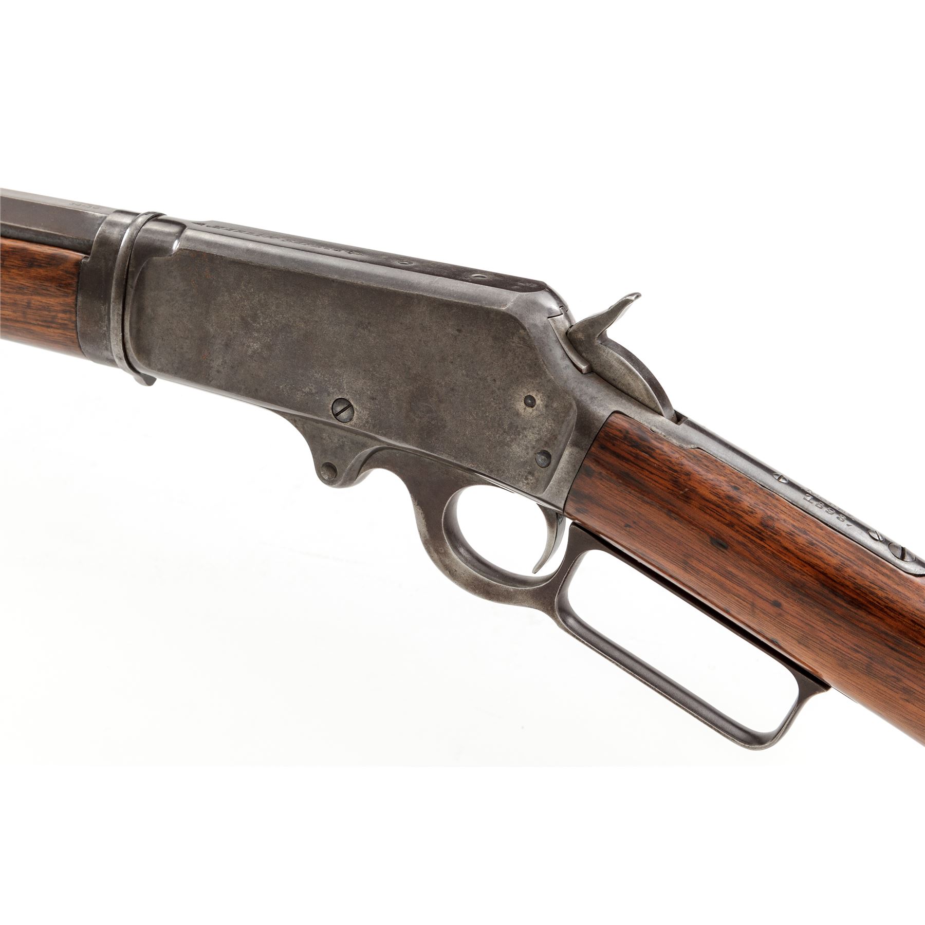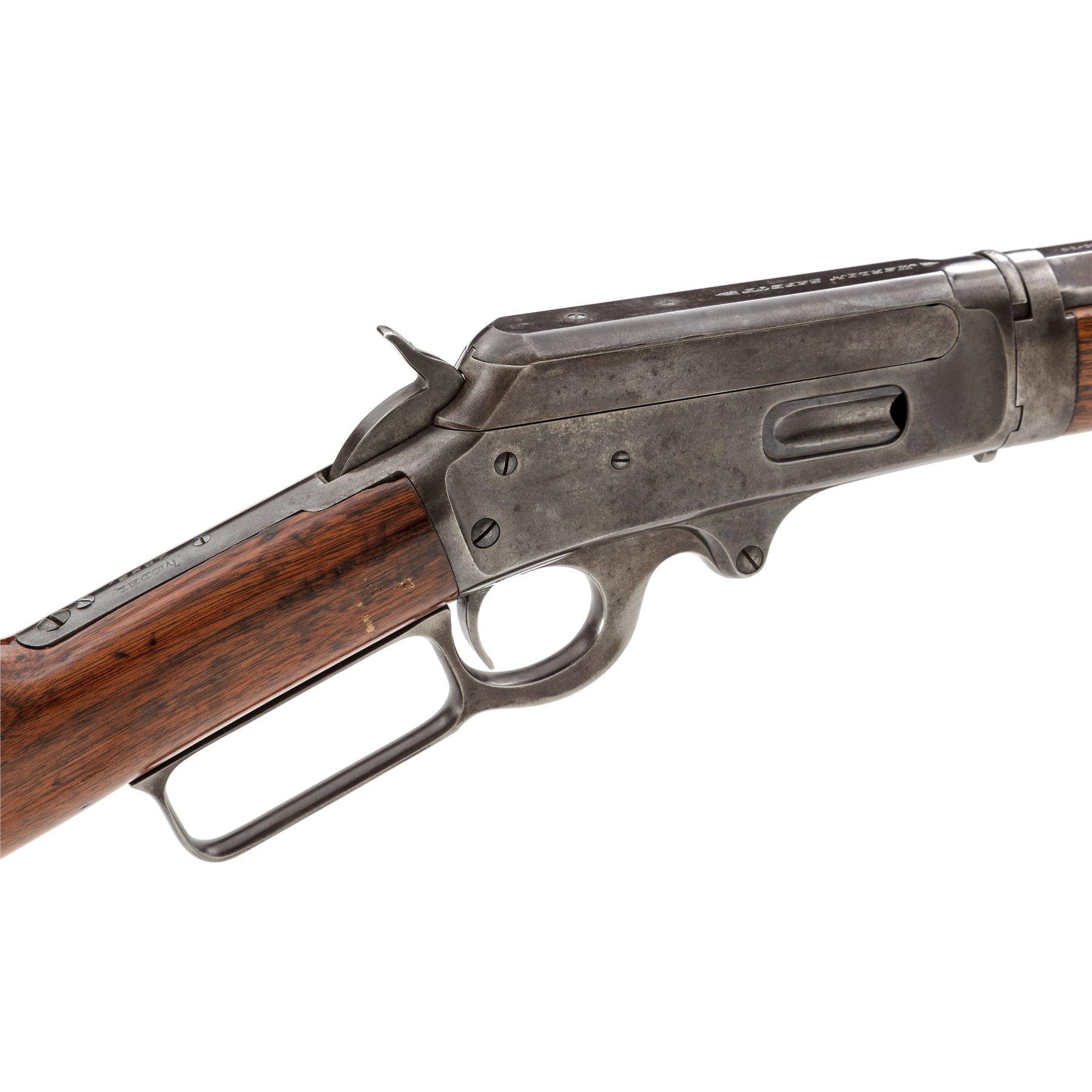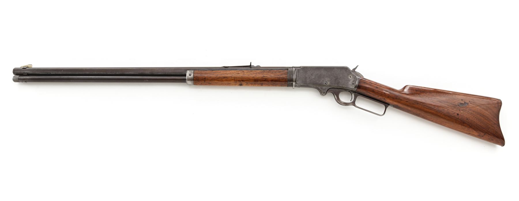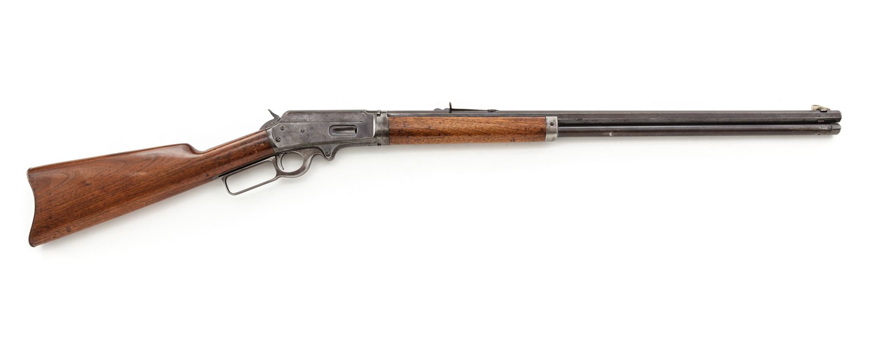 Marlin Model 1893 Takedown Lever Action Rifle, #312580, .30-30 CF cal., blued 26'' octagonal barrel, with buckhorn style open sights, marked with maker's name, address, and 1887-89-93 patent dates in two lines on top flat, ''Special Smokeless Steel'' flanked by diamonds on left angled flat below rear sight, and ''30-30'' at breech; blued tubular cartridge magazine; case hardened receiver with right-side ejection is marked ''Marlin Safety'' on top, ''Model/1893'' on upper tang and serial number at lower front; loop operating lever; varnished walnut forearm with steel nose cap, matching buttstock with steel crescent buttplate. Mfg'd 1905. Condition is very good. Barrel and mag tube show a smooth, even overall blue-brown with sharp edges and lettering; receiver, hammer, lever and buttplate show some case colors but have mostly darkened/silvered out. Stocks are sound and smooth showing light marks of age and use, shallow gouges on forend and buttstock, and a later coat of varnish. Action is strong and smooth; bore shows overall frosting but sharp rifling. The Model 1893 was the first Marlin rifle chambered for the then-new smokeless powder cartridges. Est.: $500-$700. (C&R)