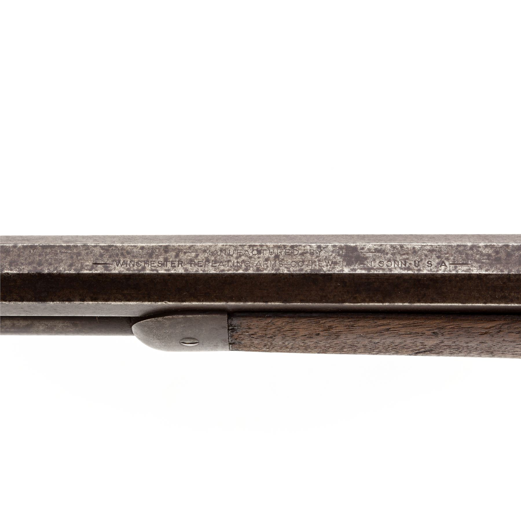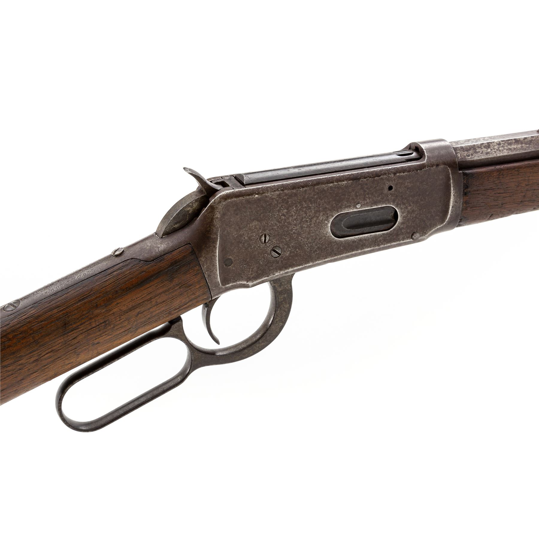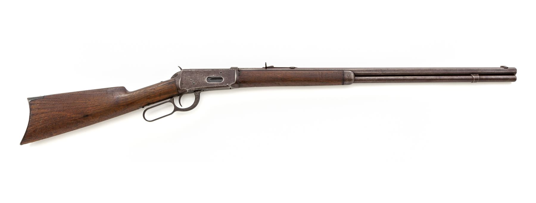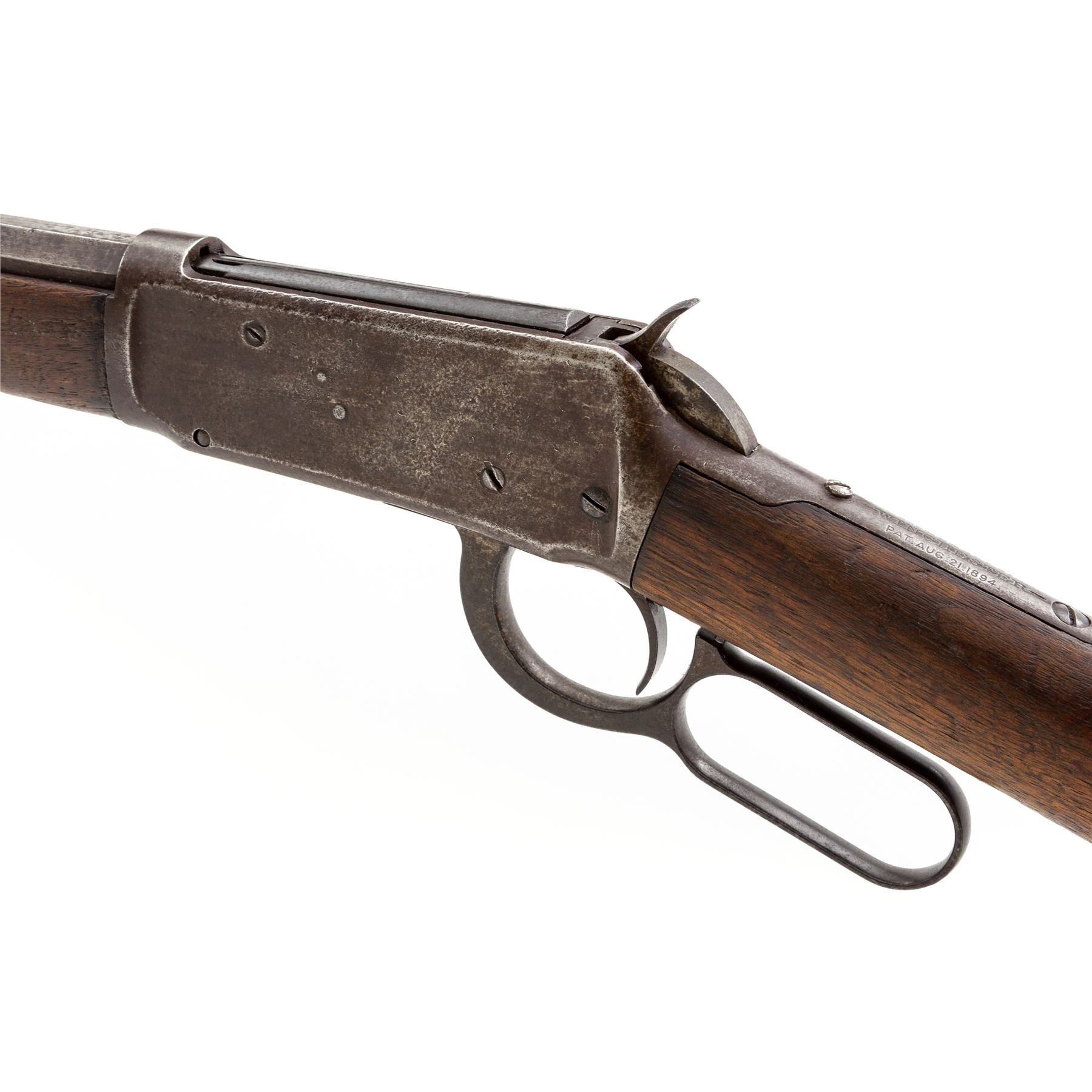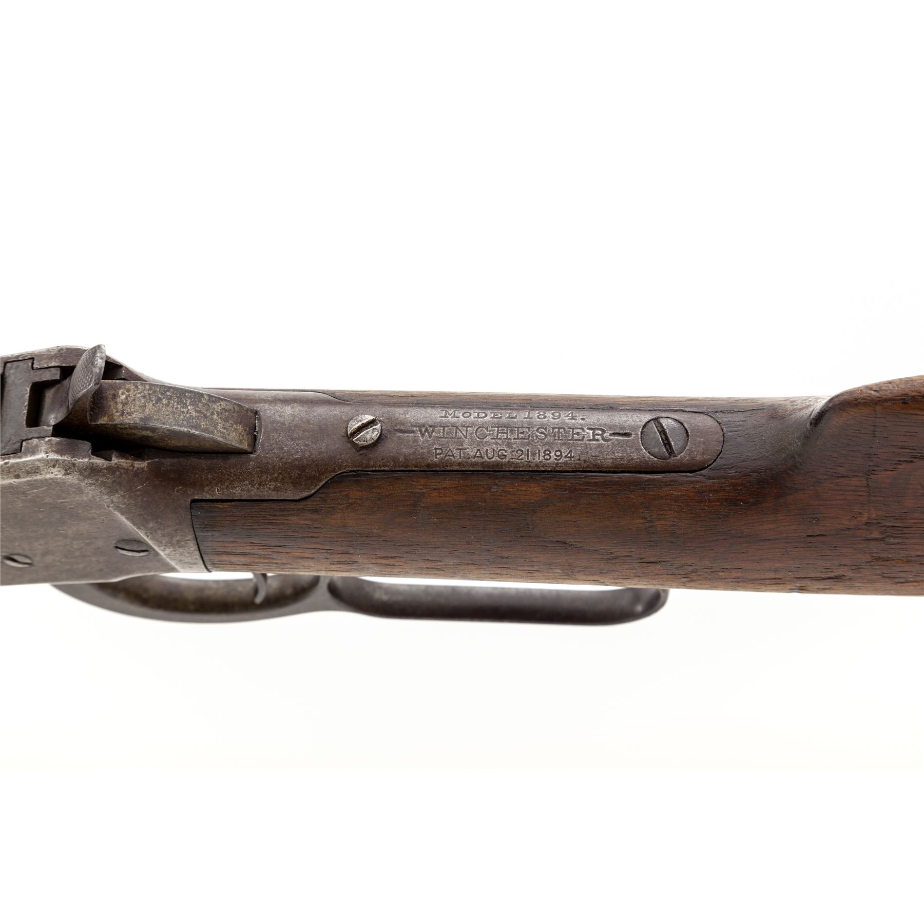Antique Winchester Model 1894 Lever Action Rifle, #2892, .32-40 CF cal., blued 26'' octagonal barrel, with dovetailed blade front and adjustable buckhorn rear sights marked with the maker's name and address in two lines on top flat, and ''32-40'' at breech; blued full-length under-barrel magazine tube; blued receiver is marked ''Model 1894''/-Winchester-/Pat. Aug. 21, 1894.'' on top tang; case hardened hammer, loop operating lever, and crescent buttplate; oil-stained walnut forestock and buttstock. Mfg'd 1894, first year of production. Condition is very good: the steel parts show a smooth gunmetal gray-brown tone with occasional darkening and discoloration. Stocks are sound with scattered roughness and use/handling marks. Action is smooth; bore is clean with distinct rifling. A John M. Browning design, the '94 was Winchester's first smokeless powder lever action rifle, and remains in production today. Est.: $600-$900. (Antique)
