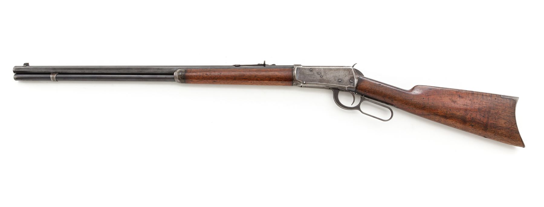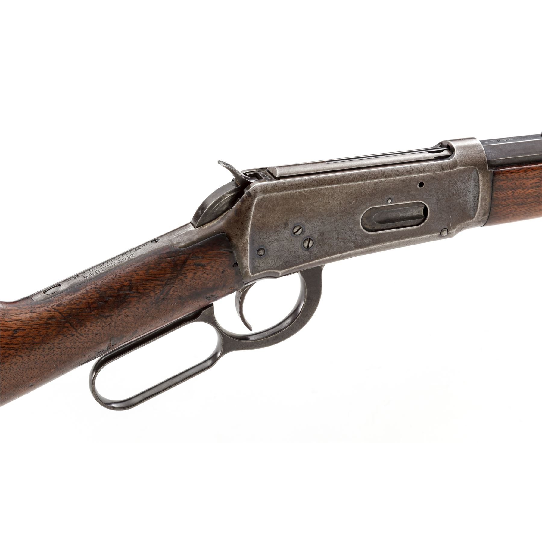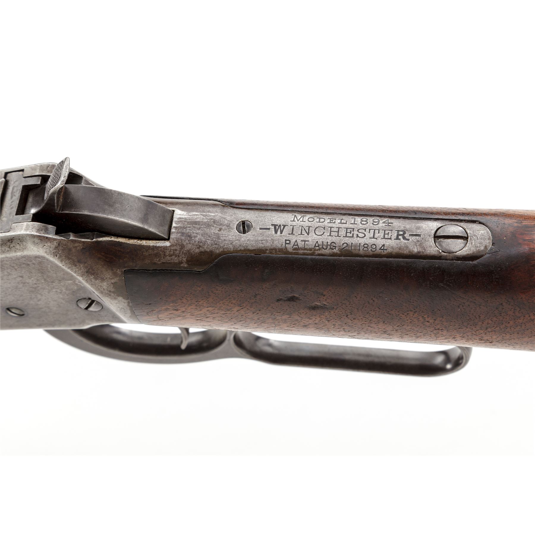 Winchester Model 1894 Lever Action Rifle, #202074, .30 WCF (.30-30 CF) cal., blued 26'' octagonal barrel, with dovetailed bead-blade front and adjustable buckhorn rear sights, is marked with maker's name, address, and 1894 patent date on top flat, and ''Nickel Steel Barrel/Especially for Smokeless Powder'' and ''30 W.C.F.'' on left angled flat ahead of breech; blued tubular magazine; blued frame is marked ''Model 1894/Winchester'' and 1894 patent date on upper tang; case hardened loop operating lever and hammer; varnished walnut stocks, forend with a steel nose cap, buttstock with a steel crescent buttplate. Mfg'd 1900. Condition is fine. Barrel and mag tube retain approx. 85% original blue; receiver with 10% blue to right side and otherwise with a smooth gunmetal patina; case hardened lever and hammer have mostly darkened/silvered out. Stocks are solid and smooth with light marks of age and use, nice grain and color, a hole drilled in belly (perhaps for a sling swivel), and a likely later coat of varnish. Action is strong and smooth; bore is bright with defined rifling. Est.: $700-$1,000. (C&R)