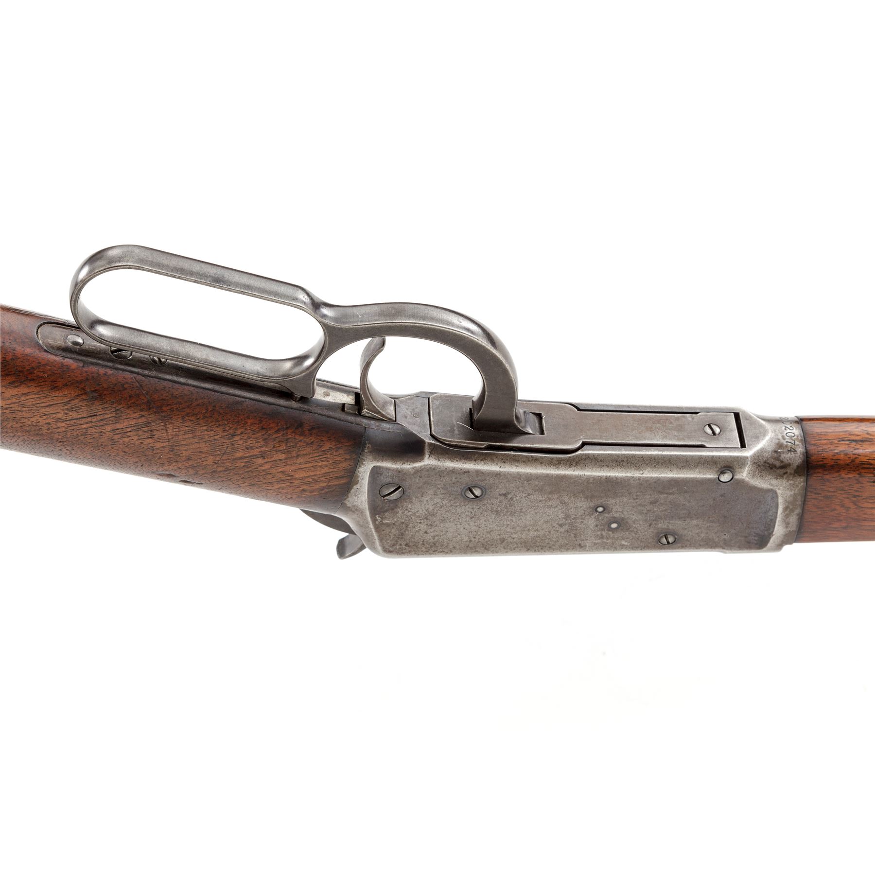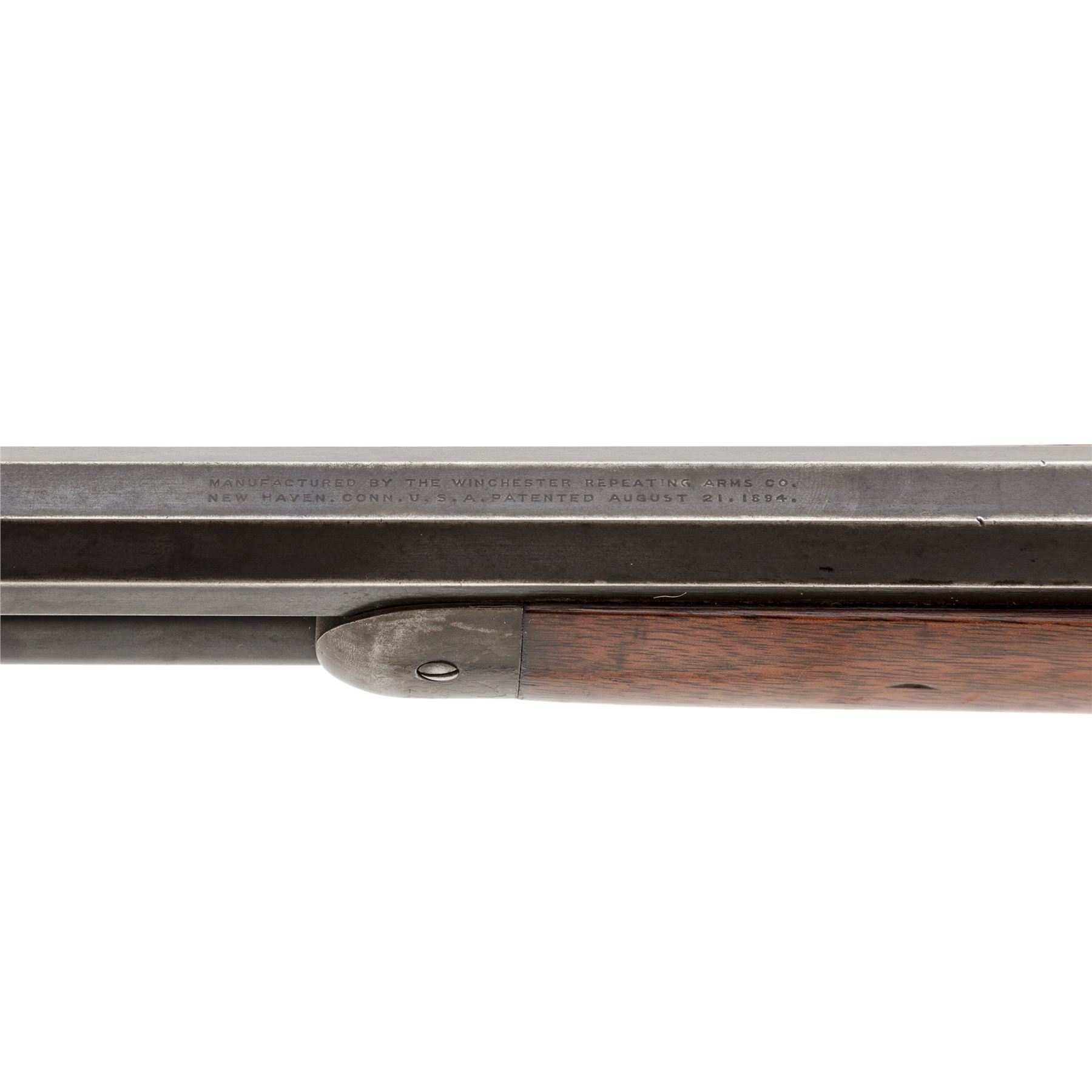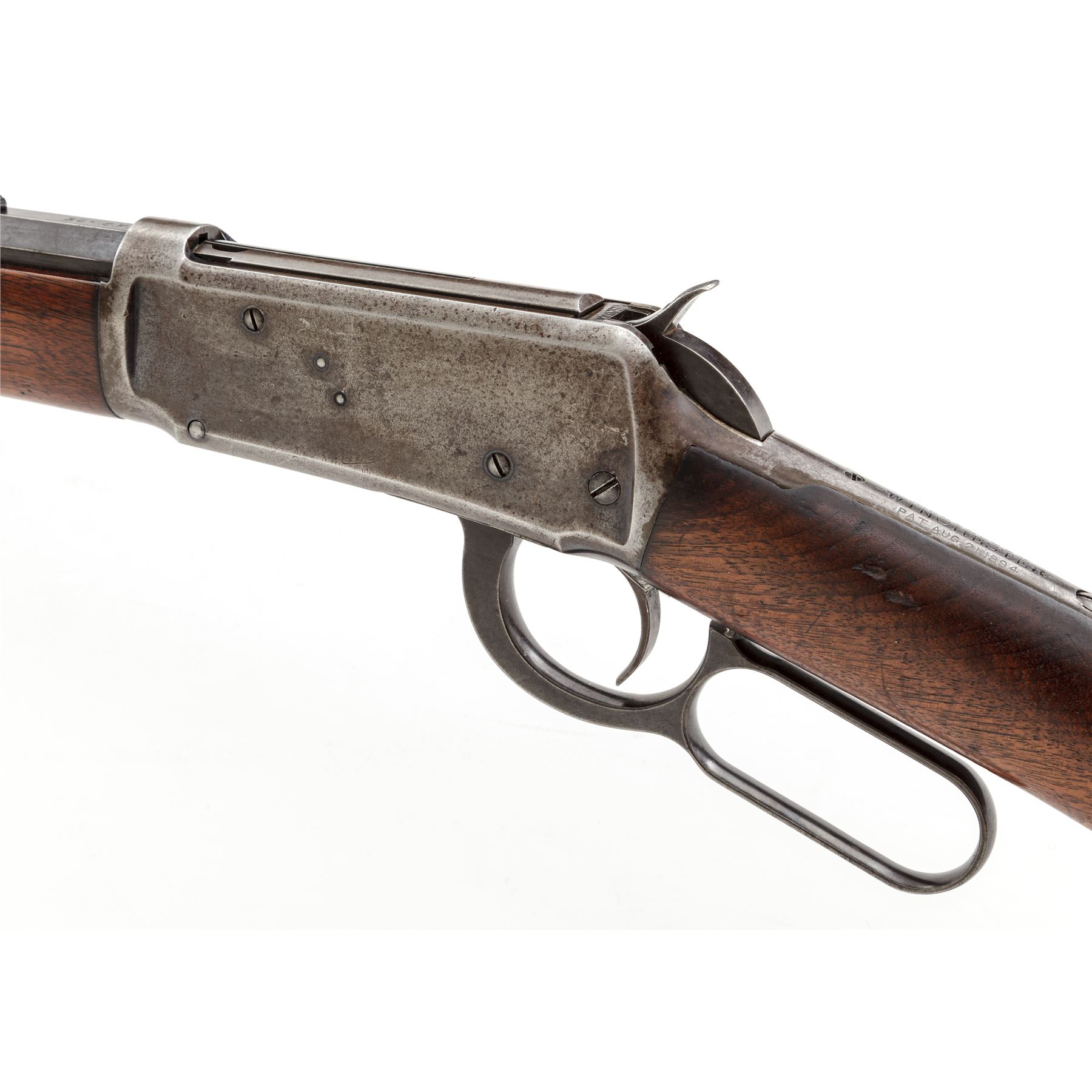 Winchester Model 1894 Lever Action Rifle, #202074, .30 WCF (.30-30 CF) cal., blued 26'' octagonal barrel, with dovetailed bead-blade front and adjustable buckhorn rear sights, is marked with maker's name, address, and 1894 patent date on top flat, and ''Nickel Steel Barrel/Especially for Smokeless Powder'' and ''30 W.C.F.'' on left angled flat ahead of breech; blued tubular magazine; blued frame is marked ''Model 1894/Winchester'' and 1894 patent date on upper tang; case hardened loop operating lever and hammer; varnished walnut stocks, forend with a steel nose cap, buttstock with a steel crescent buttplate. Mfg'd 1900. Condition is fine. Barrel and mag tube retain approx. 85% original blue; receiver with 10% blue to right side and otherwise with a smooth gunmetal patina; case hardened lever and hammer have mostly darkened/silvered out. Stocks are solid and smooth with light marks of age and use, nice grain and color, a hole drilled in belly (perhaps for a sling swivel), and a likely later coat of varnish. Action is strong and smooth; bore is bright with defined rifling. Est.: $700-$1,000. (C&R)