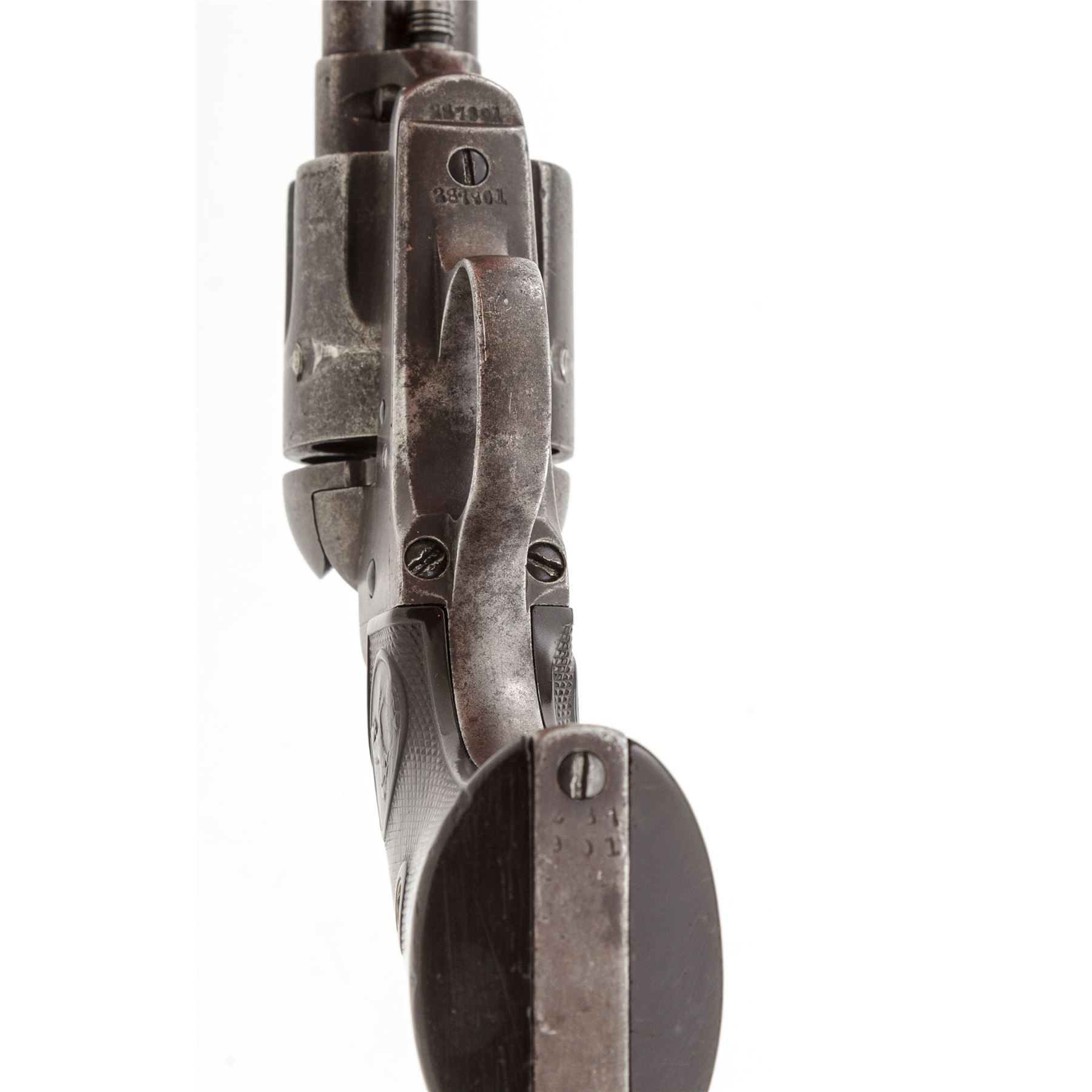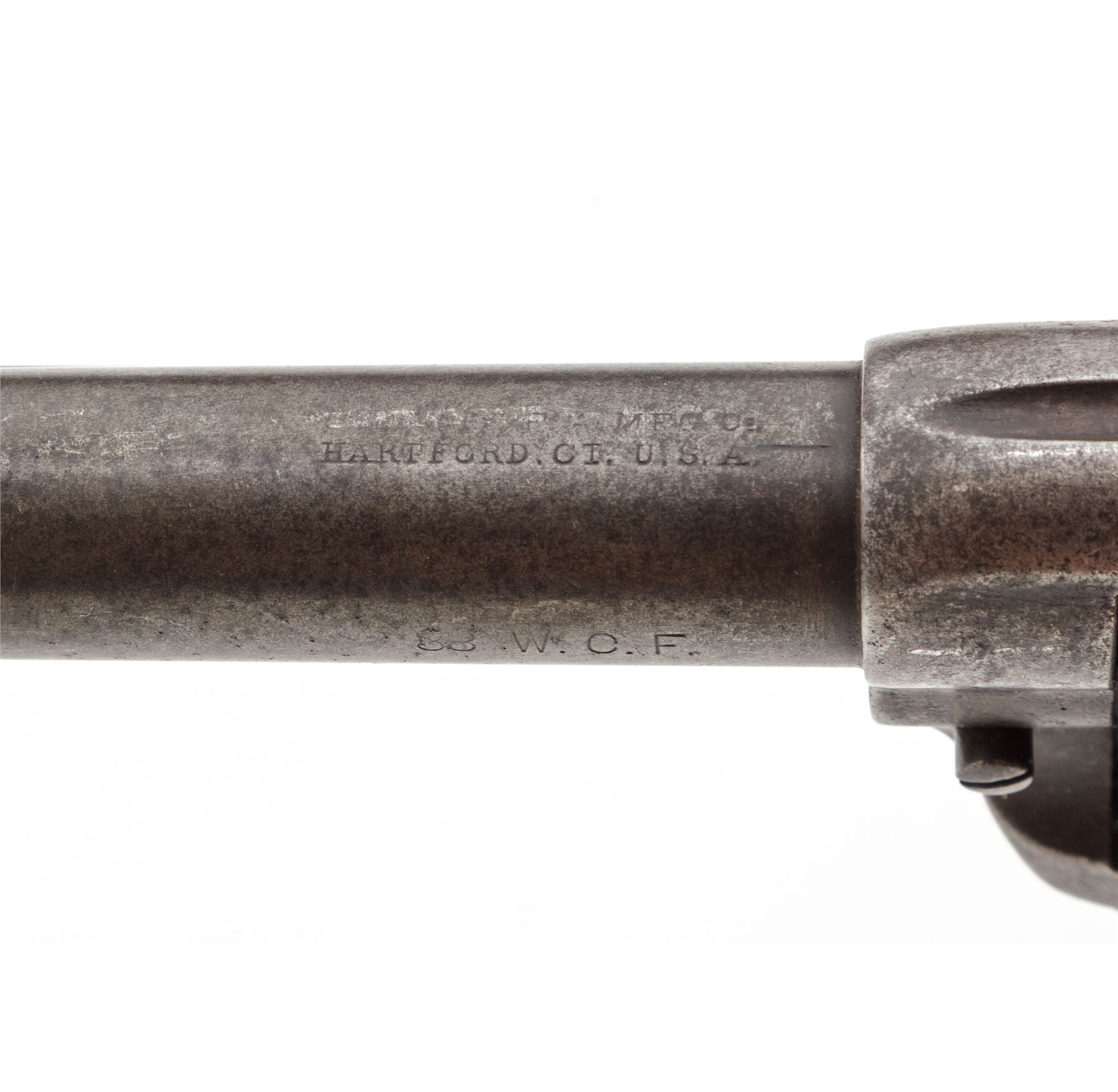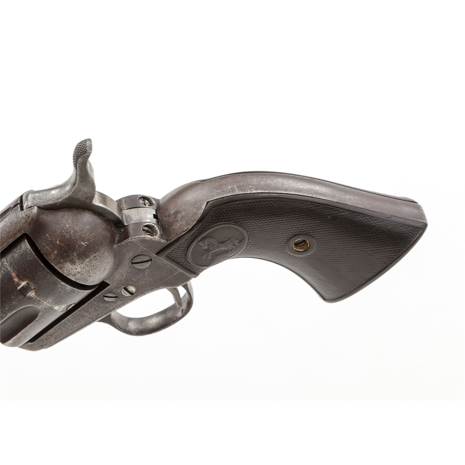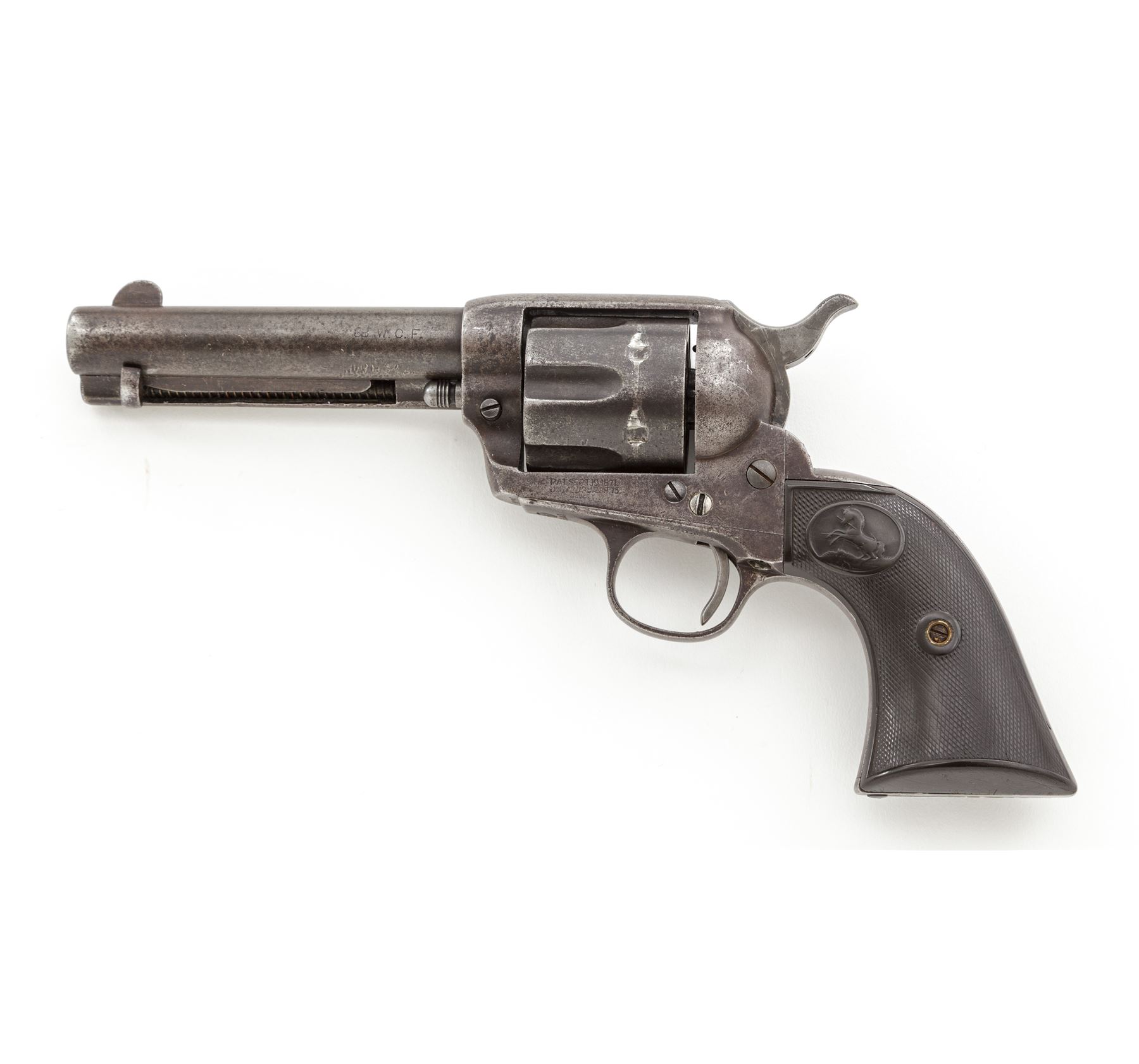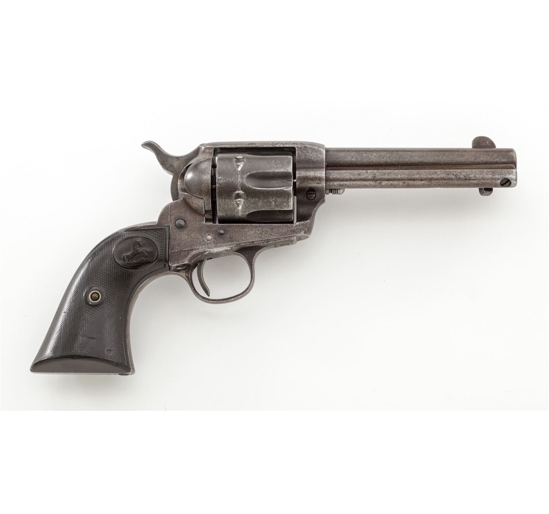 Colt Model 1873 Single Action Army Revolver, #287901, .38 WCF (.38-40) cal., 4.75'' barrel marked with the Colt name and address in two lines on top, and ''38 W.C.F.'' on left side; solid frame with the 1871-72-75 patent dates in two lines on left side; loading gate batch-marked ''8023''; fluted 6-shot round cylinder; steel gripstraps (''VP'' appears on left-side triggerguard bow); checkered two-piece hard rubber grips with the Rampant Colt in a raised oval panel at top. Mfg'd 1906, originally in blued finish with case hardened frame and hammer. Condition is very good. Metal surfaces show an overall gunmetal gray with occasional light etching; silvering case colors to hammer. Grips with worn checkering and relief details, use marks, but fit well. Markings are legible; visible numbers match; action is smooth and crisp; bore is clean with defined rifling. Est.: $800-$1,200. (C&R/PPT)