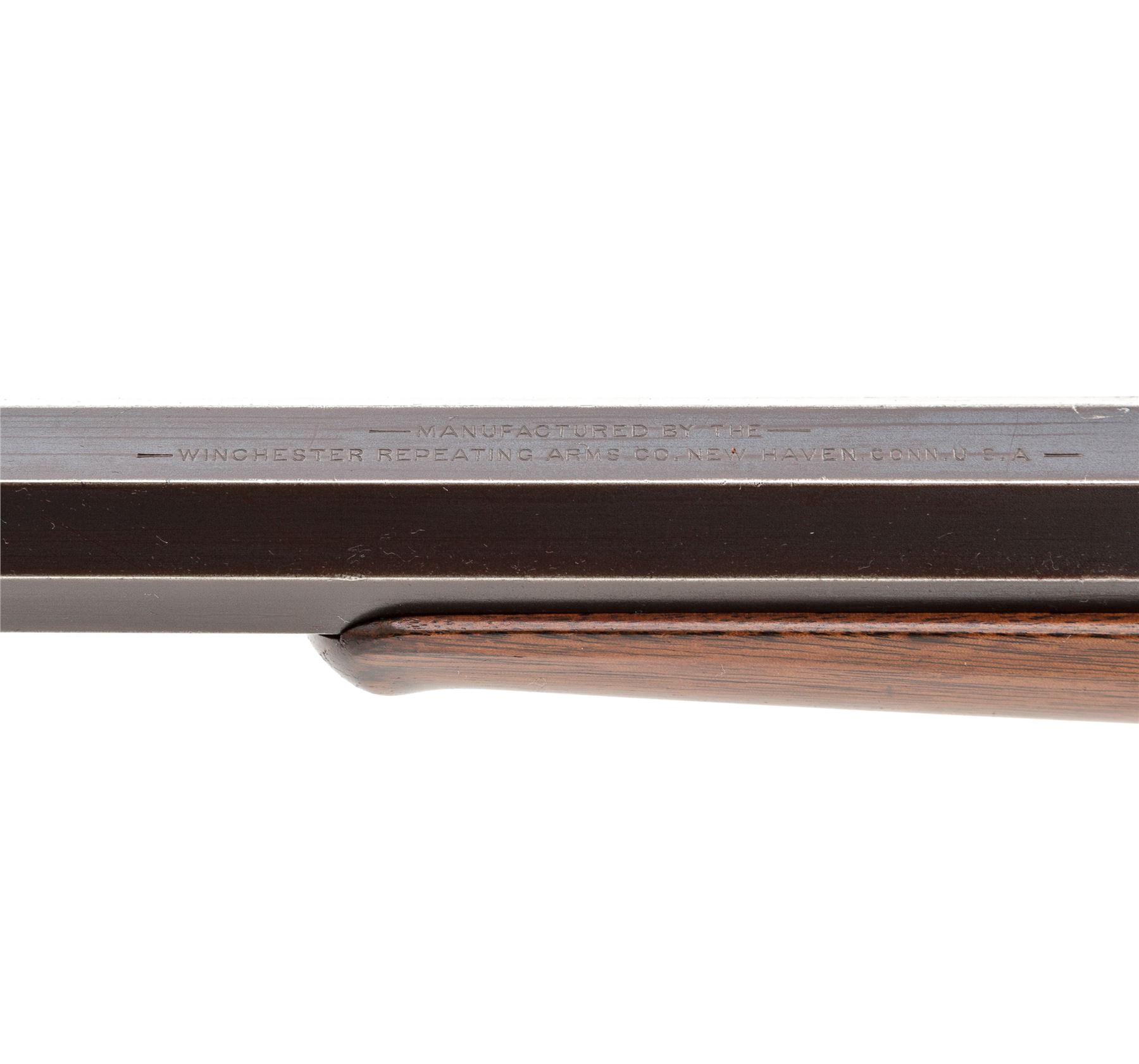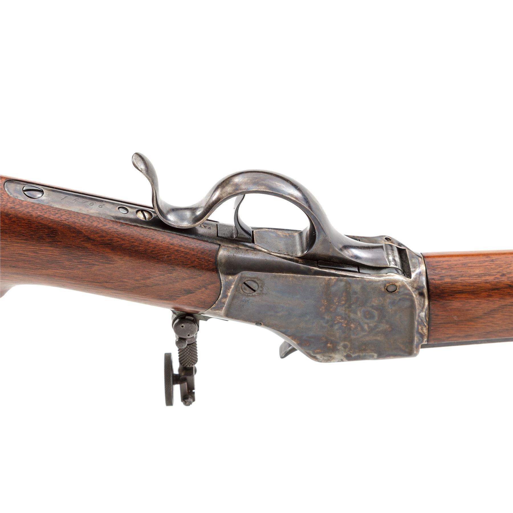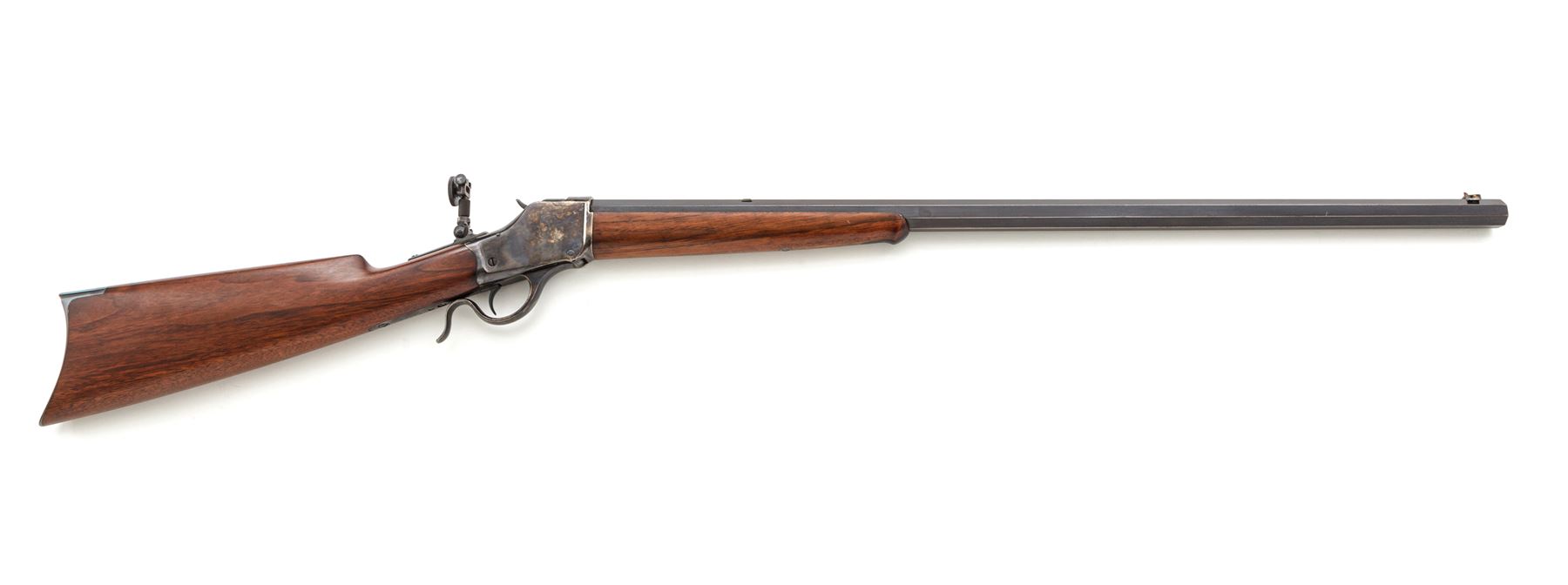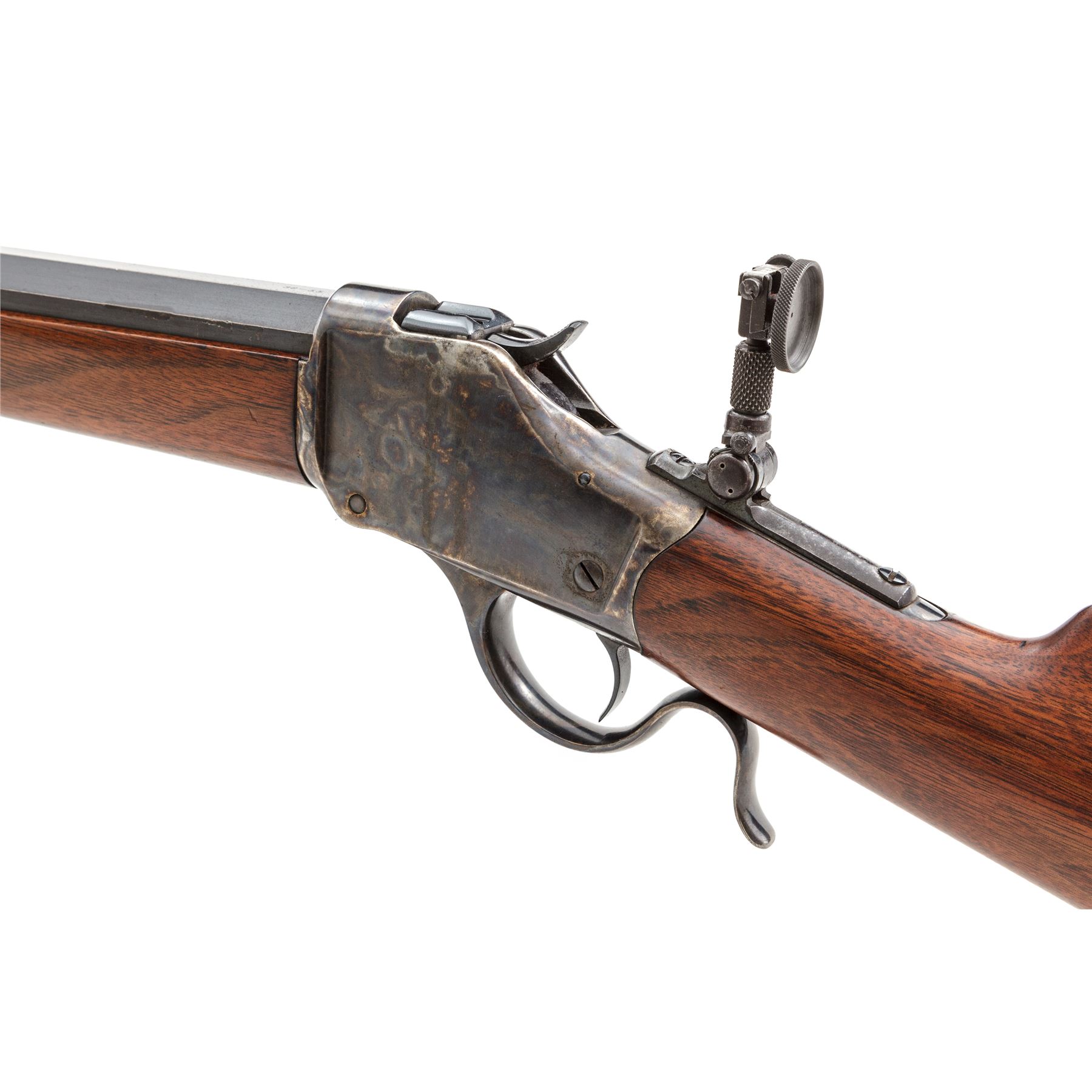 Antique Winchester Model 1885 Hi-Wall Single Shot Lever Action Rifle, #29491, .38-55 CF cal., blued 30'' medium-weight octagonal barrel having dovetailed Beach front, plugged dovetail rear, and adjustable peep tang sights marked on top flat with the Winchester name and New Haven address in two lines and ''38-55'' at breech; case hardened receiver is marked with the 1879 patent date and serial number on lower tang; case hardened operating lever; varnished walnut forend having a buffalo horn inlay on its Schnabel tip, and buttstock with blued crescent buttplate. Mfg'd 1888. Condition is fine as partially refinished: the barrel retains 95% smooth original blue, the receiver, hammer, lever and buttplate retain all of their respective later finishes. Stocks with lovely straight grain and color and a later satin finish. Action is smooth; bore is brilliant with deep rifling. Est.: $1,000-$1,500. (Antique)