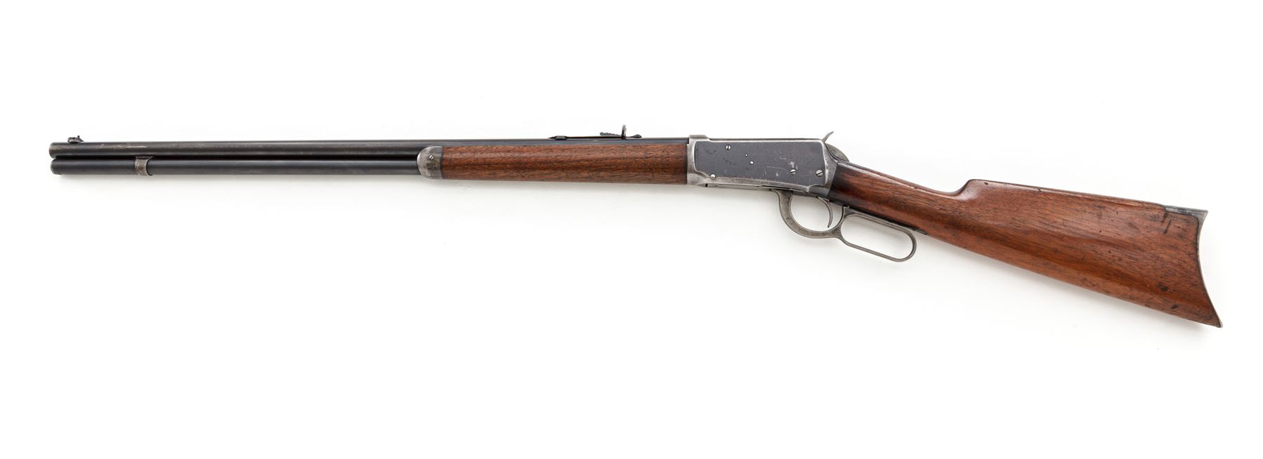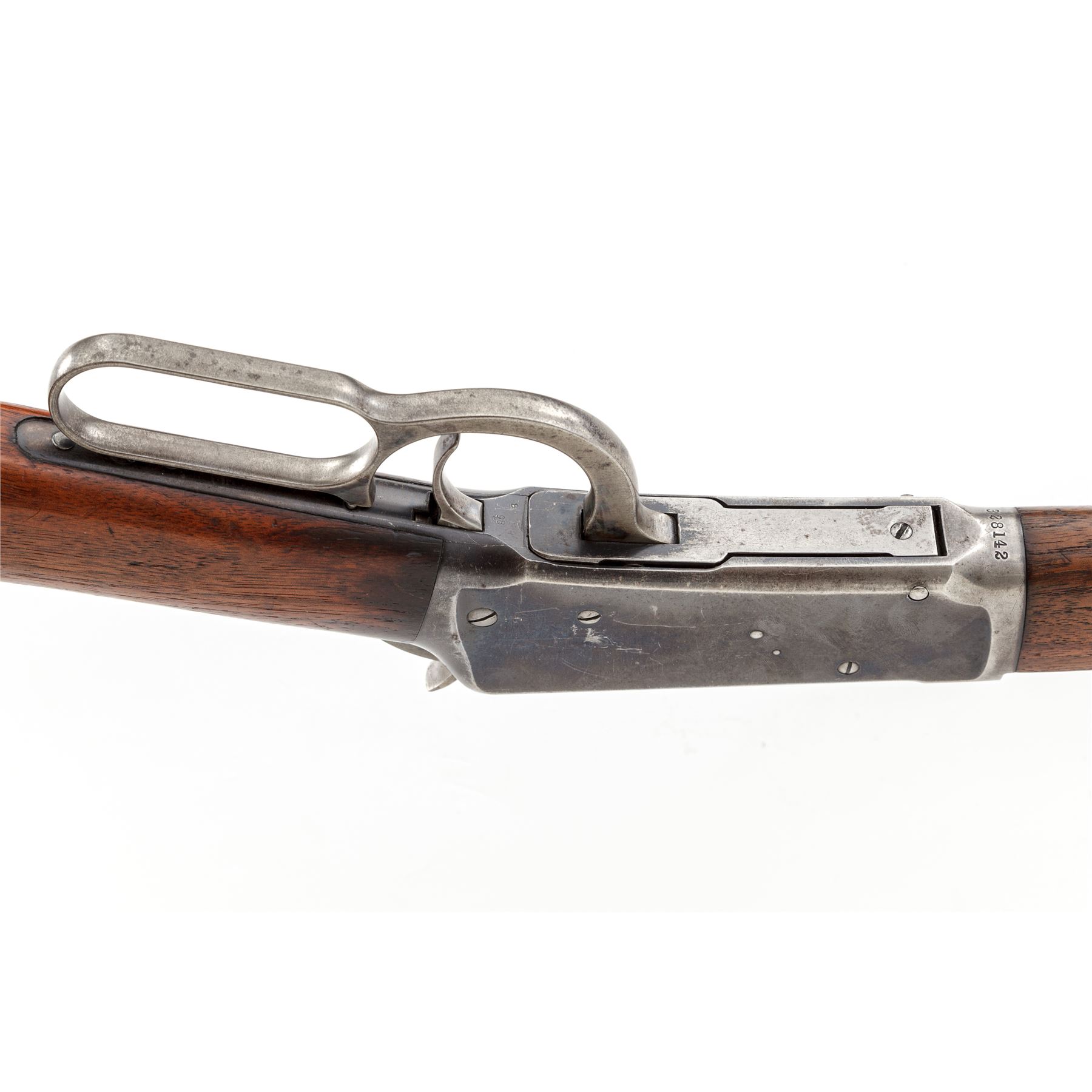 Winchester Model 1894 Lever Action Rifle, #328142, .32-40 CF cal., blued 26'' round barrel, with dovetailed folding Beach-type front and adjustable buckhorn rear sight, is marked with maker's name, address, and 1894 patent date on top, and ''32-40'' at breech; blued tubular magazine; blued frame is marked ''Model 1894/Winchester/Trade Mark'' on upper tang; case hardened loop operating lever and hammer; oil-stained walnut stocks, forend with a steel nose cap, buttstock with a steel crescent buttplate. Mfg'd 1906. Condition is fine+. Barrel and mag tube retain approx. 80% original blue (with a 1/2'' patch of roughness behind front sight); receiver with 60% blue, nose cap and buttplate with a smooth gunmetal patina; case hardened lever and hammer show mottled colors. Stocks are solid and smooth with light marks of age and use, nice grain and color, and likely a later coat of varnish. Action is strong and smooth; bore is clean with defined rifling. Est.: $600-$900. (C&R)