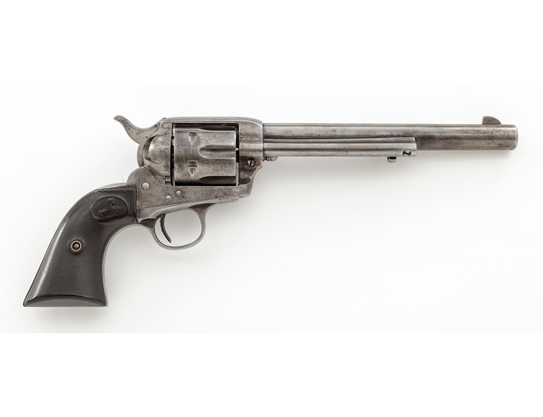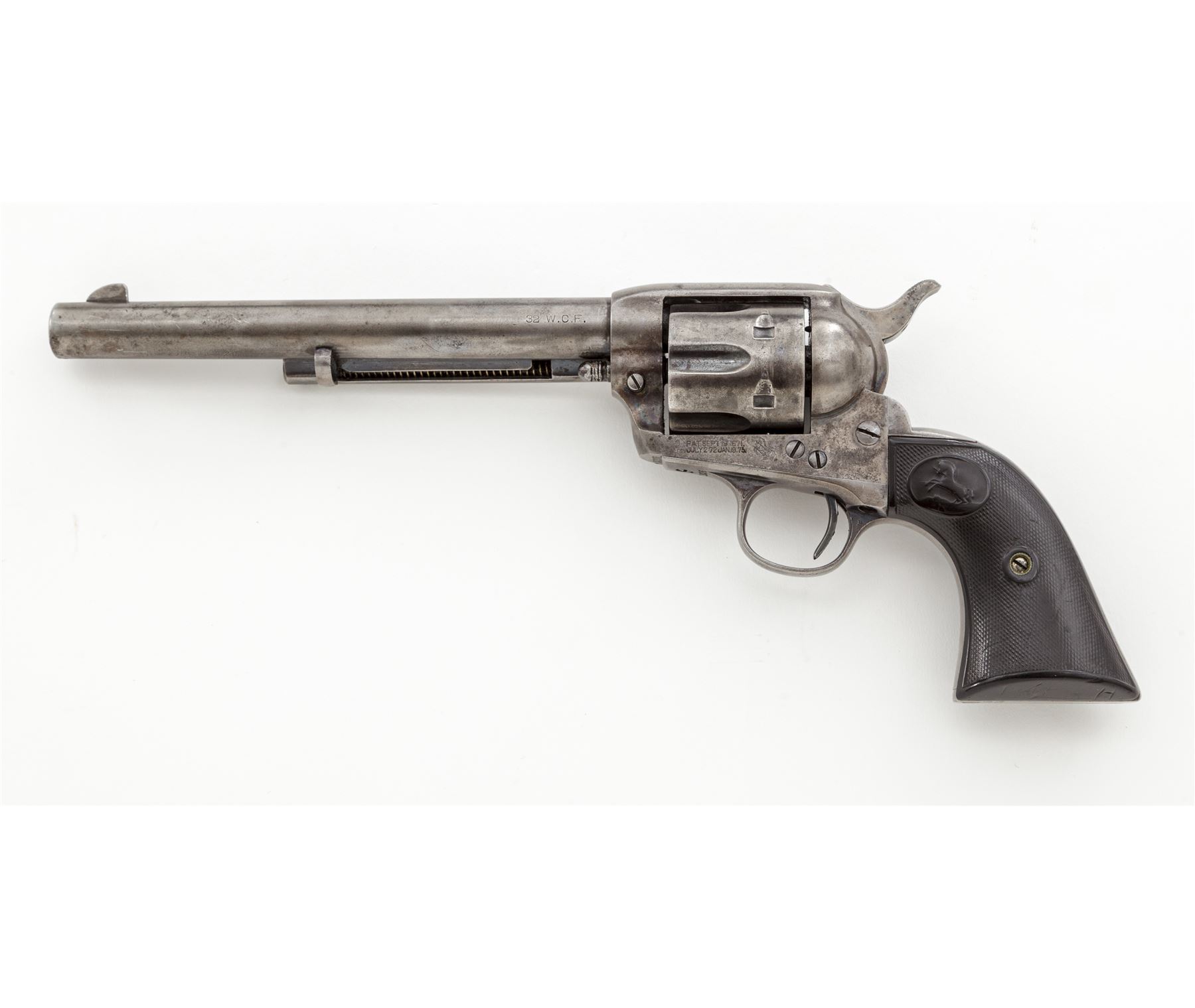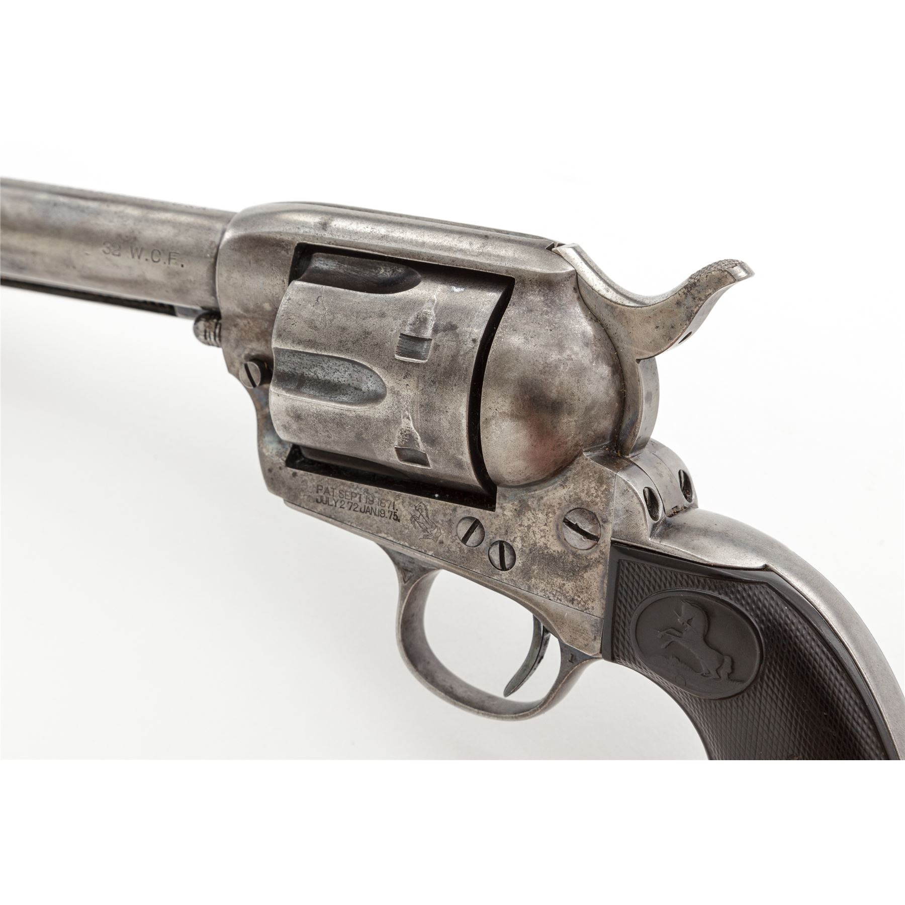Colt Model 1873 Single Action Army Revolver, #331936, .32 WCF (.32-20) cal., 7.5'' round barrel is marked with the Colt name and address in 1 line on top, and ''32 W.C.F.'' on left side; solid frame with the 1871-72-75 patent dates in 2 lines and a ''Rampant Colt'' logo on left side; loading gate batch-marked ''199''; fluted 6-shot round cylinder; steel grip straps (''VP'' and ''1'' appear on left-side triggerguard bows); checkered two-piece hard rubber grips with the Rampant Colt in a raised oval panel at top. Mfg'd 1915, originally in blued finish with case hardened frame and hammer. Condition is very good. Metal surfaces show an overall smooth gunmetal gray with traces of blue in protected areas; silvering case colors to frame and hammer; bright fire blue on trigger. Grips with worn checkering and relief details, fit well and are without damage. Markings are sharp; visible numbers match; action is smooth and crisp; bore is mostly clean with defined rifling. Est.: $900-$1,200. (C&R/PPT)