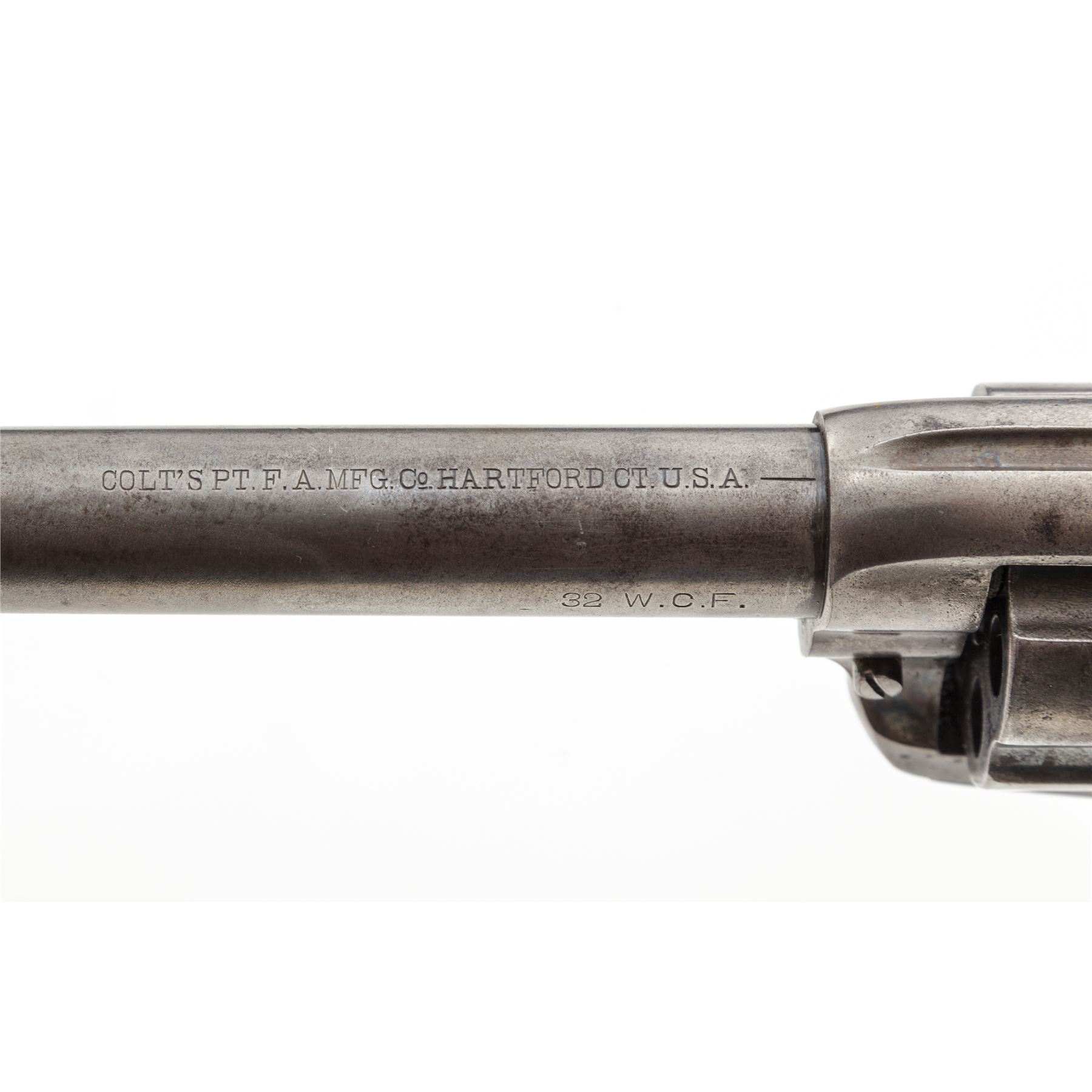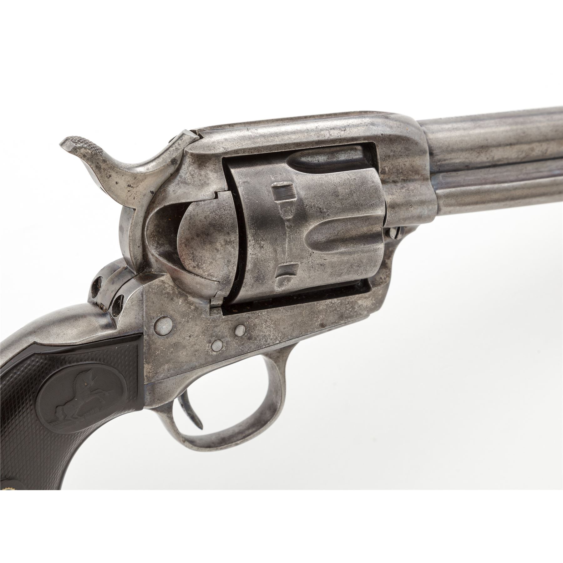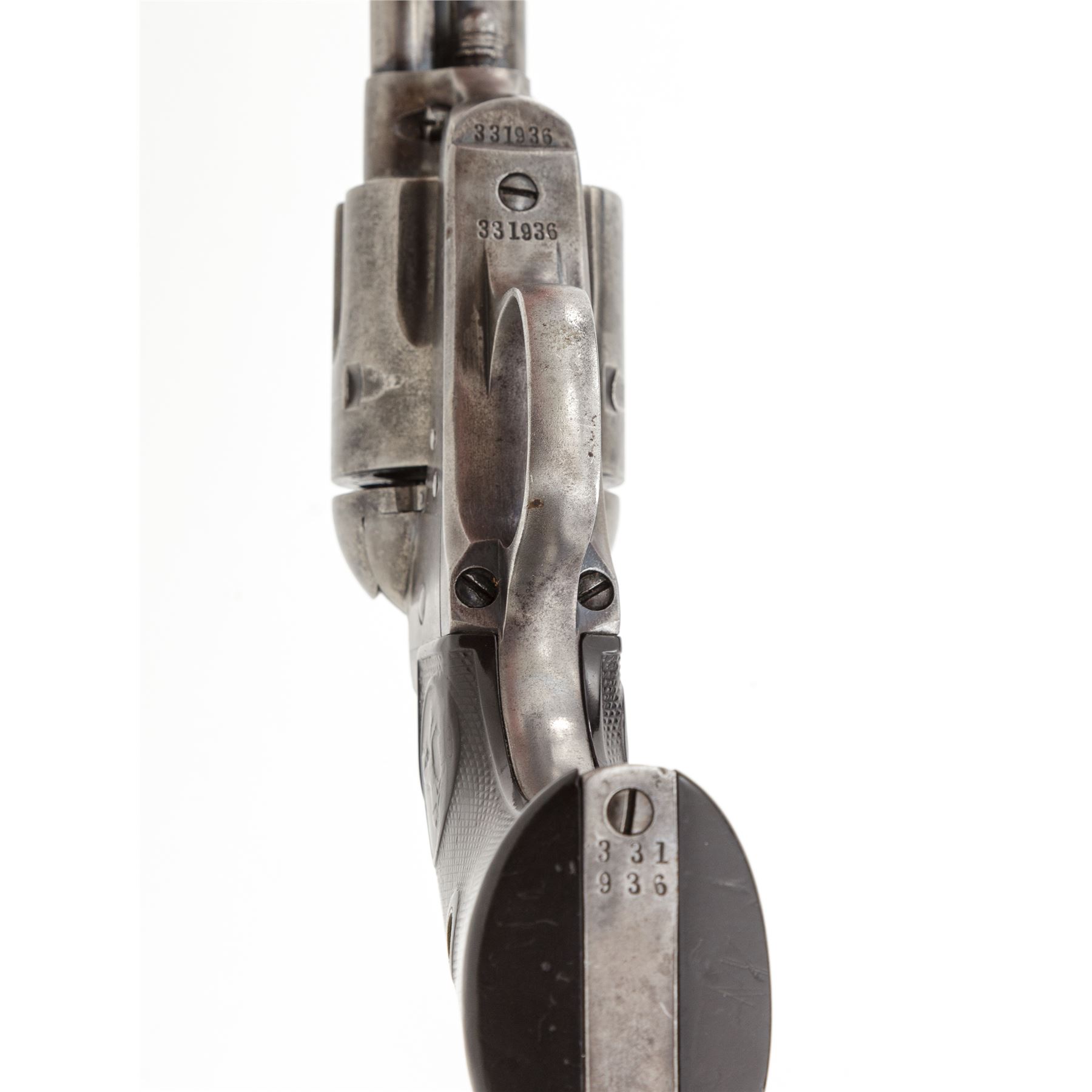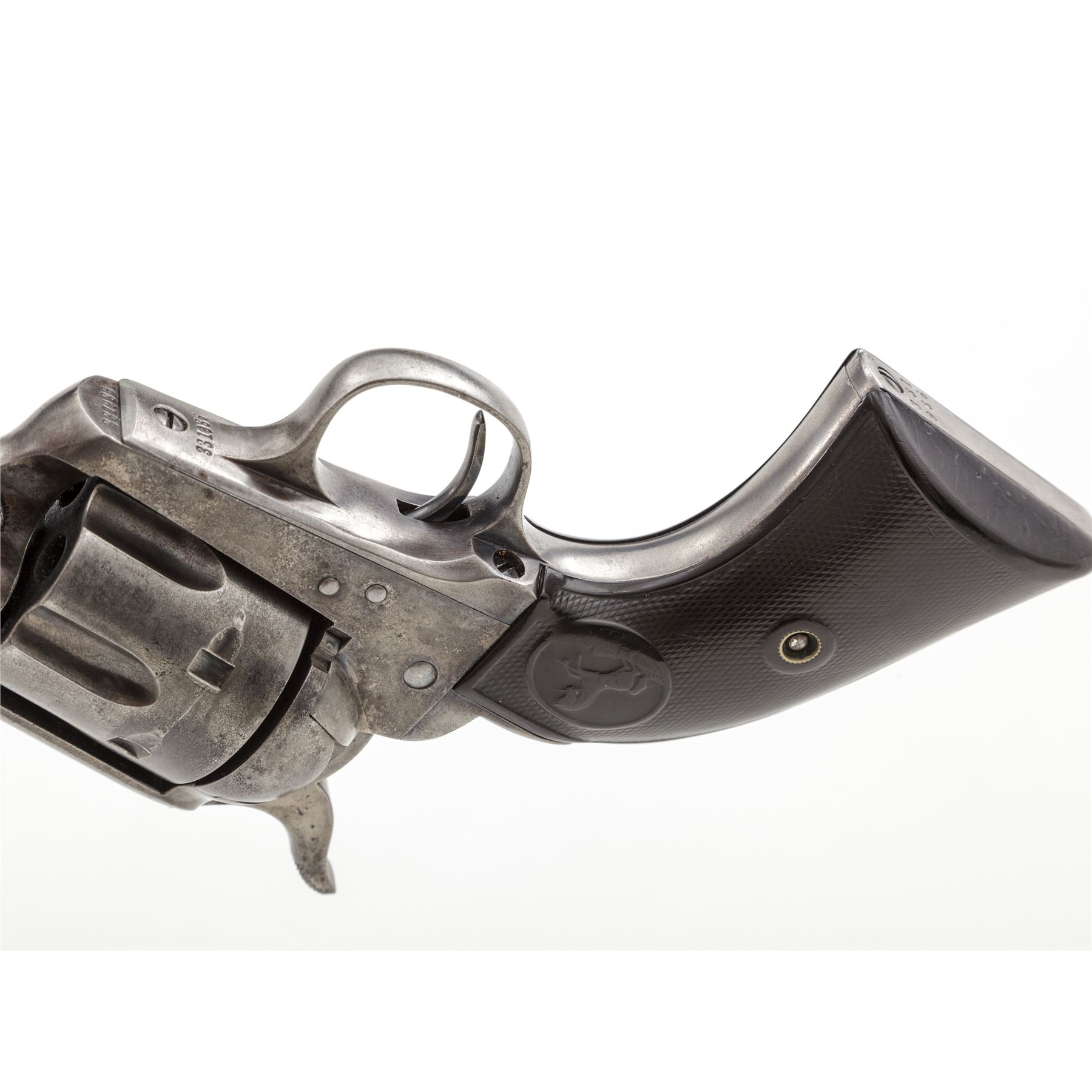 Colt Model 1873 Single Action Army Revolver, #331936, .32 WCF (.32-20) cal., 7.5'' round barrel is marked with the Colt name and address in 1 line on top, and ''32 W.C.F.'' on left side; solid frame with the 1871-72-75 patent dates in 2 lines and a ''Rampant Colt'' logo on left side; loading gate batch-marked ''199''; fluted 6-shot round cylinder; steel grip straps (''VP'' and ''1'' appear on left-side triggerguard bows); checkered two-piece hard rubber grips with the Rampant Colt in a raised oval panel at top. Mfg'd 1915, originally in blued finish with case hardened frame and hammer. Condition is very good. Metal surfaces show an overall smooth gunmetal gray with traces of blue in protected areas; silvering case colors to frame and hammer; bright fire blue on trigger. Grips with worn checkering and relief details, fit well and are without damage. Markings are sharp; visible numbers match; action is smooth and crisp; bore is mostly clean with defined rifling. Est.: $900-$1,200. (C&R/PPT)