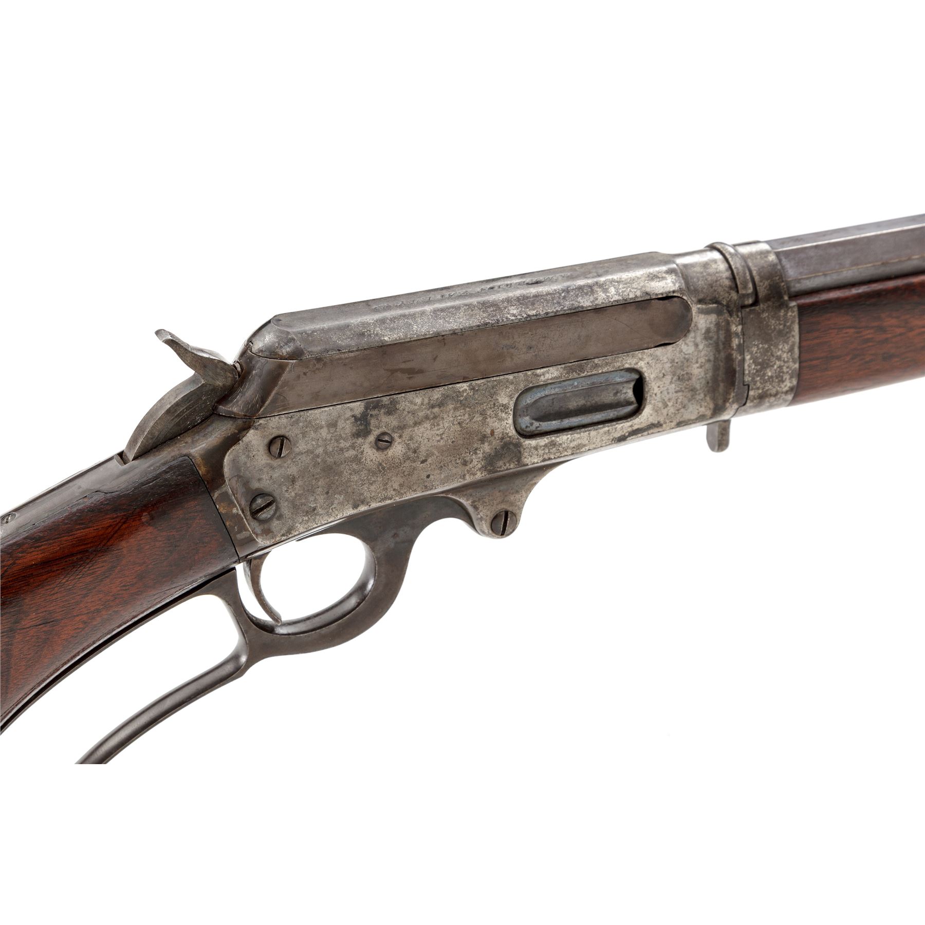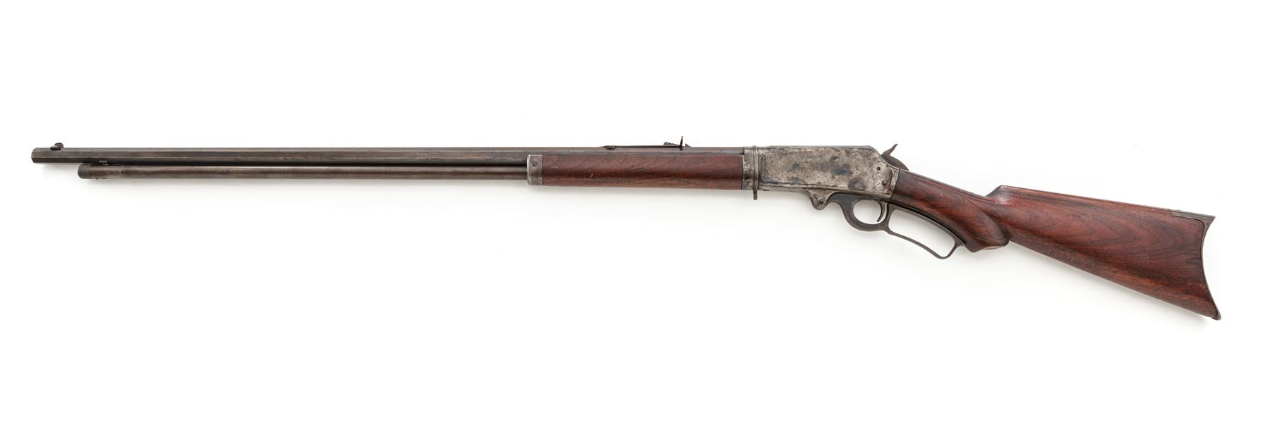 Antique Marlin Model 1893 Takedown Lever Action Rifle, #131052, .38-55 CF cal., blued 32'' octagonal barrel, with buckhorn style open sights, marked with maker's name, address, and 1887-88-93 patent dates in two lines on top flat, and ''38-55'' at breech; blued tubular cartridge magazine; case hardened receiver with sliding bolt is marked ''Marlin Safety'' on top, ''Model/1893'' on upper tang and serial number at lower front; loop operating lever; varnished walnut forearm with steel nose cap, matching pistol-grip buttstock with steel crescent buttplate. Mfg'd 1895. Condition is very good. Barrel and mag tube retain approx. 25% original blue (the rest blending into smooth brown) with sharp edges and lettering; receiver, hammer, lever and buttplate retain muted case colors but are mostly silvered out. Stocks are sound and smooth showing light marks of age and use, very worn checkering at pistol grip (with perhaps some re-shaping at belly and toe of buttstock), and a later coat of varnish. Action is smooth; bore is brilliant with deep rifling. The Model 1893 was the first Marlin rifle chambered for the then-new smokeless powder cartridges. Est.: $500-$750. (Antique)